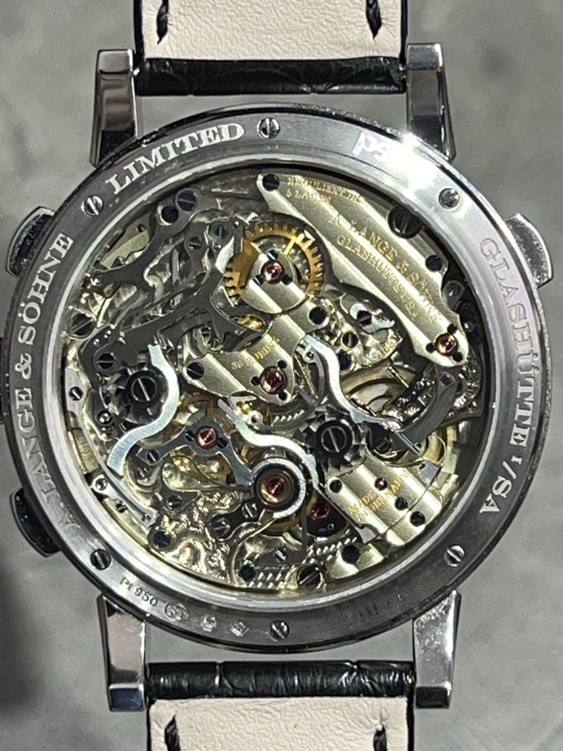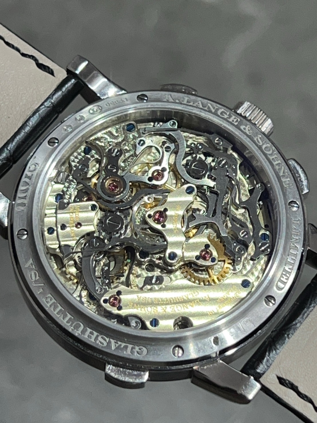 ムーブメントは自社製のL101.2で裏蓋から複雑な切替えプロセスを堪能できる装飾となっております。