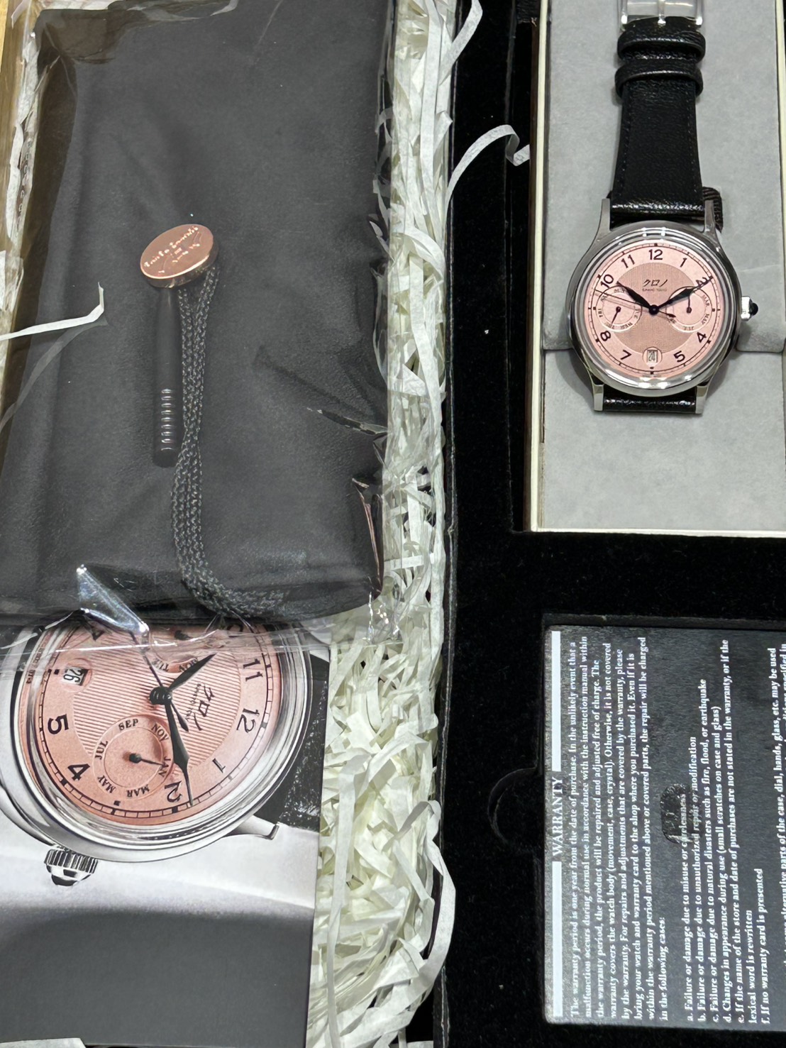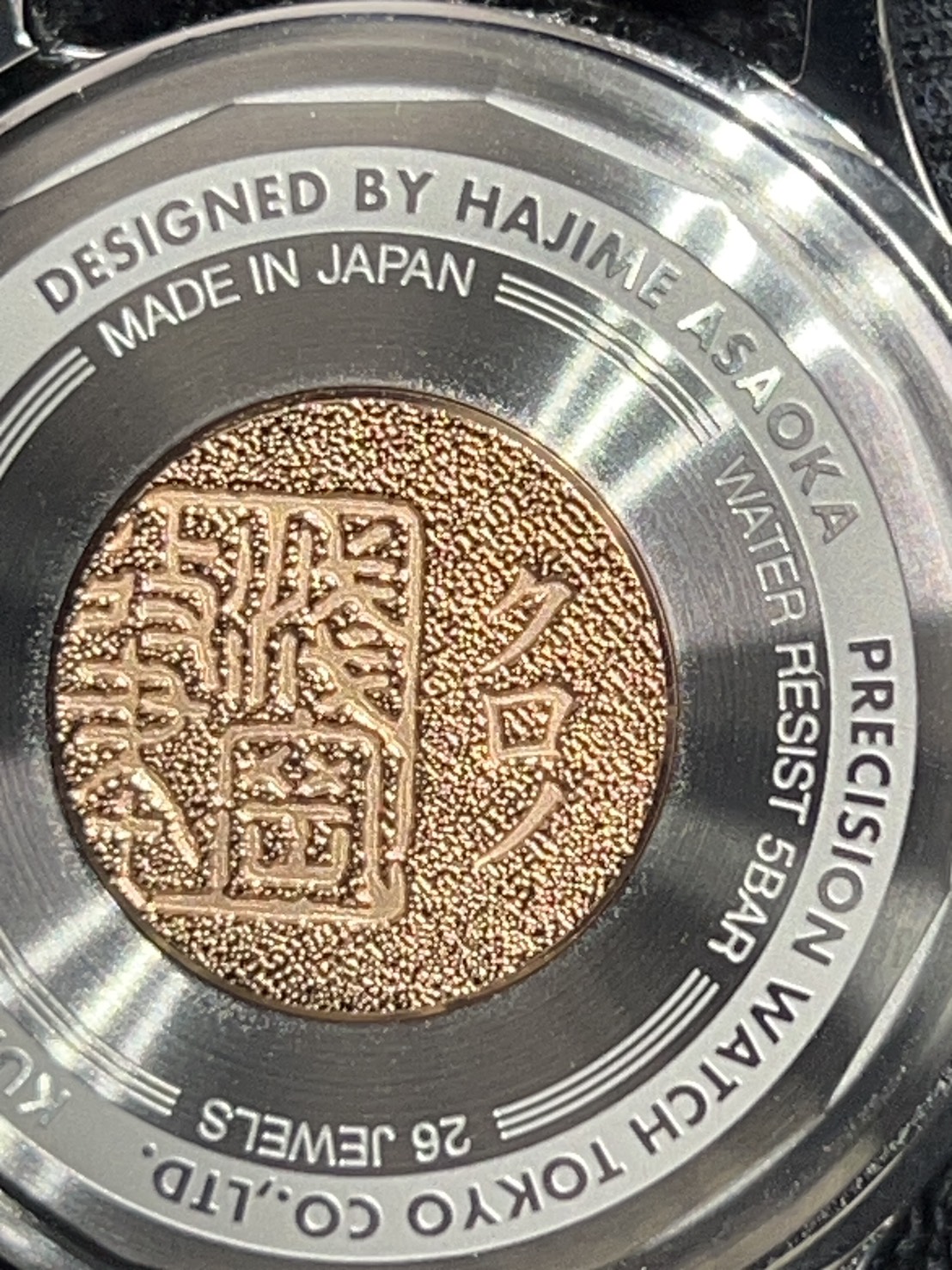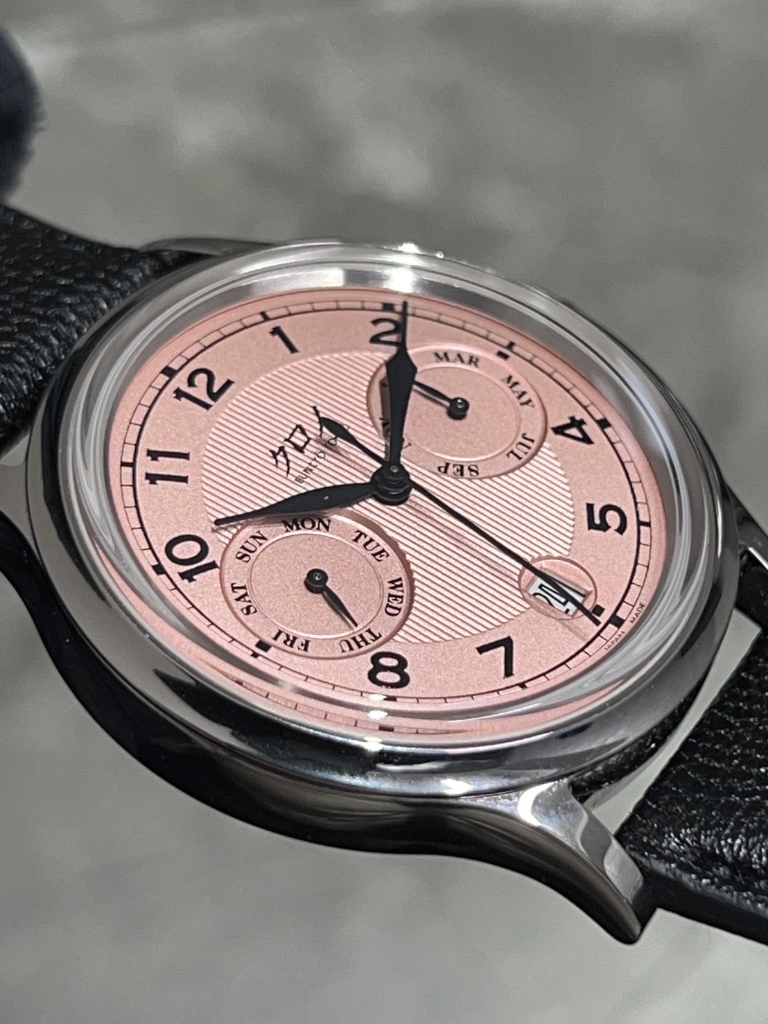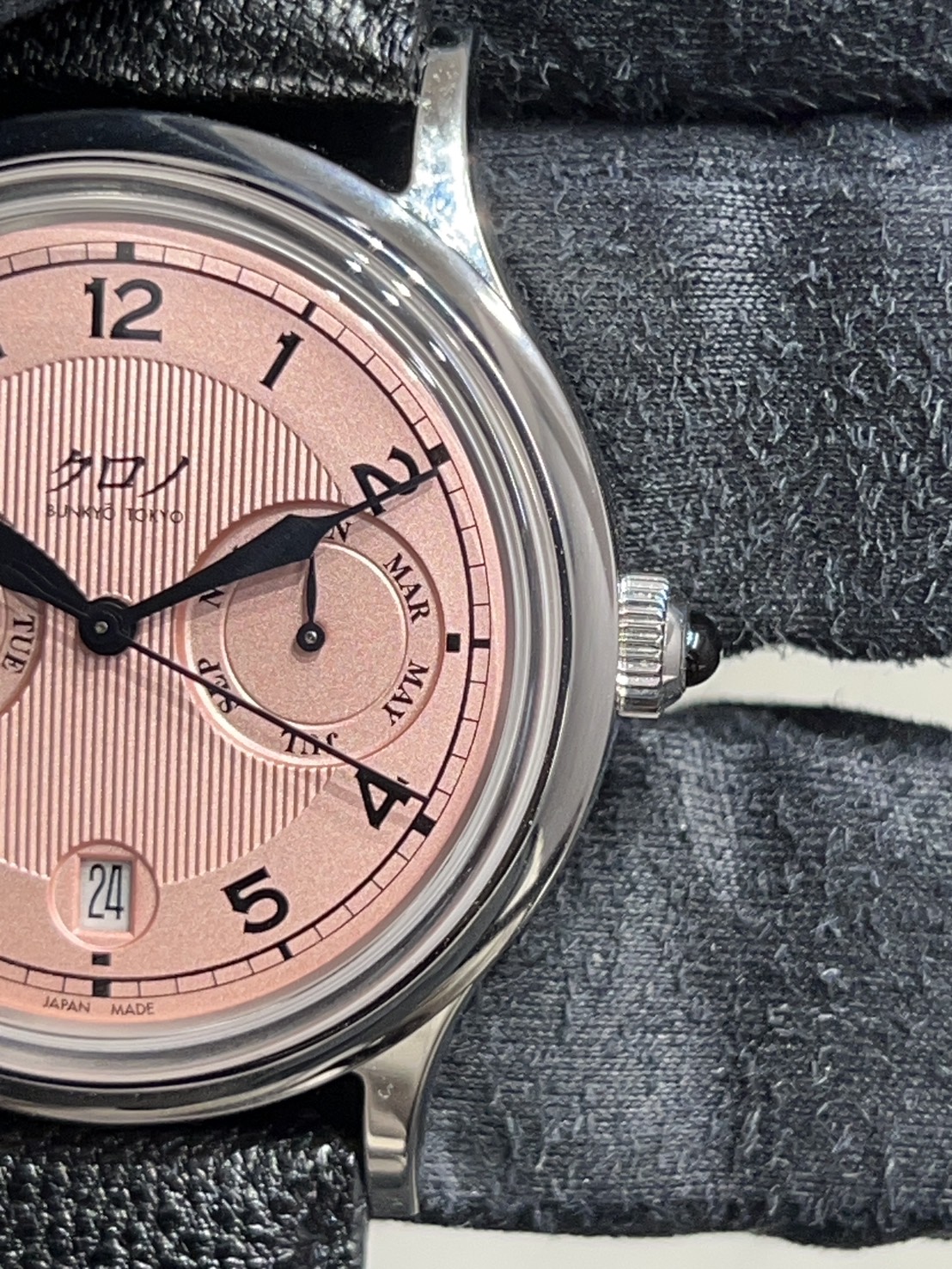 文字盤のサーモンは浅岡氏が公園で秋から冬への移り変わりを見た光景を文字盤に反映されており、ブラックの針とインデックスで視認性にも長けております。