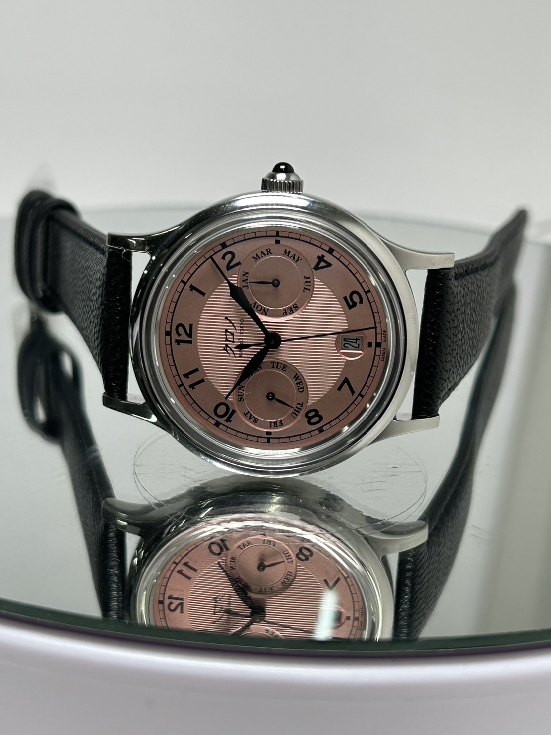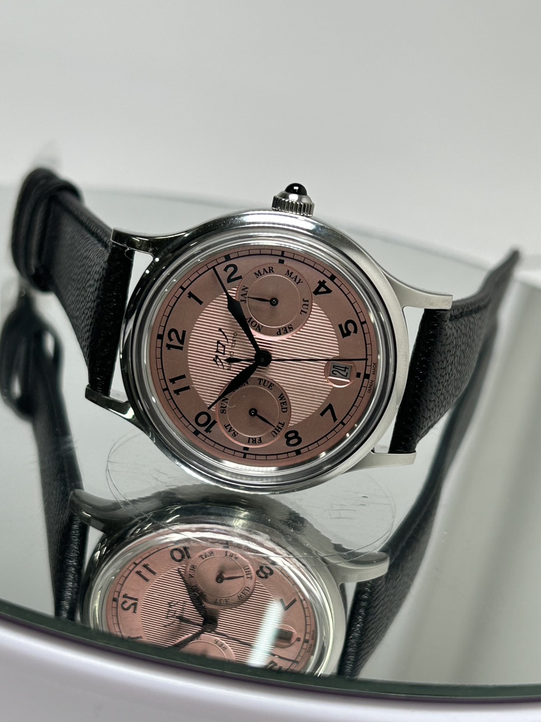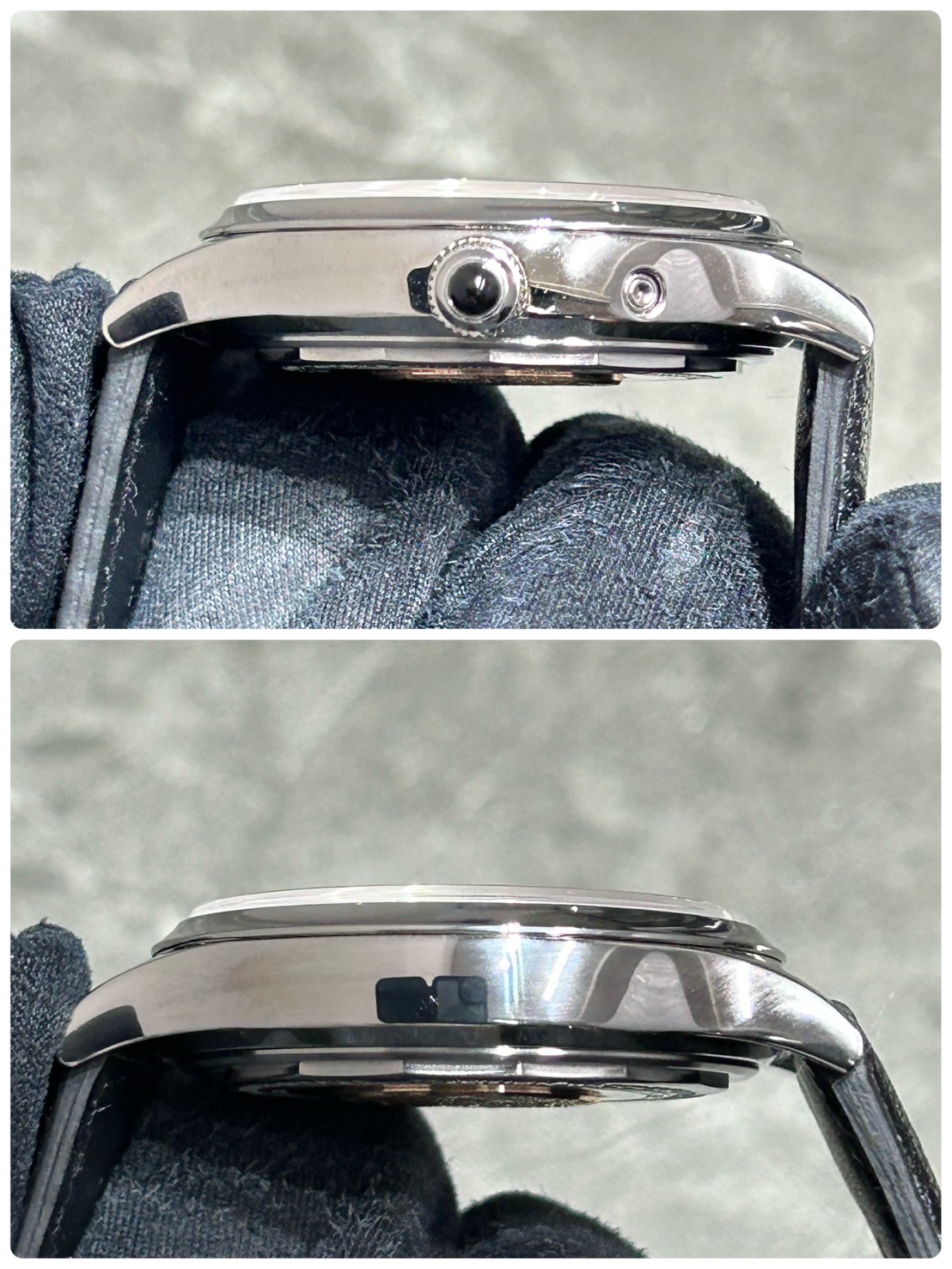 ケース径38㎜ 厚さ11.5㎜のコンパクトなケースにトリプルカレンダー機構を搭載したハイスペックモデルになりますが、袖口への収まりが良く日本人にも扱い安いサイズ感になっております。