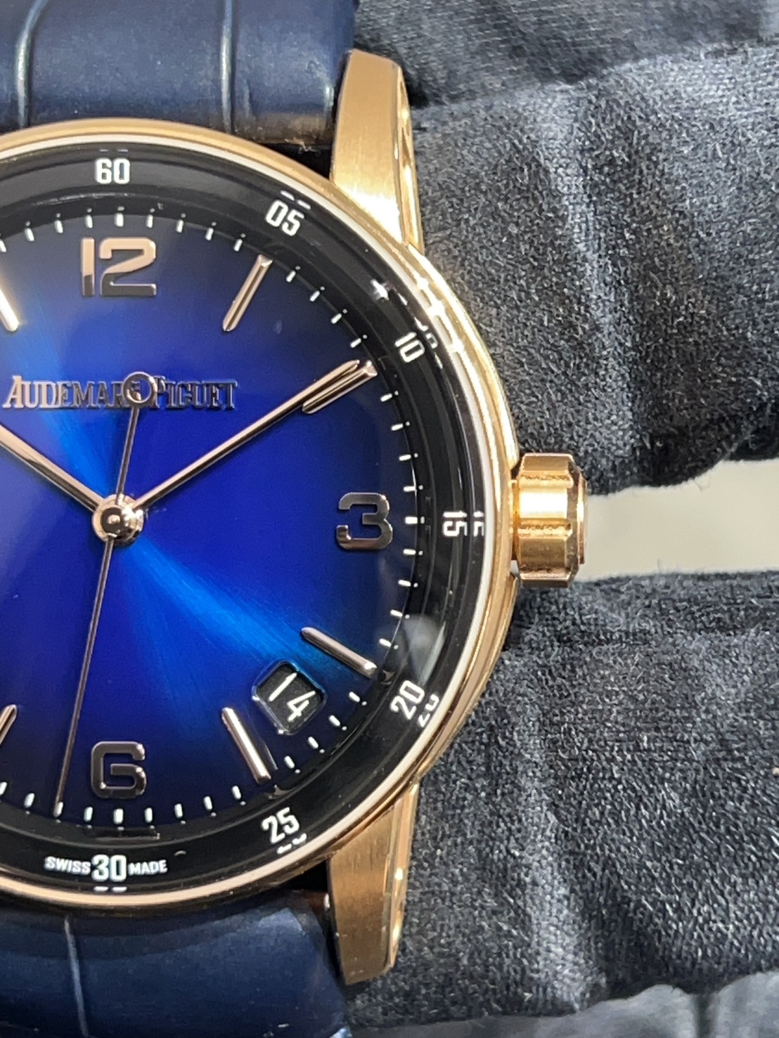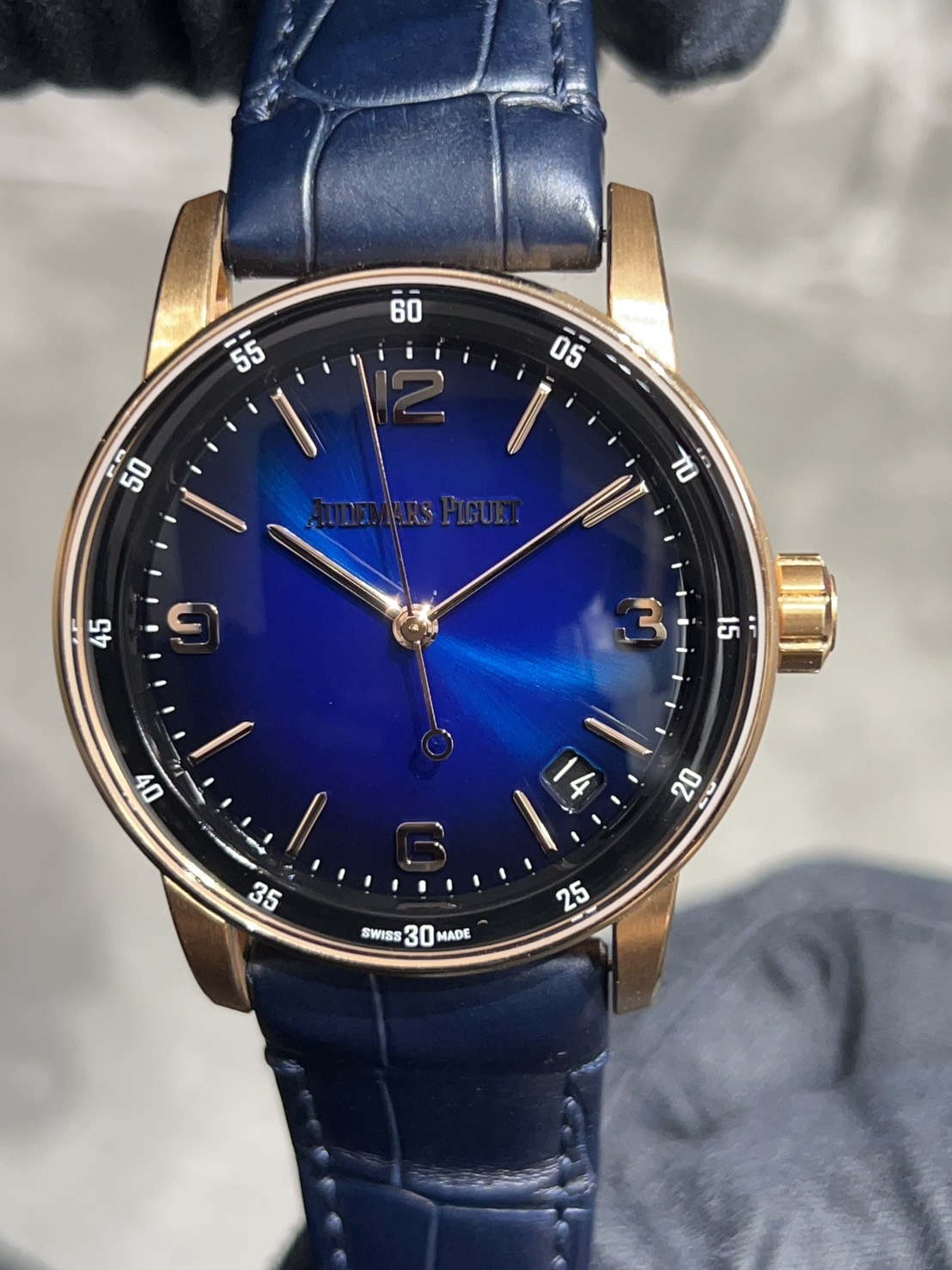 説明不要の大人気のブルー文字盤でございます!ピンクゴールドと鮮やかなブルー文字盤の組み合わせがとても妖艶です。