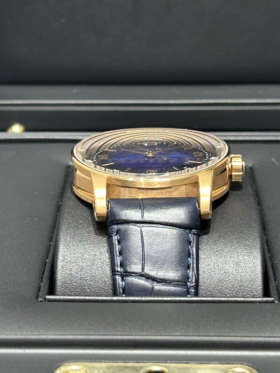 斜めの角度から文字盤を見ると湾曲したガラスが波状に見える姿は他の時計には見られない唯一無二の時計と言えるでしょう。
