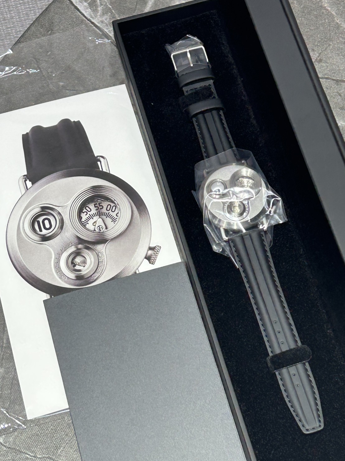 1、本体 2、カーフレザーストラップ(使用無し) 3、保証書 4、冊子類 5、専用クロス 6、内外箱