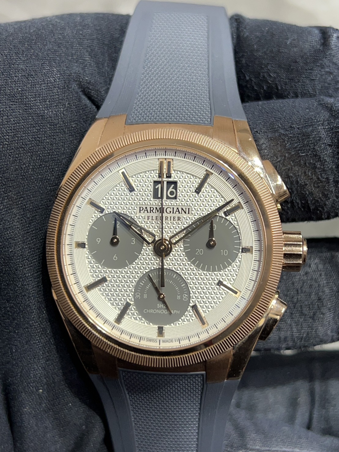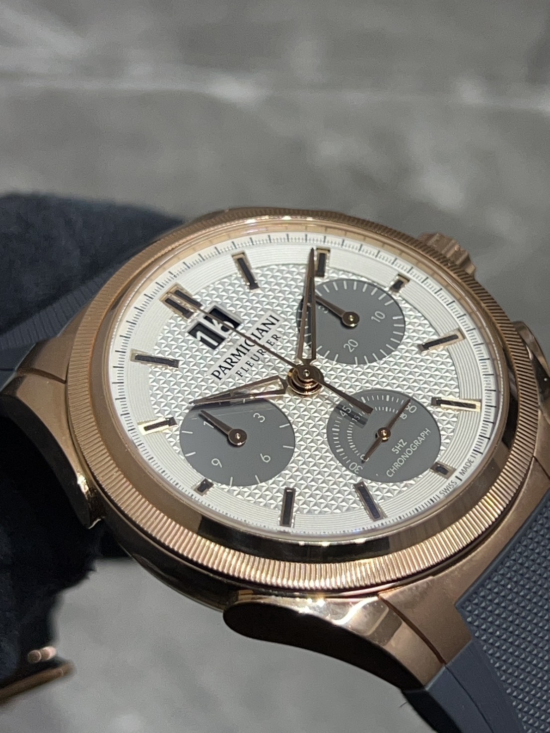 スイスの高級時計ブランド、パルミジャーニ・フルリエが2020年に発表した、スポーツモデルのコレクションであるトンダGT、今回はギョーシェが施されたシルバー文字盤にクアンタムグレー、カレンダー機能が備わり、ローズゴールドケースで高級感抜群のモデルが入荷致しました。