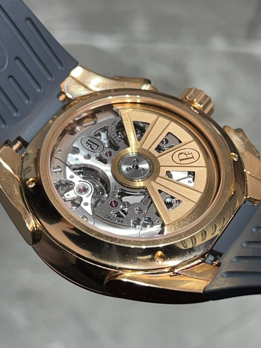 裏蓋からはCal.PF071を鑑賞する事ができ、22Kローズゴールドの美しいローターなどを楽しむ事ができます。