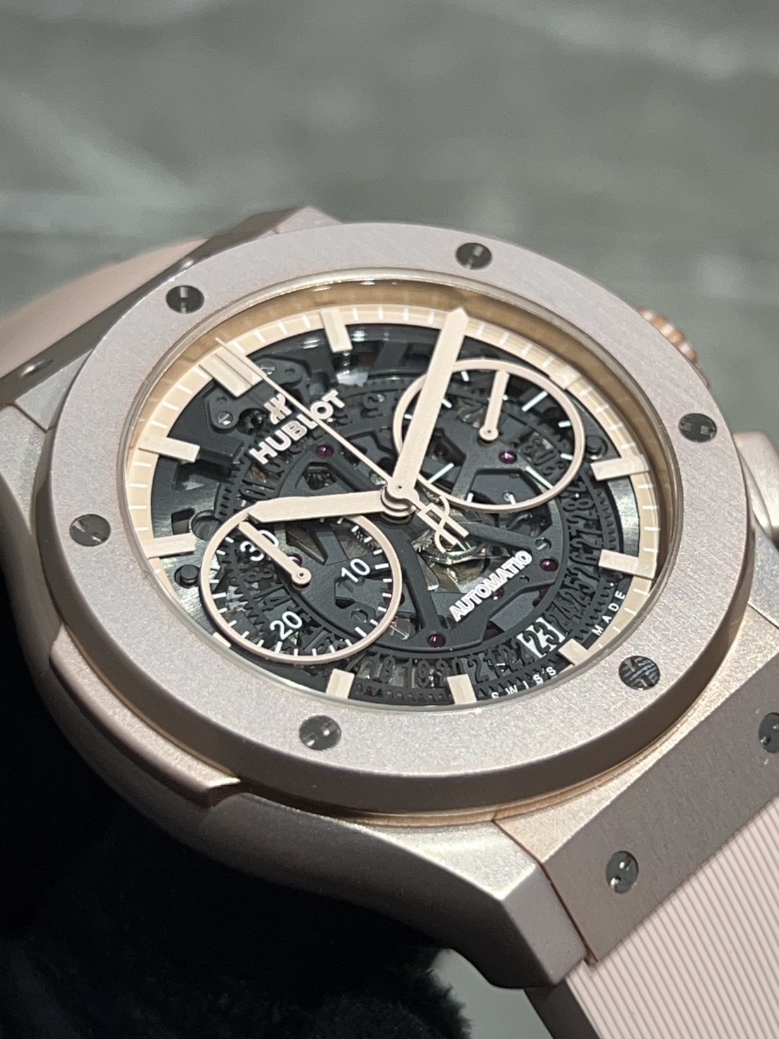 スケルトン文字盤から見えるムーブメントはブラックアウトされておりメリハリがあり大変スポーティな印象です。
