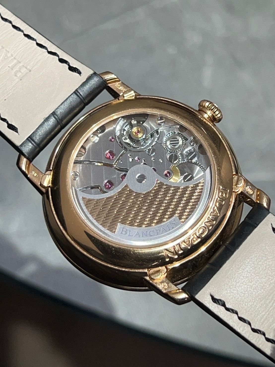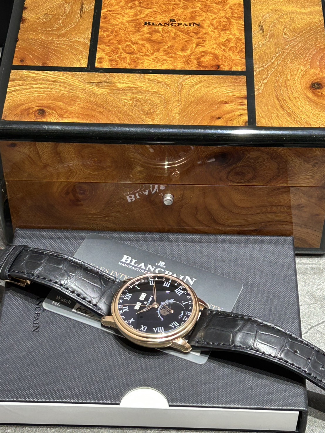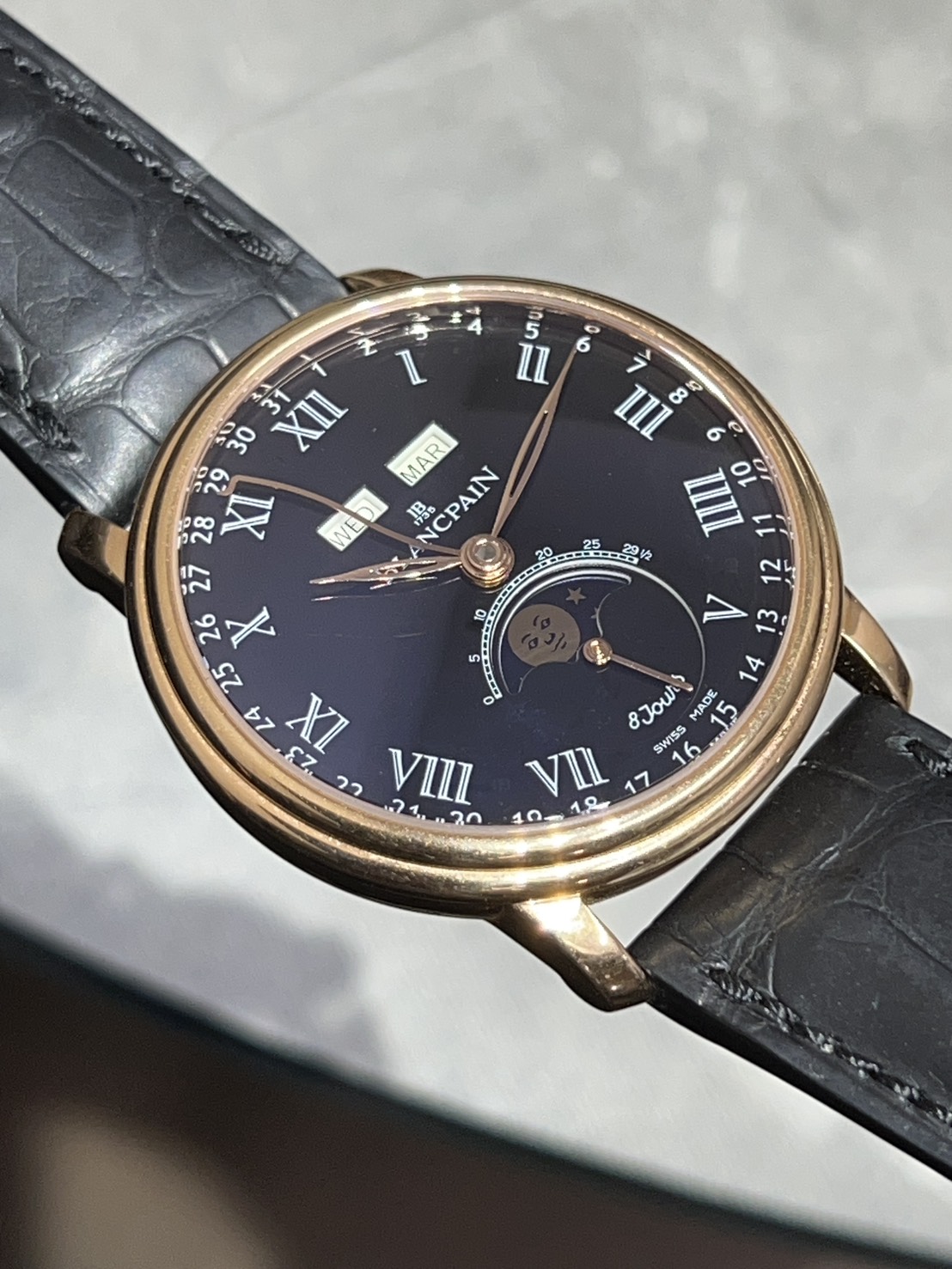 1735年創業のブランパン、ダイバースモデル等も多い当ブランド渾身のドレスウオッチ、トリプルカレンダー、ムーンフェイズ機能を備えたコンプリケーションモデル、今回はレッドゴールドのケースにうブラックのグラン・フー文字盤、裏蓋から見えるムーブメントやローターの仕上げが美しいヴィルレ コンプリート カレンダー 8デイズが入荷致しました。