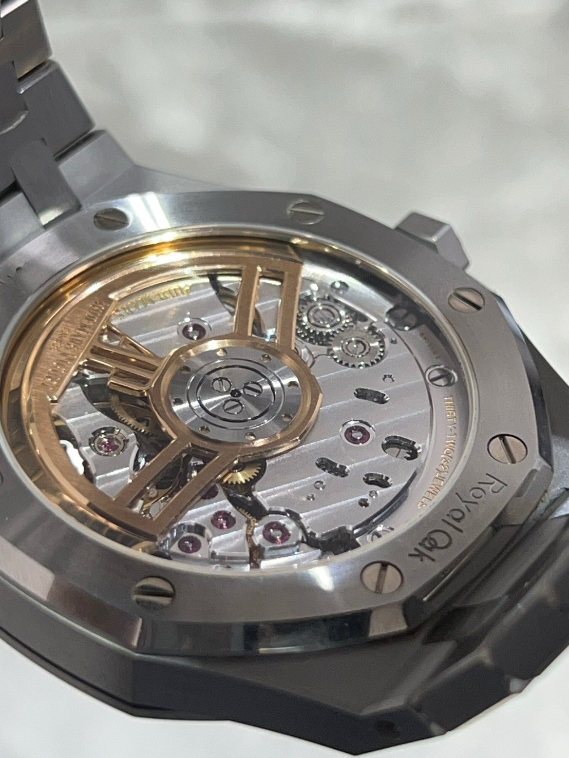 八角形の特徴的なケースに見事な仕上げのロイヤルオーク、裏蓋はシースルーとなっており自社製ムーブメント「Cal.4302」が確認できます。