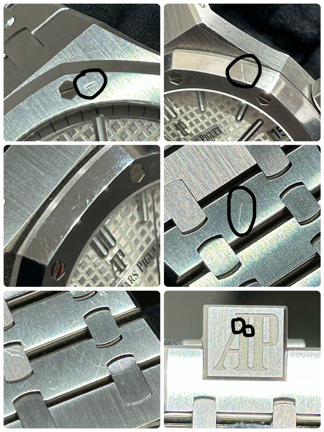 全体的にご愛用に伴うスレ、小傷が光の角度で確認できます。ベゼルに極小の打痕等は確認できますが(最後の写真参照)全体的には綺麗な印象を受ける個体ですので安心してご検討くださいませ。