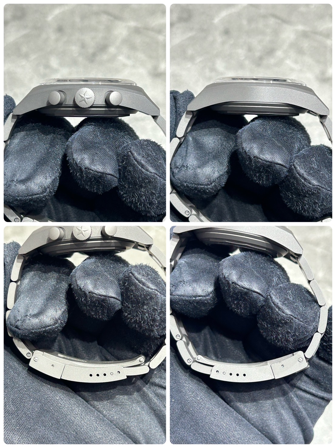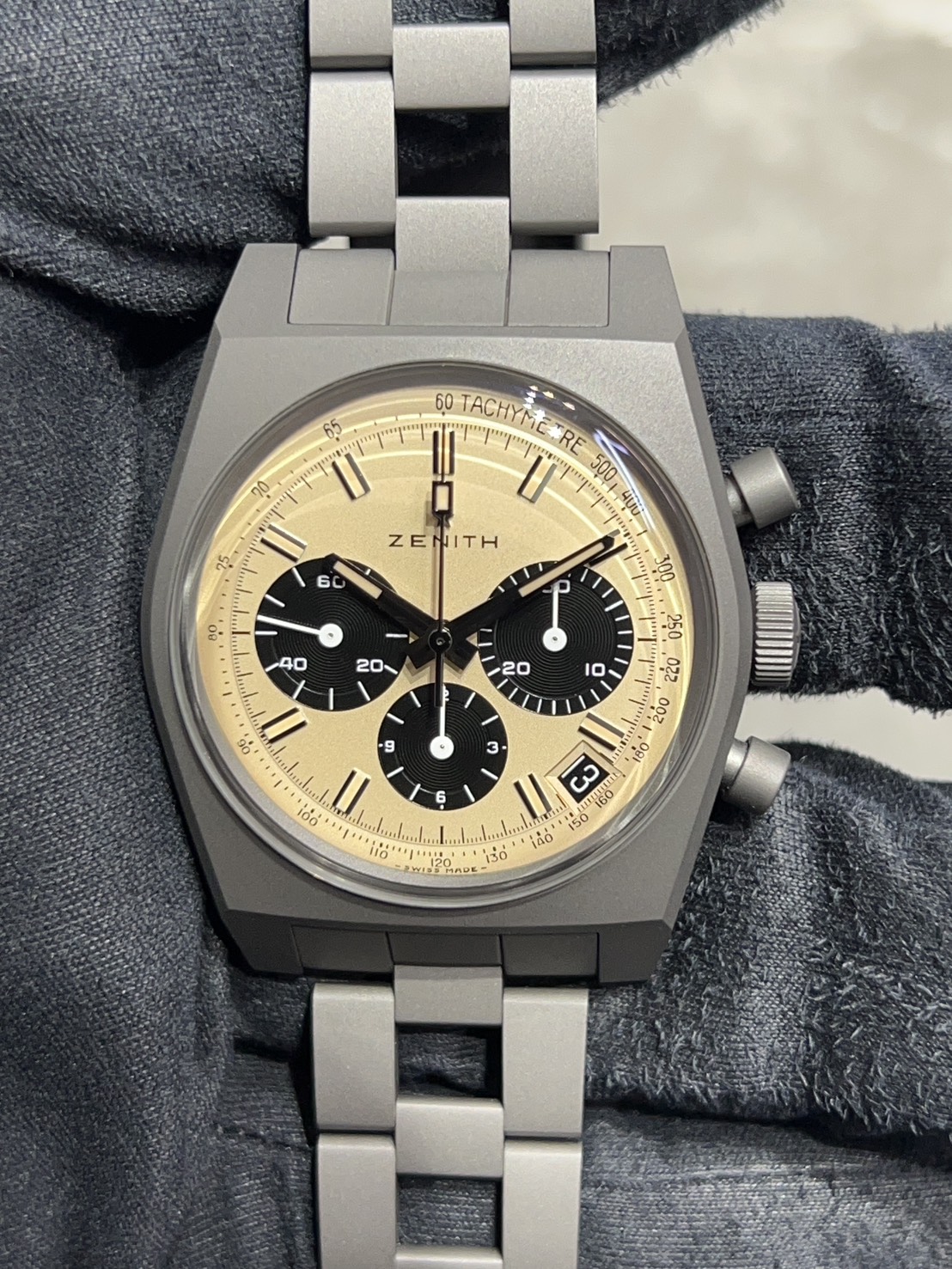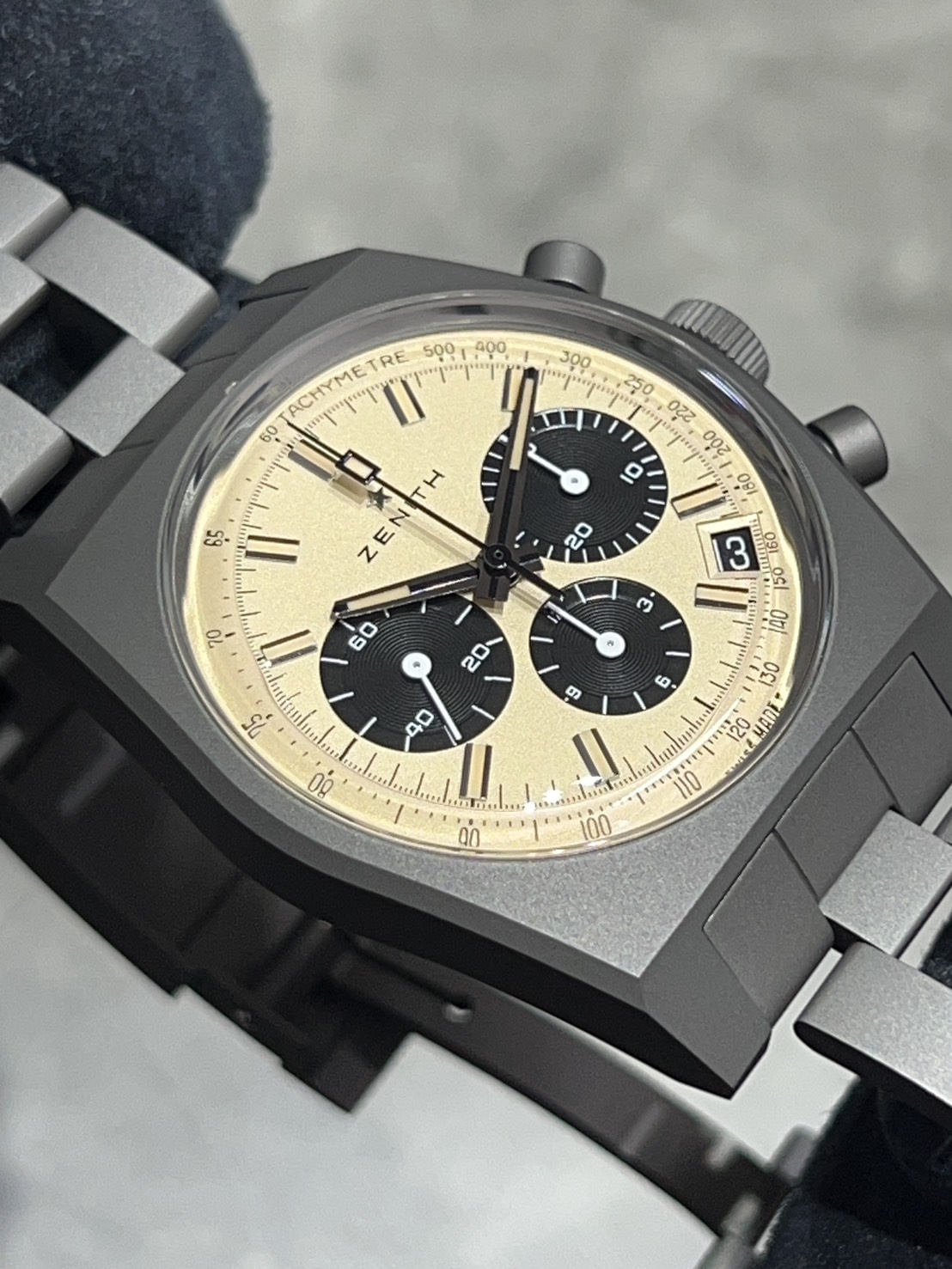 マットブラックのチタンケースで非常に軽やかな付け心地で、ダイヤルはベージュカラーの文字盤とブラックのクロノグラフカウンターを備えたヴィンテージ感ある雰囲気でございます。