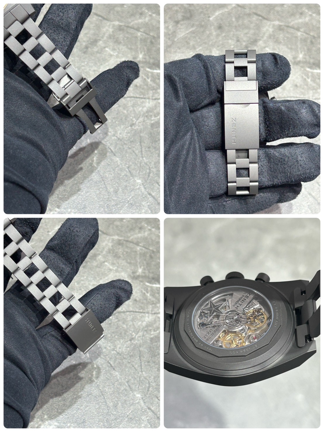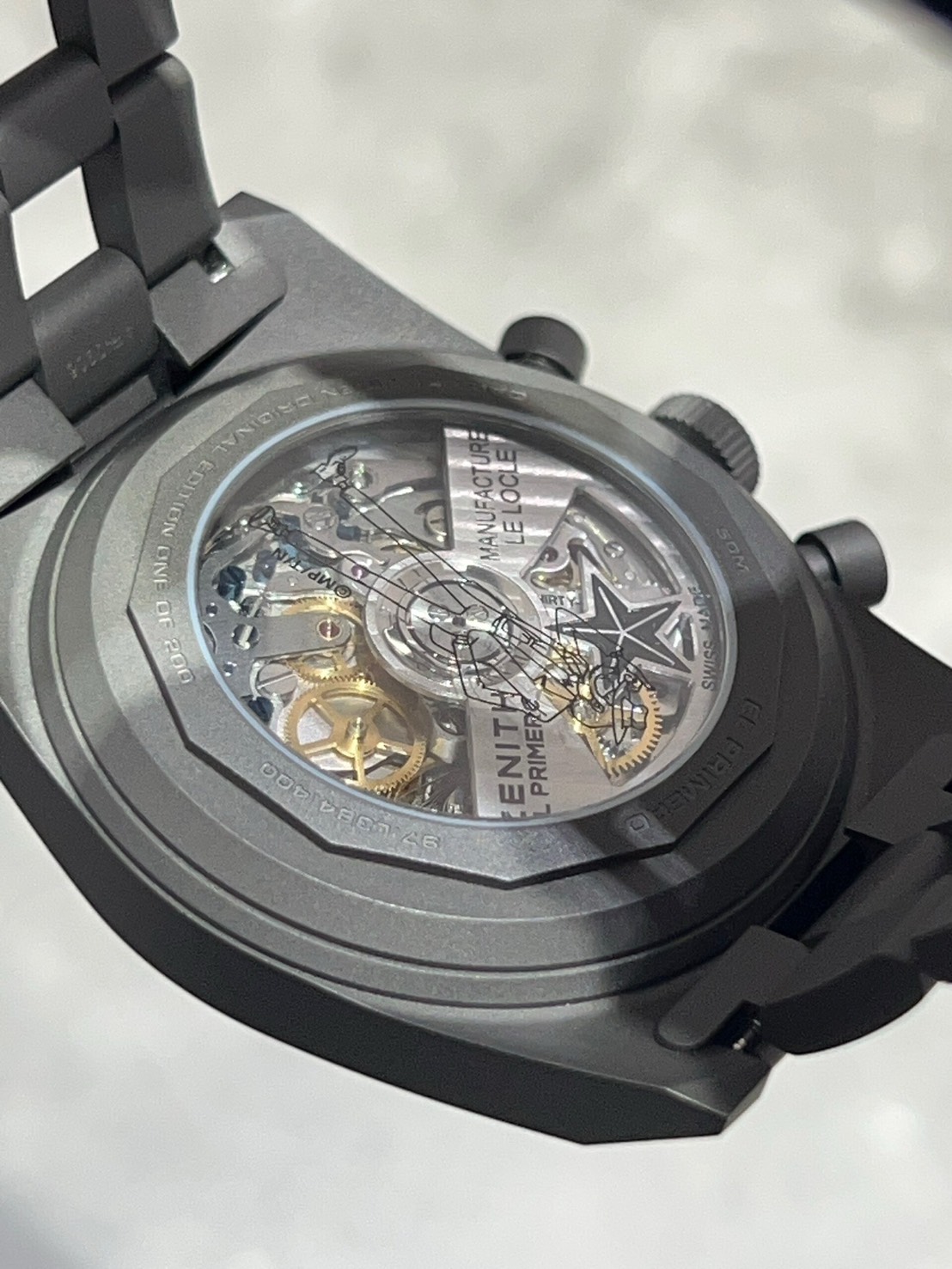 サファイアガラスの裏蓋には次元大介のシルエットが刻印され、ゼニスの象徴である自動巻き高振動クロノグラフ エル・プリメロ400を鑑賞する事ができます。