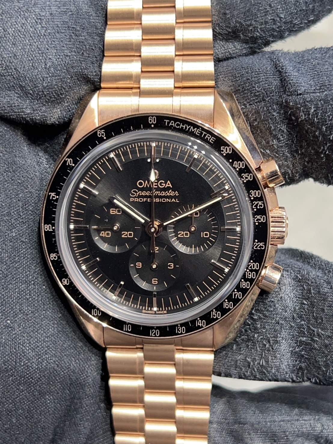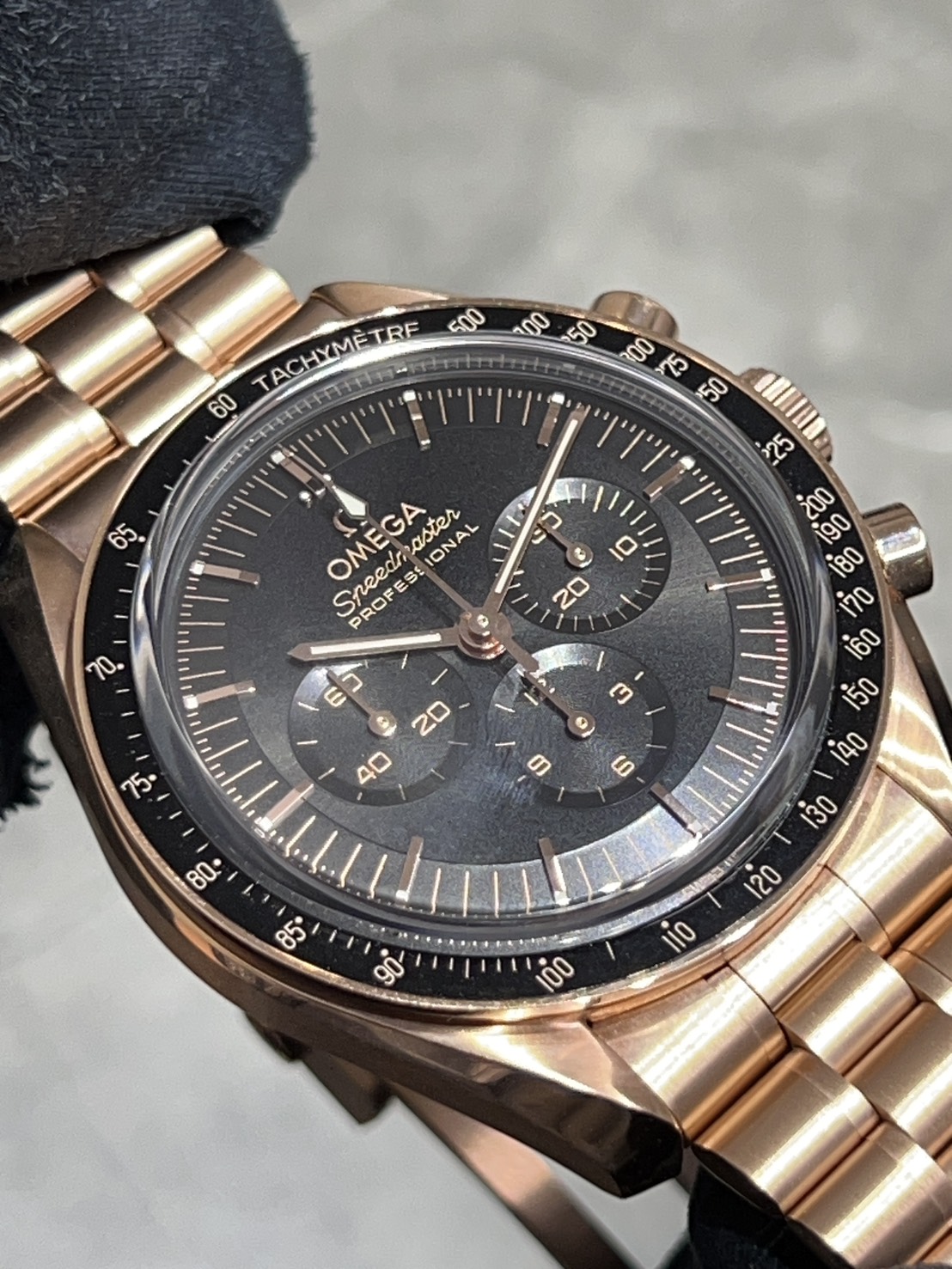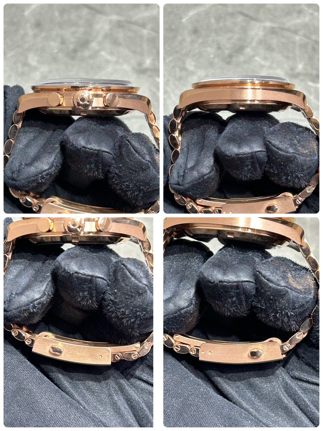 今回はセドナゴールド素材のゴージャスな外装に漆黒のベゼルに文字盤、外周が下って見えると思いますがこちらはステップダイアルと呼ばれる文字盤でより堀が深く引き締まった印象を与えます。