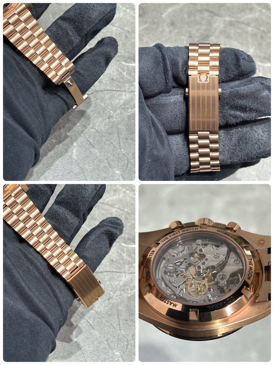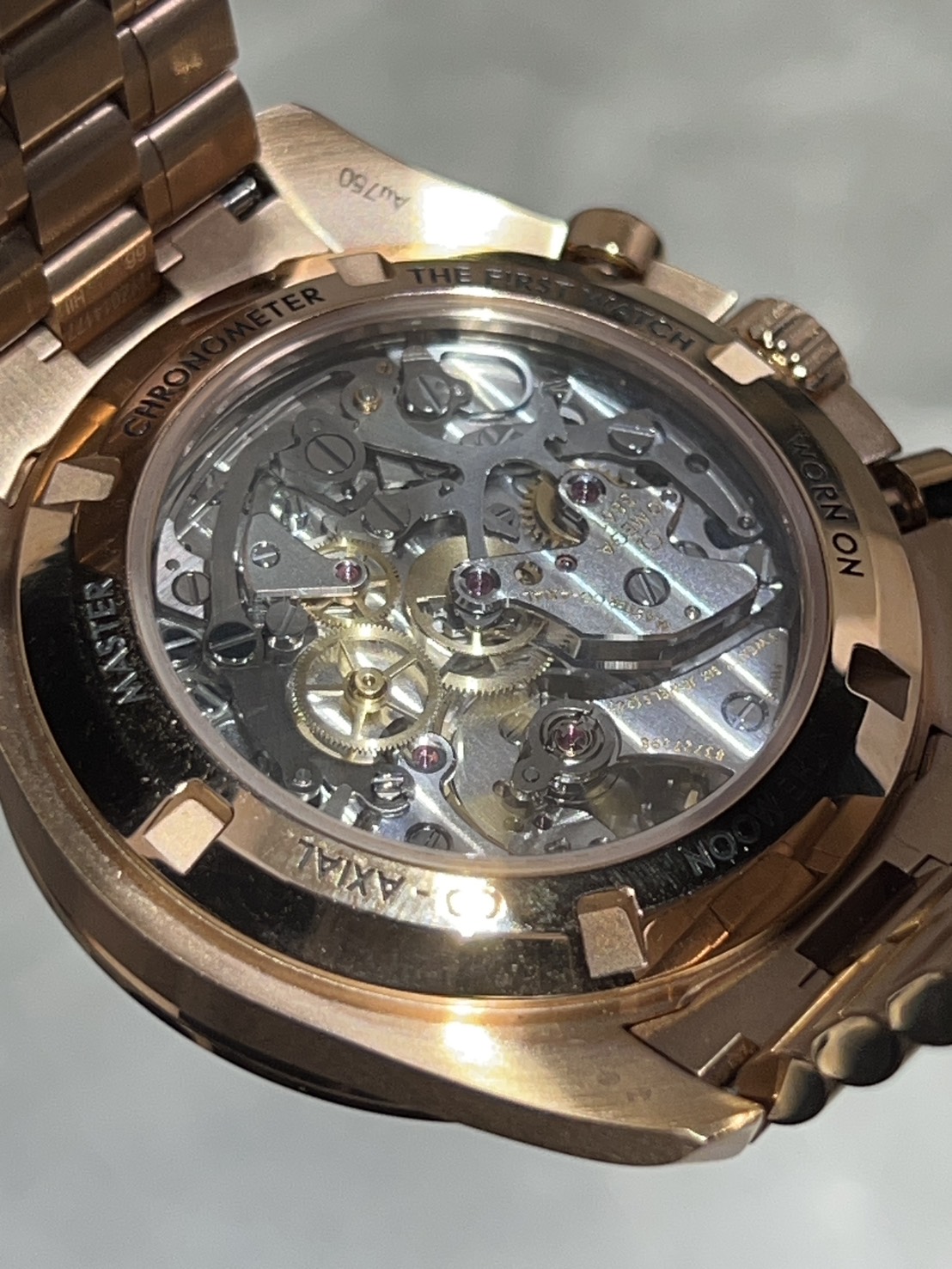 タキメーターやロゴ等もセドナゴールド色となっており裏蓋からは手巻きCal.3861の美しい装飾がご覧頂けます。