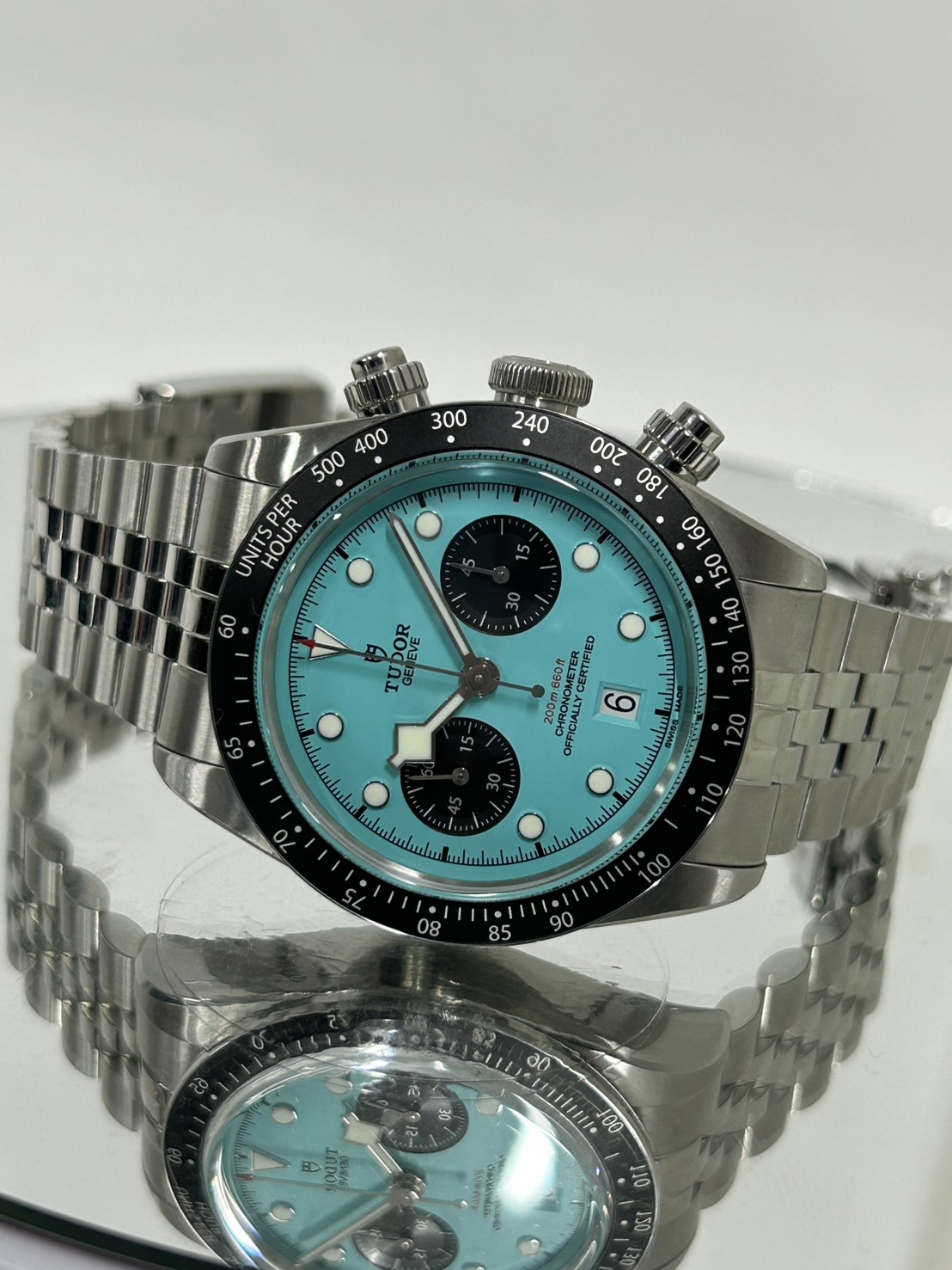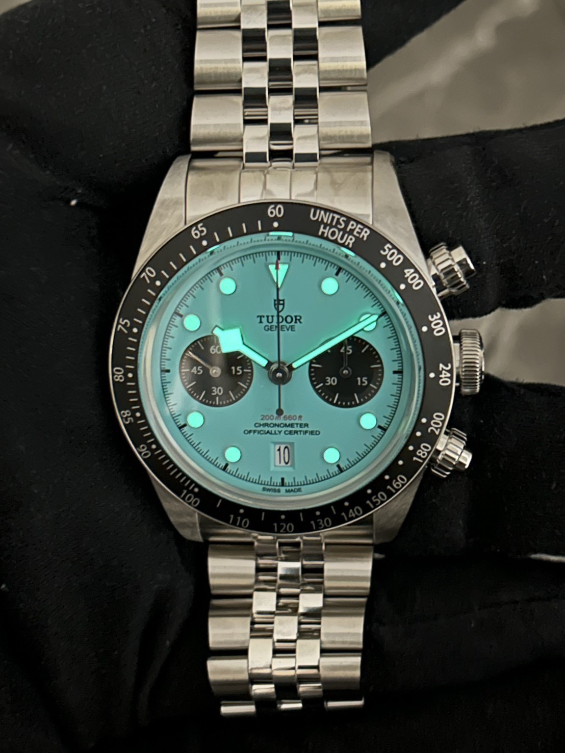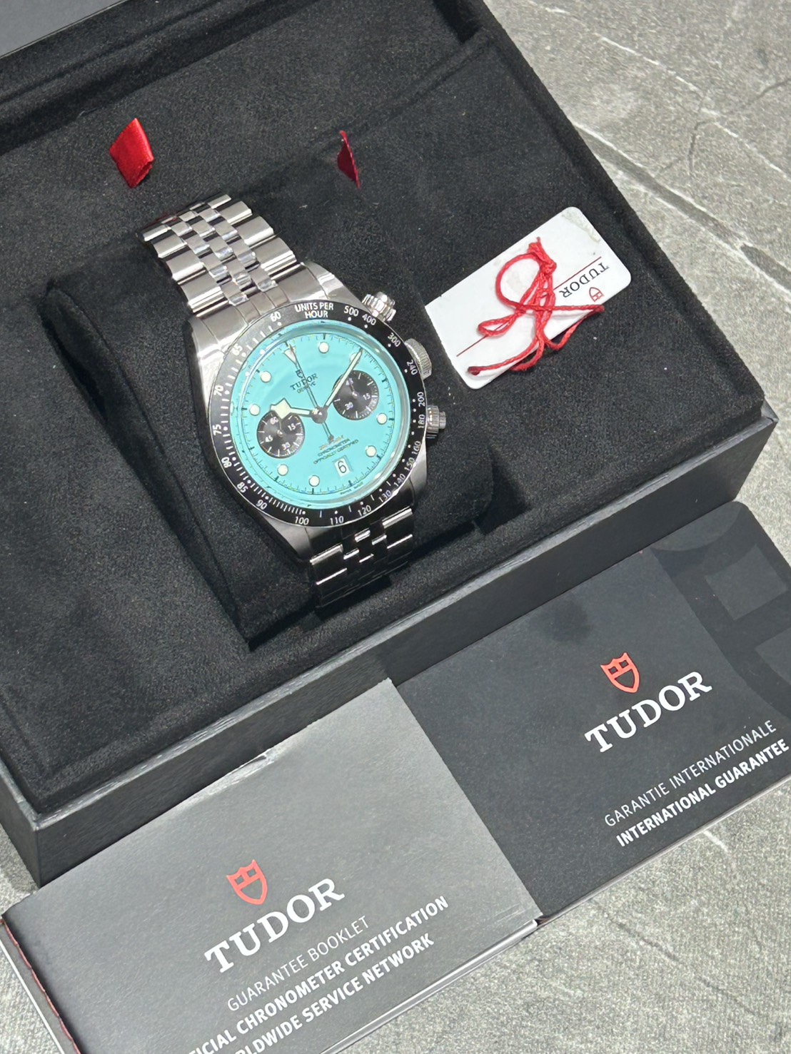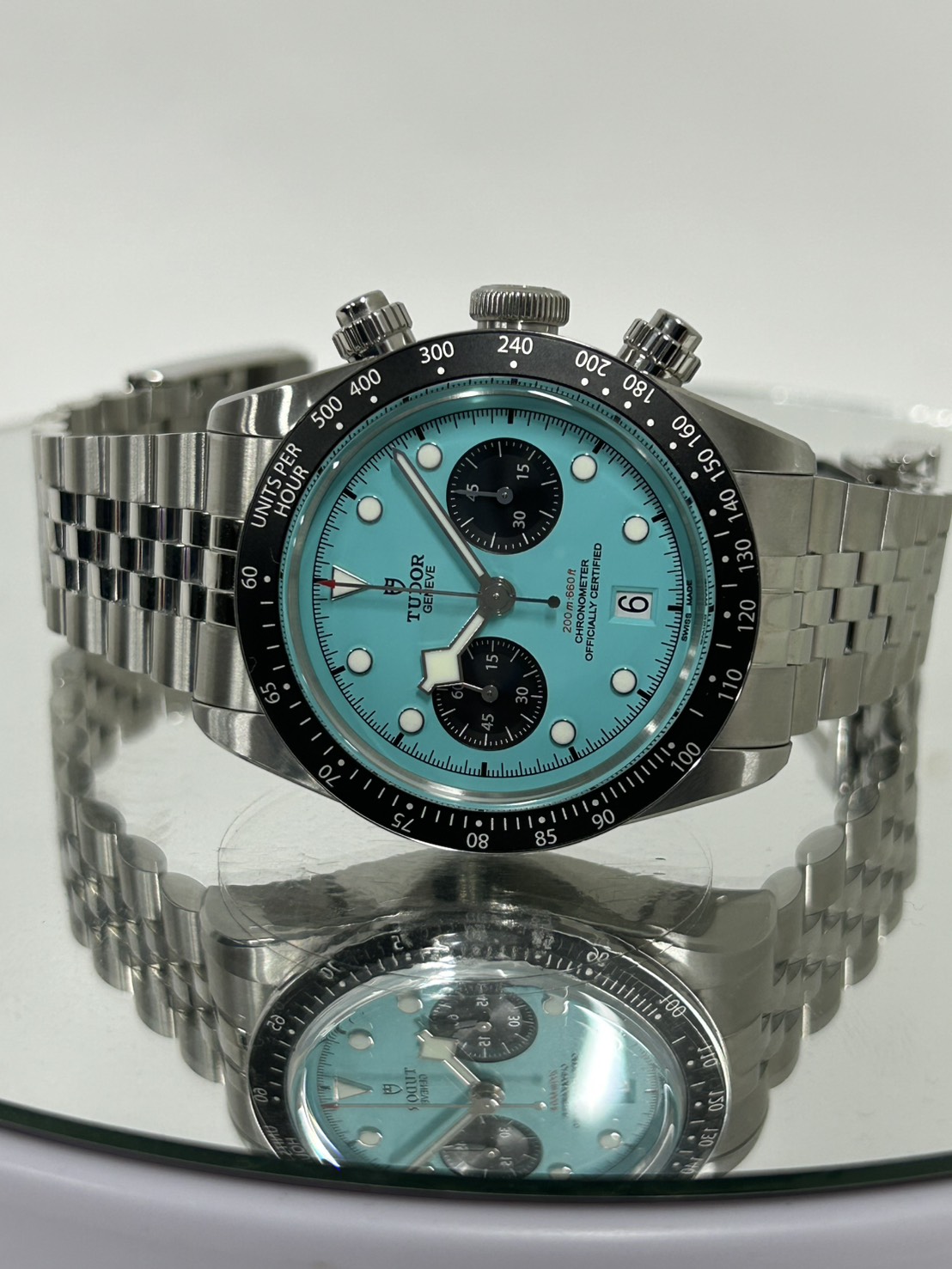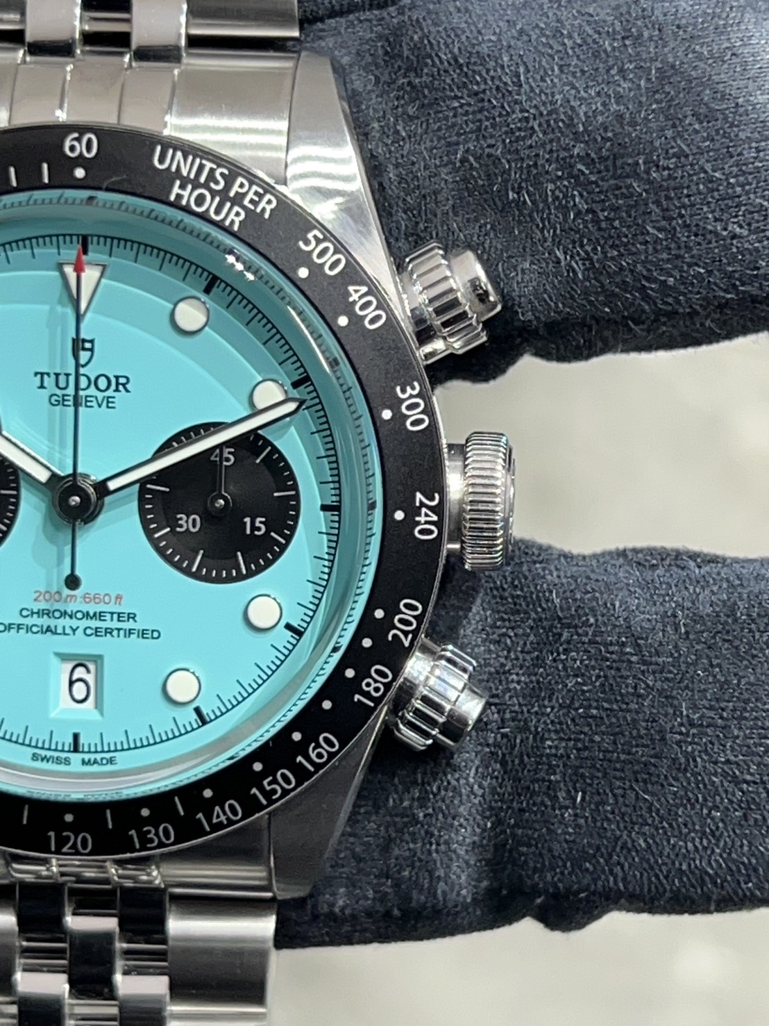 高い防水性とパワーリザーブをほこるチューダーの人気モデル、ブラックベイクロノ、ターコイズ(フラミンゴブルー)文字盤が入荷致しました!