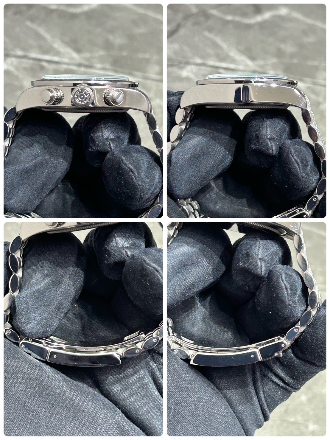 イカ針やインデックスの縁を囲む金属部分の光の反射が非常に美しくサテン、ポリッシュの仕上げを分けた5連のブレスも上品な光沢で高級感がございます。