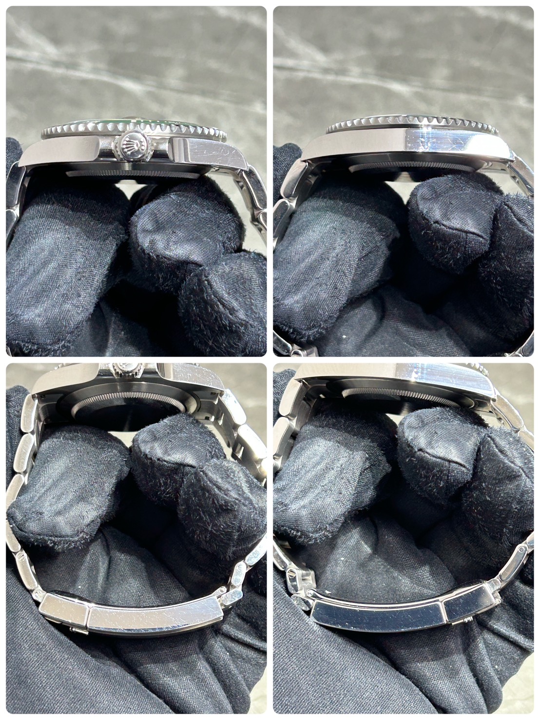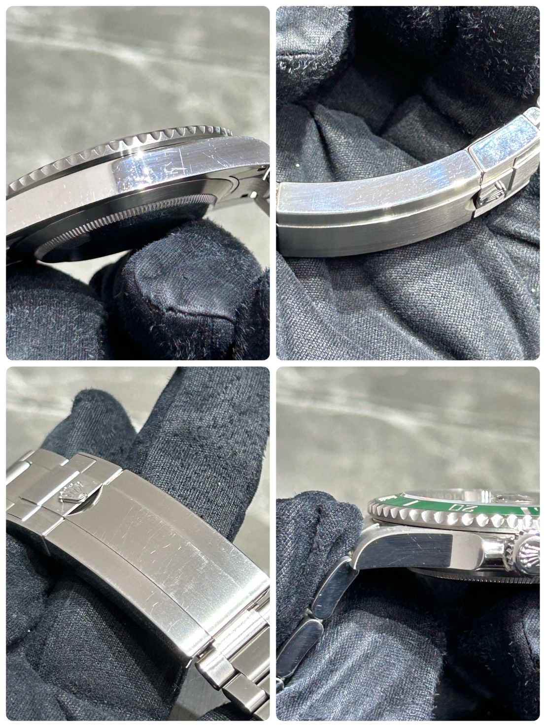 全体的にご愛用に伴うスレ、小傷が確認できます。ケースサイドやバックル等は光に当てればスレ小傷が目立ちます(最後の写真参照)また、写真に撮るのが困難なレベルですがガラス8時位置付近に爪でなぞるとひっかかる箇所がございます(ルーペで見てもわからないですが)ので予めご承知おきください。
