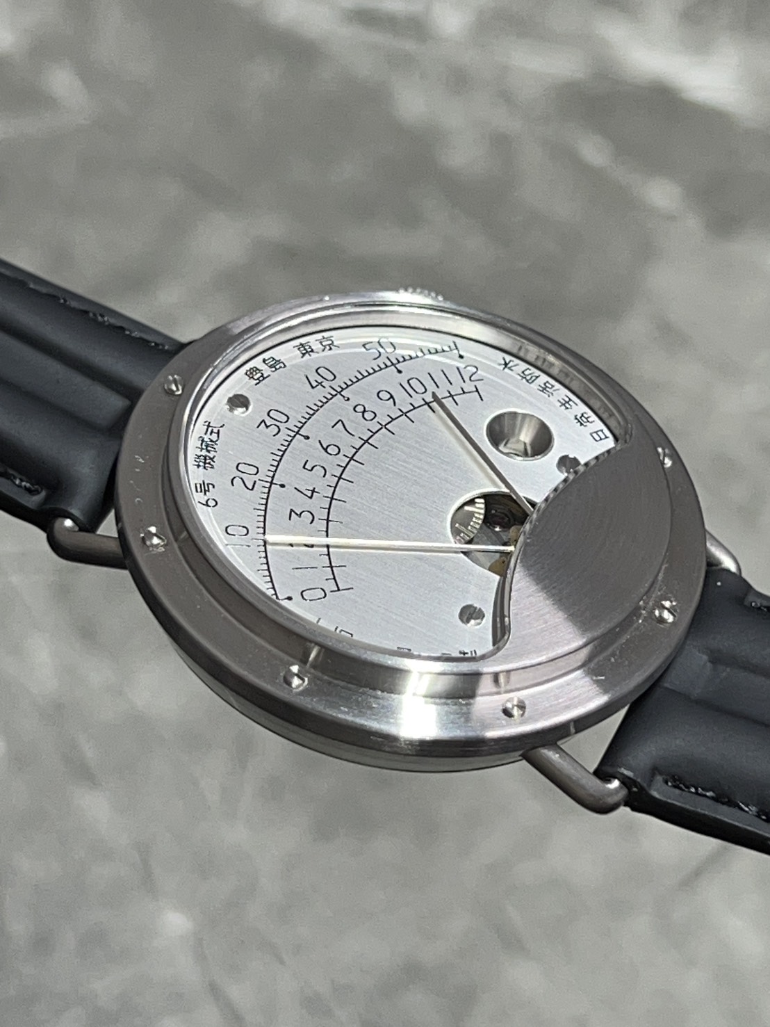 扇型に表示されるアナログメーターやレトログラード機構の時分針等革新的な印象ですがどこかレトロなイメージで遊び心溢れるいい意味で無骨なモデルだと思います。