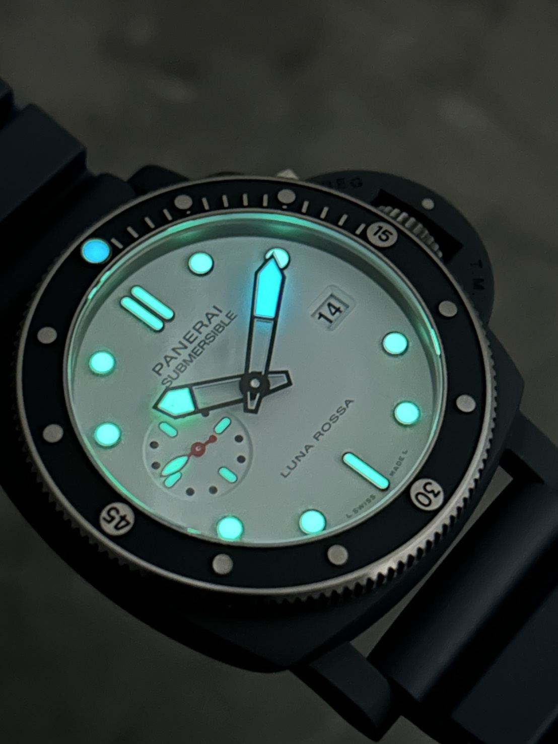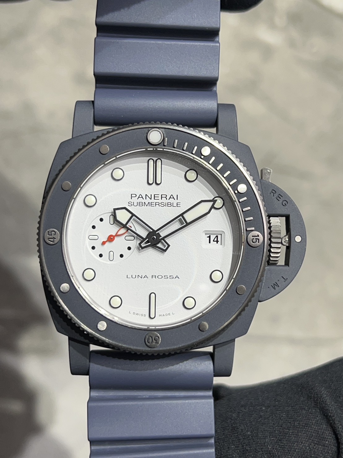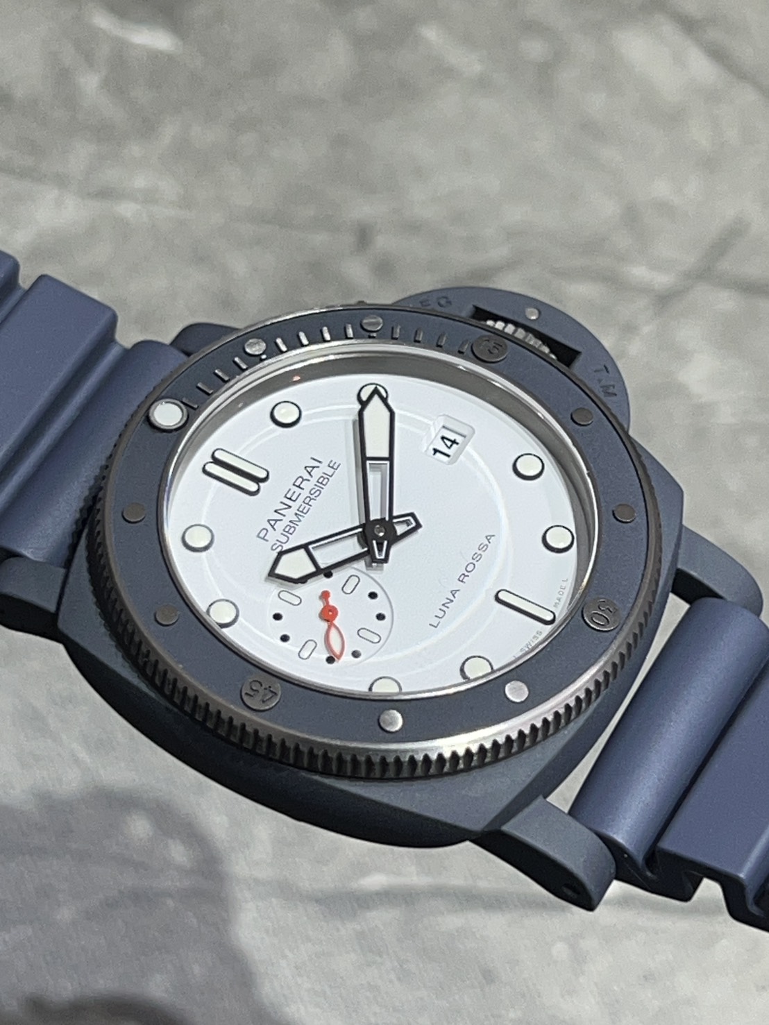 1956年の軍用モデルをルーツに持つ、高い堅牢性と防水性(主に300m)を誇る本格的なプロフェッショナルダイバーズウォッチであるサブマーシブル、今回はパネライが2024年に発表した白文字盤が爽やかな「サブマーシブル クアランタクアトロ ルナ・ロッサ Ti-Ceramitech™」のブティック限定モデルでございます。
