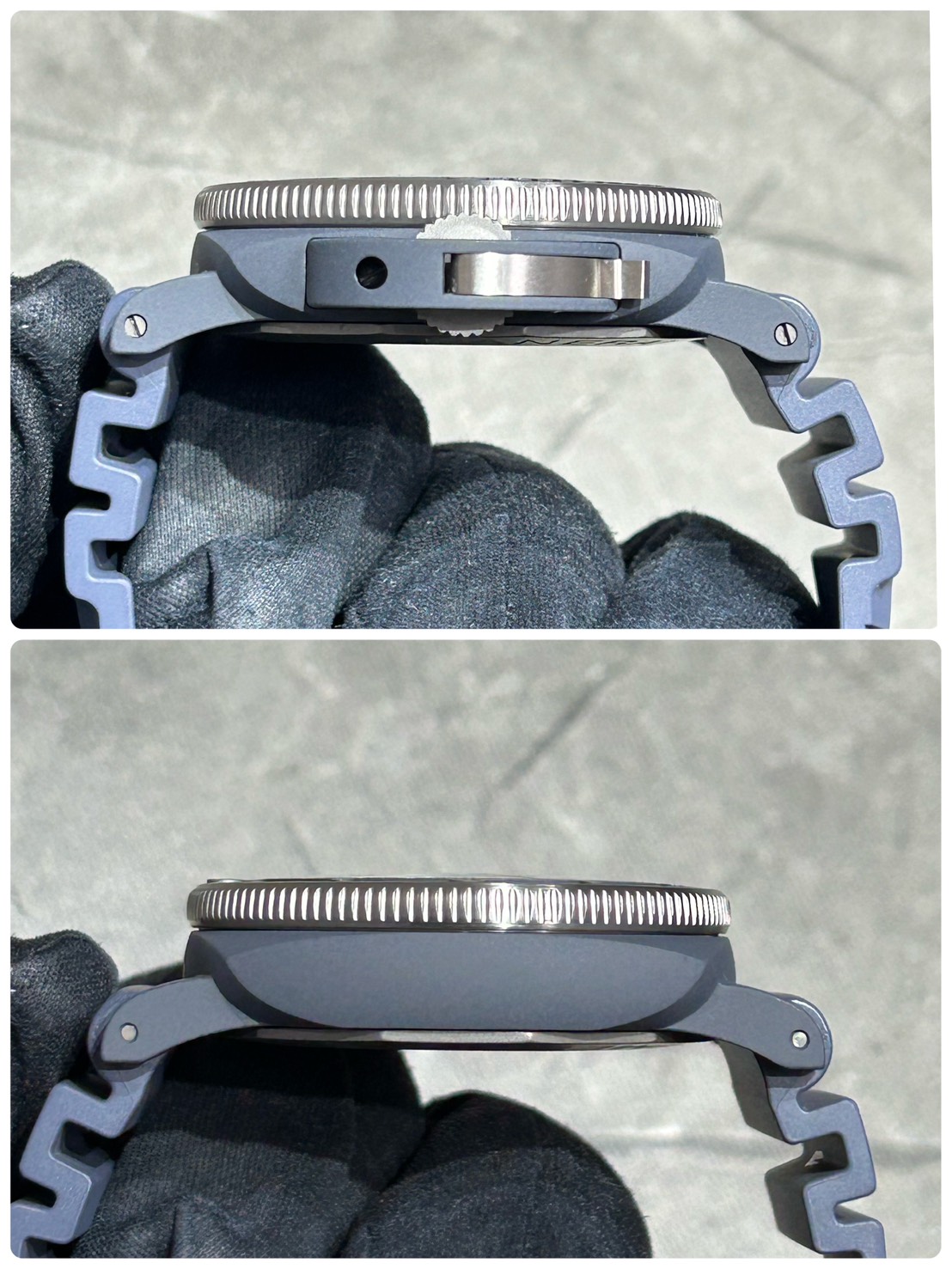 最大の特徴は独自開発素材であるTi-Ceramitech™をケースに採用。チタンをベースにセラミック化処理を施すことで、チタンの軽さとセラミックの高硬度・耐傷性を両立しており、見た目の無骨さに反して装着時の負担が少ない点が大きな特徴となっております。