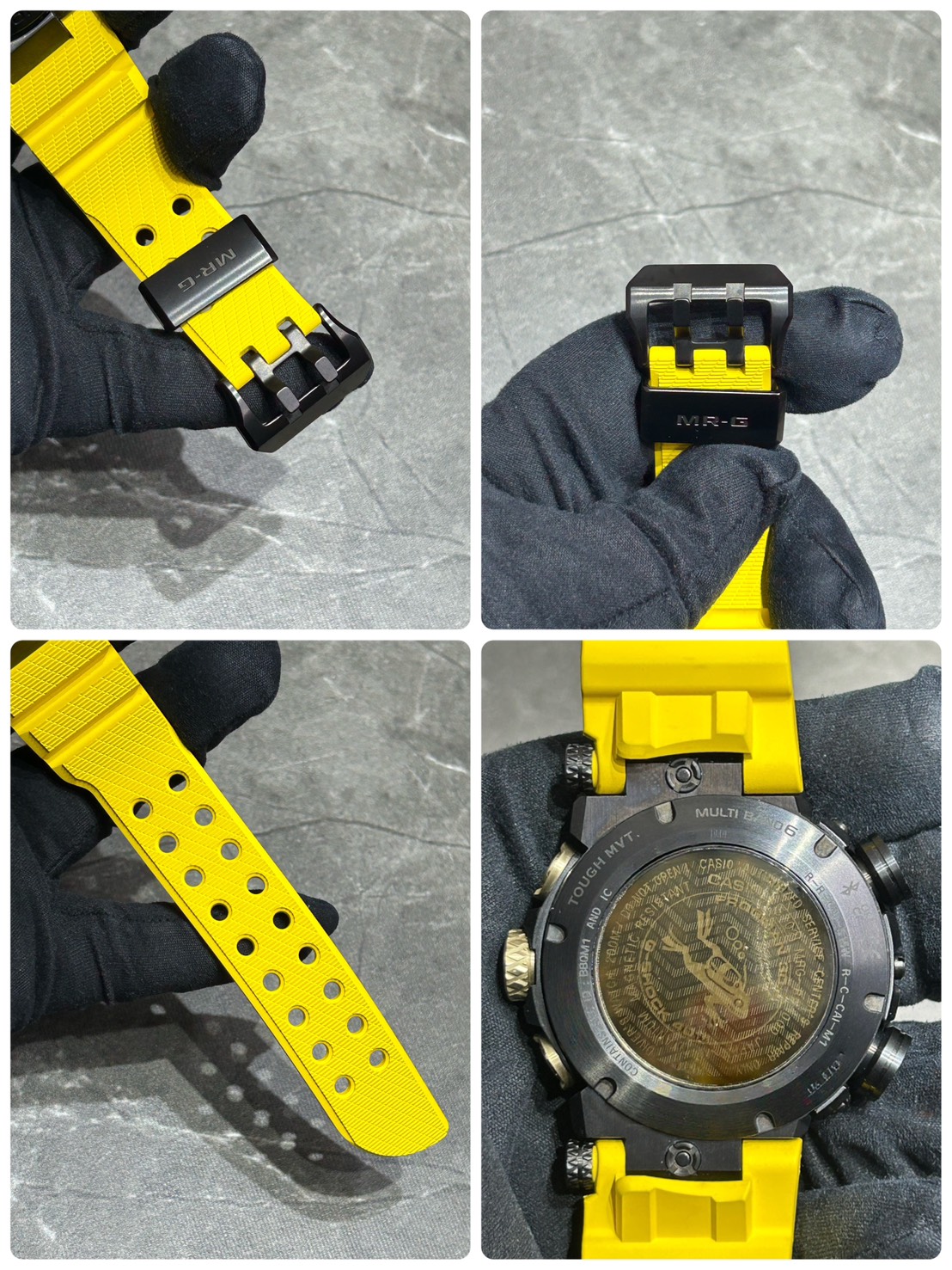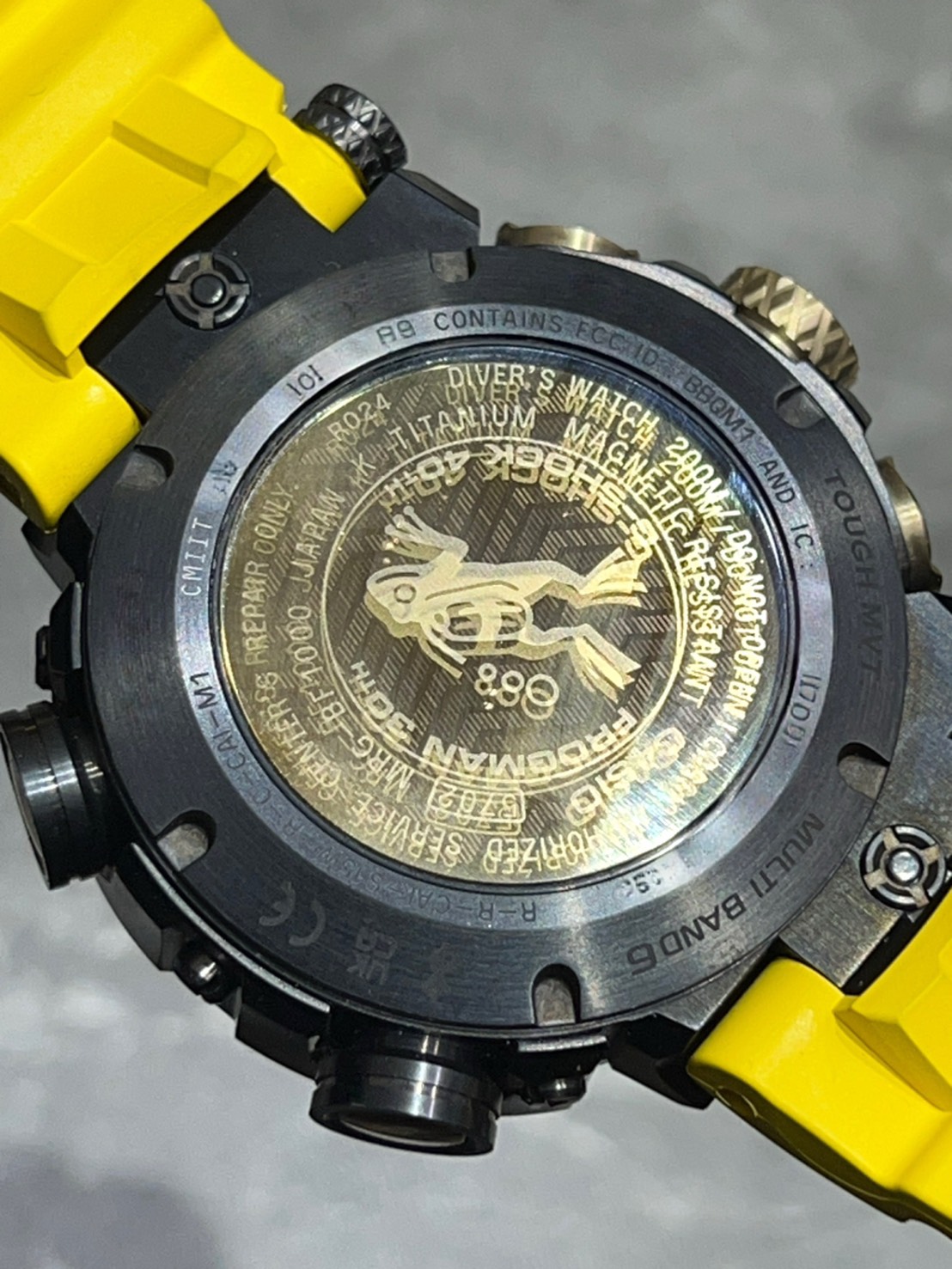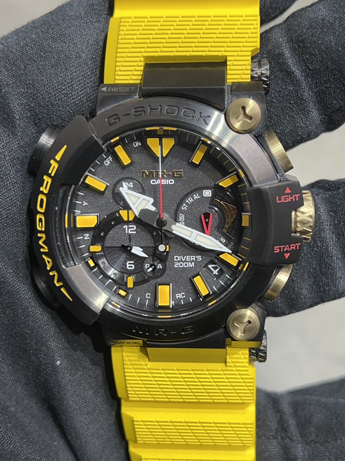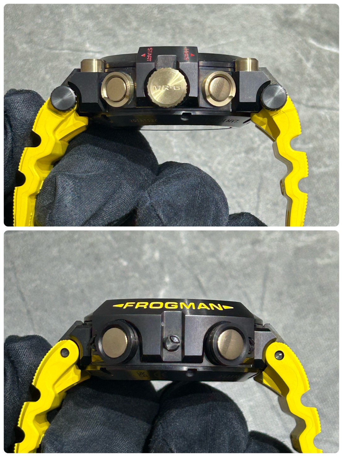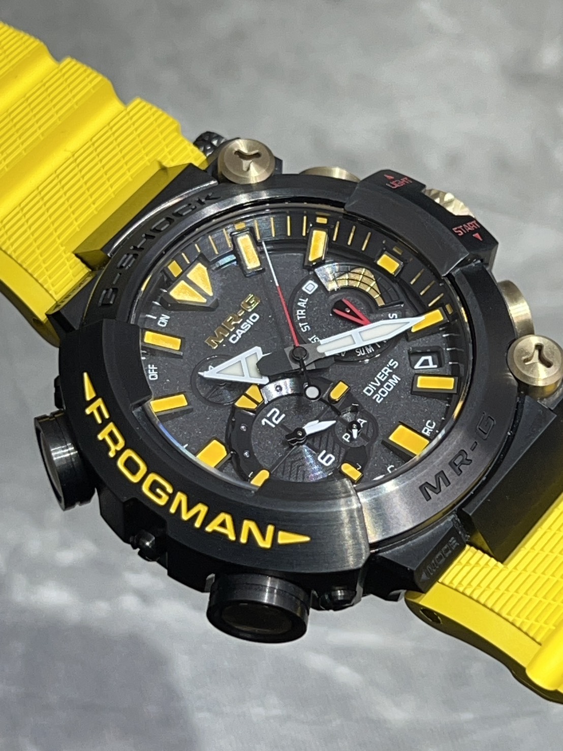 G-SHOCKの最上位シリーズであるMR-G(エムアールジー)、左右非対称なフォルムが特徴のフロッグマン(FROGMAN)をベースにしており特徴的なイエロー色に剛健なフルチタンのケースがスタイリッシュでケースバックのカエルのレリーフも特徴的なモデルでございます。