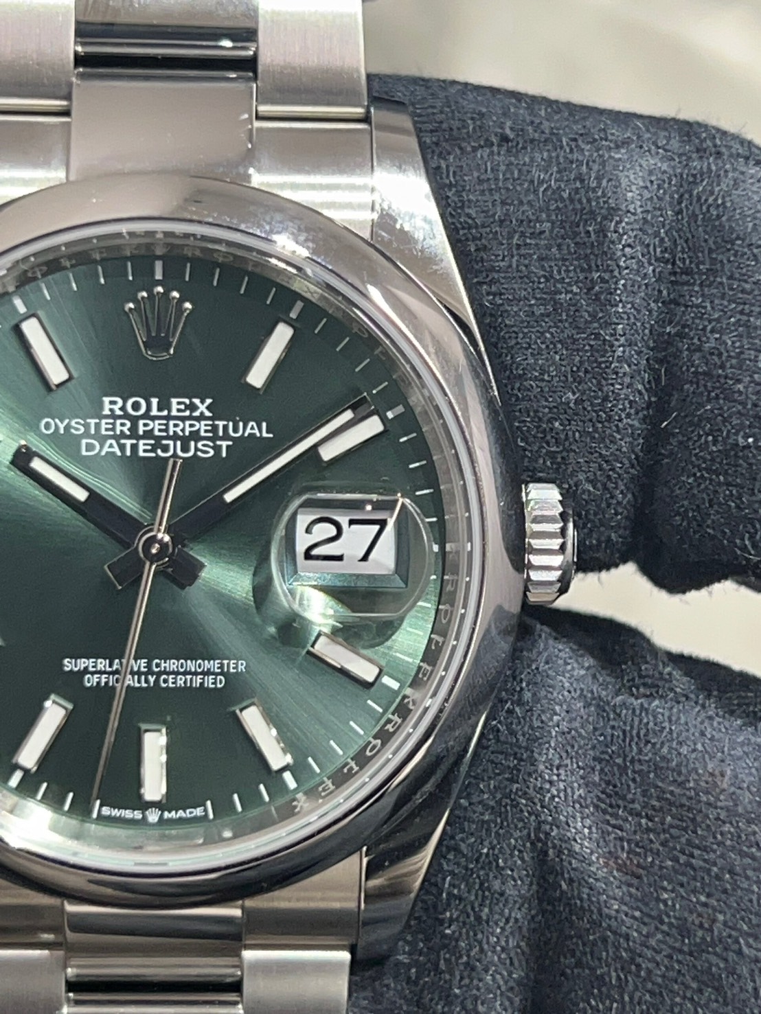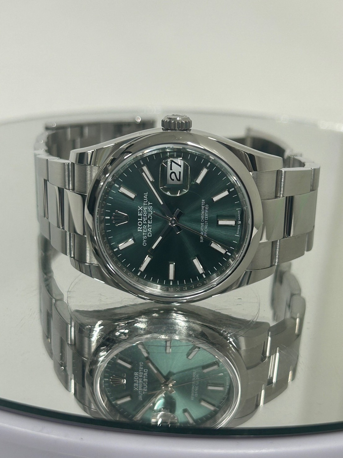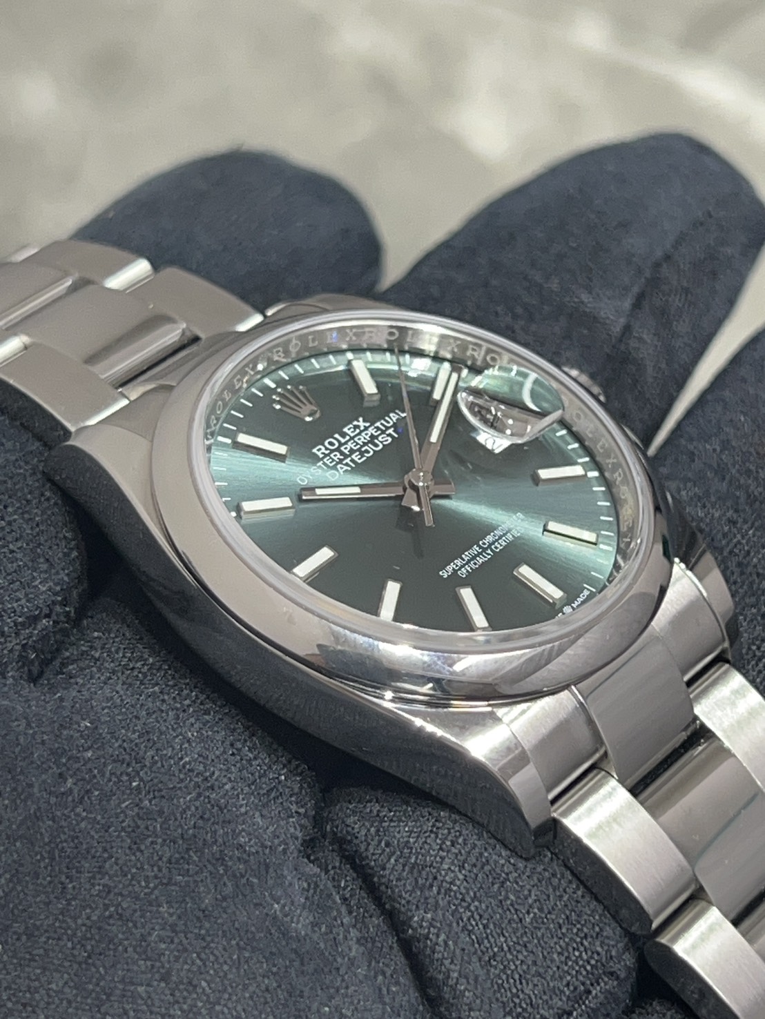 スムースベゼル、オイスターブレスの為派手過ぎず様々なシーンに合わせやすいモデルとなっており、文字盤のミントグリーンは優しい色合いでサンレイも非常に美しいものになっております。