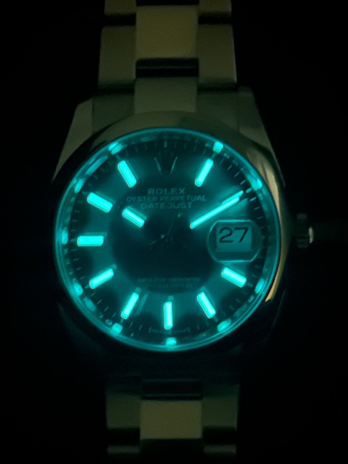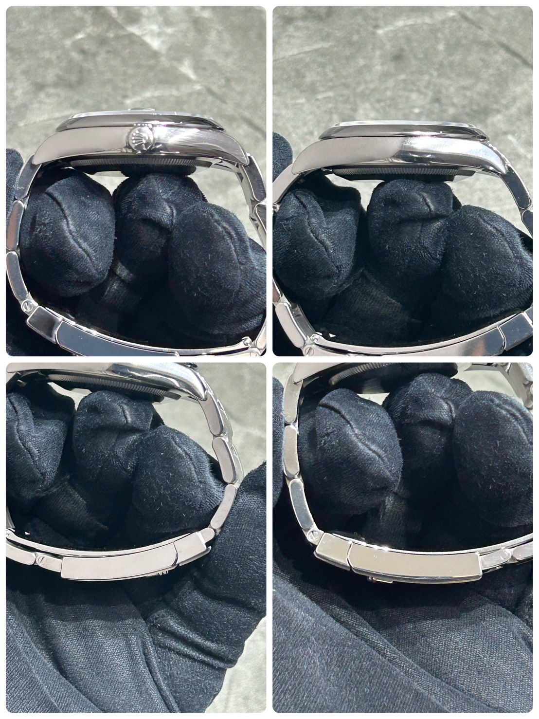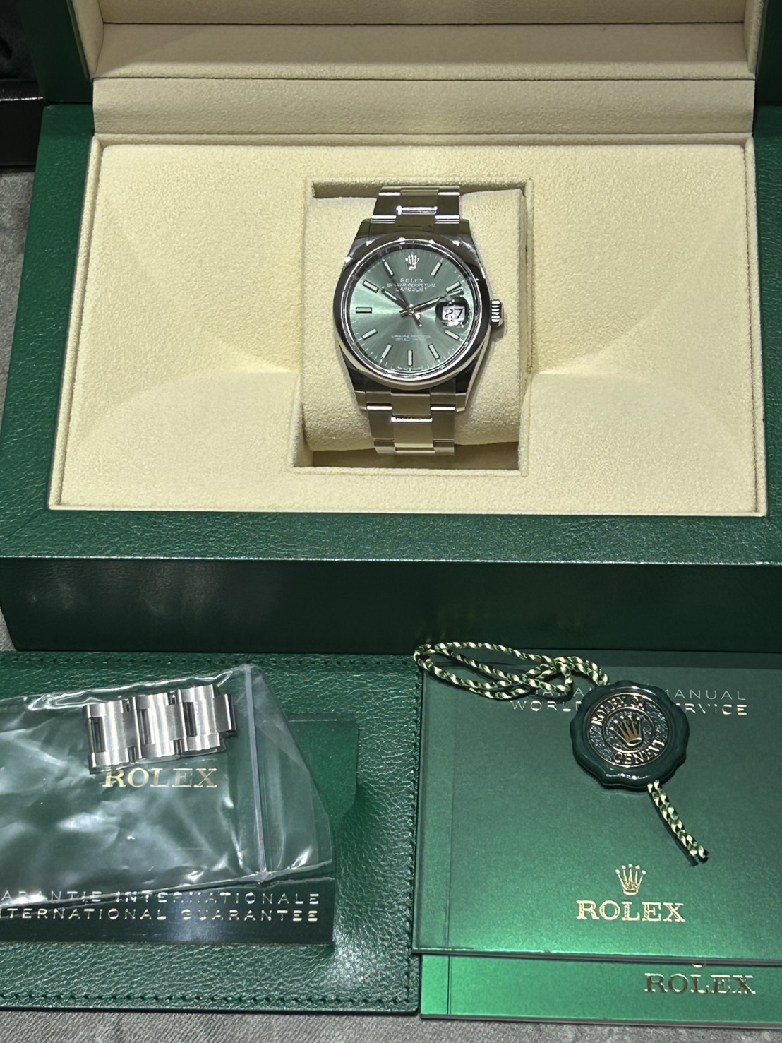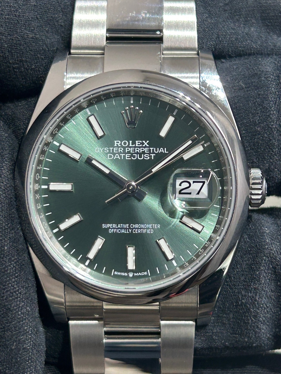 スムースベゼル、オイスターブレスの為派手過ぎず様々なシーンに合わせやすいモデルとなっており、文字盤のミントグリーンは優しい色合いでサンレイも非常に美しいものになっております。