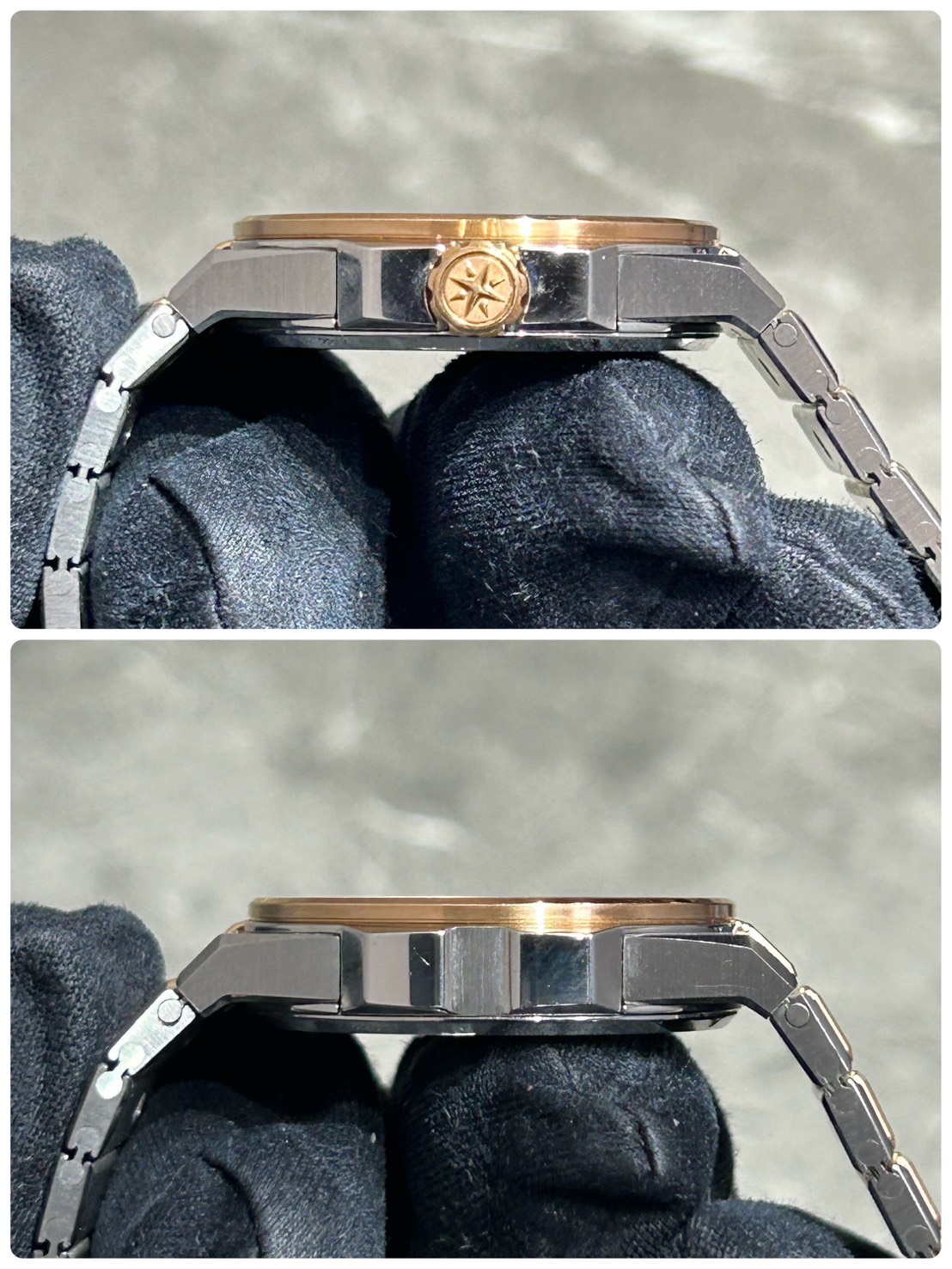 33㎜ケースはステンレス製になりローズゴールド製のベゼルで華やかでラグジュアリーな装いとなっており、ブレスもステンレスとローズゴールドで美しく女性にピッタリのデザインとなります。
