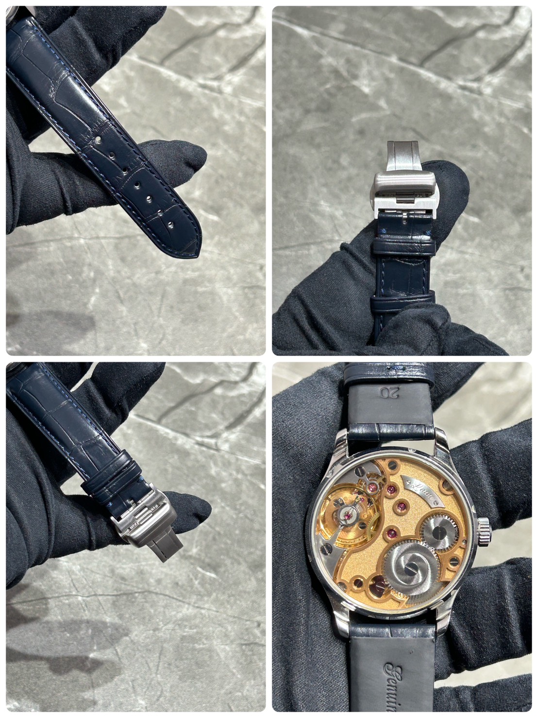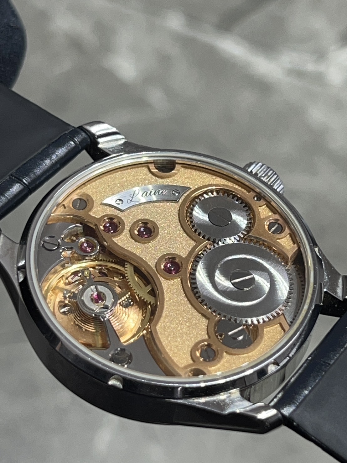 裏蓋からは手巻きムーブメントCal.LA18.1を鑑賞でき、ハンドメイドのフロスティング装飾が施された地板は非常に美しく工業製品とは違う職人技を楽しむ事ができます。