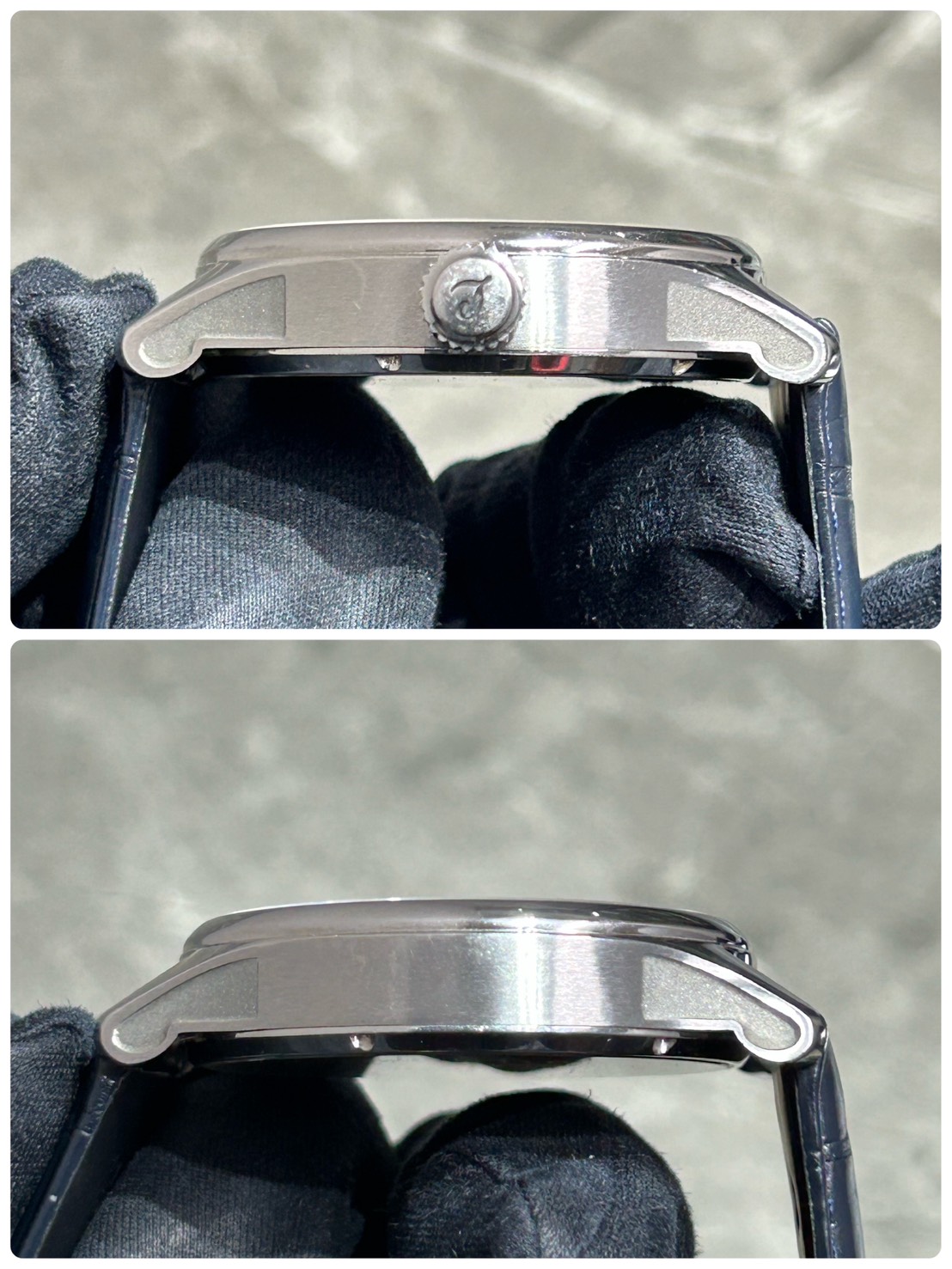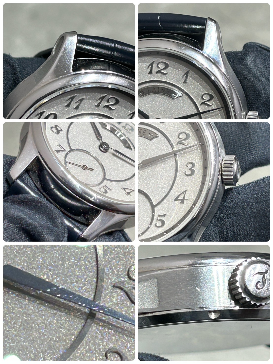 全体的に使用感があり、ガラス中央部に傷が複数ございます。ケースはポリッシュの形跡があり、スレ、小傷が全体的にございますので状態を良くご確認の上お買い求め下さい。ストラップは正規品1本(使用感大)社外品2本(使用感小)となります。Dバックルは全て社外品となります。