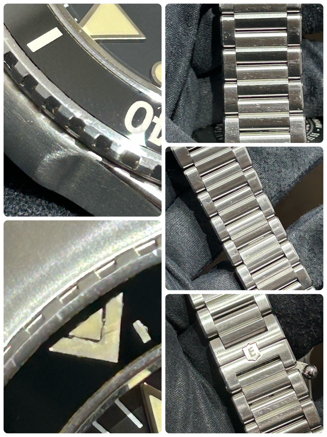 全体的にご愛用に伴うスレ、小傷が確認できます。ベゼルに小打痕、ブレスにスレ傷等がございます(最後の写真参照)ので予めご承知おきください。