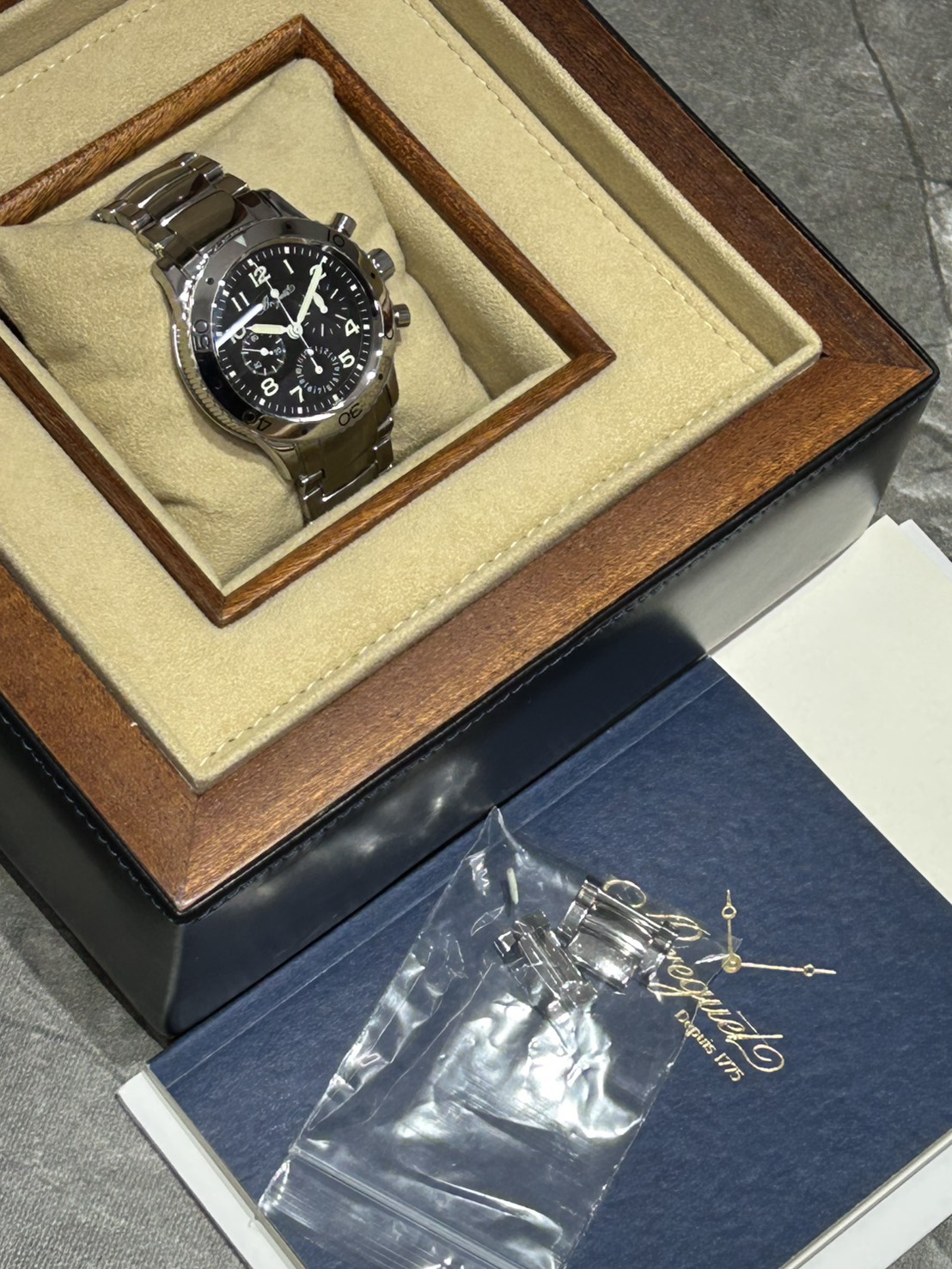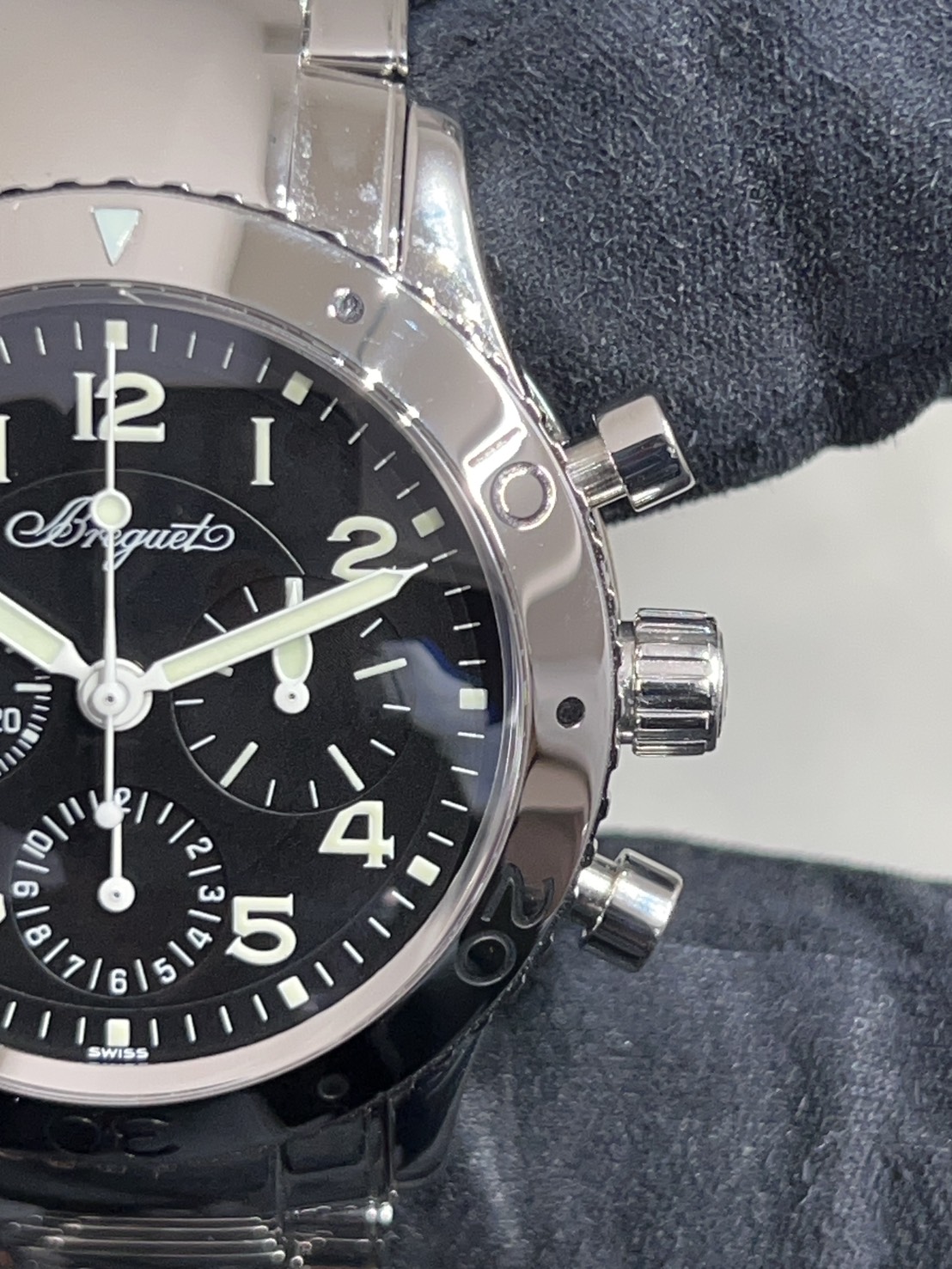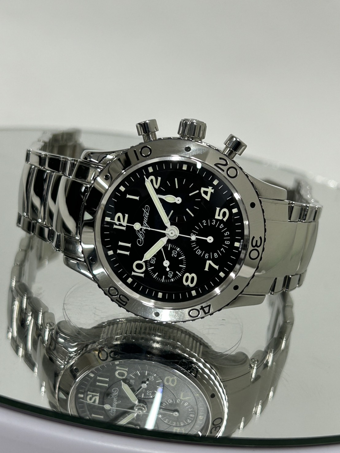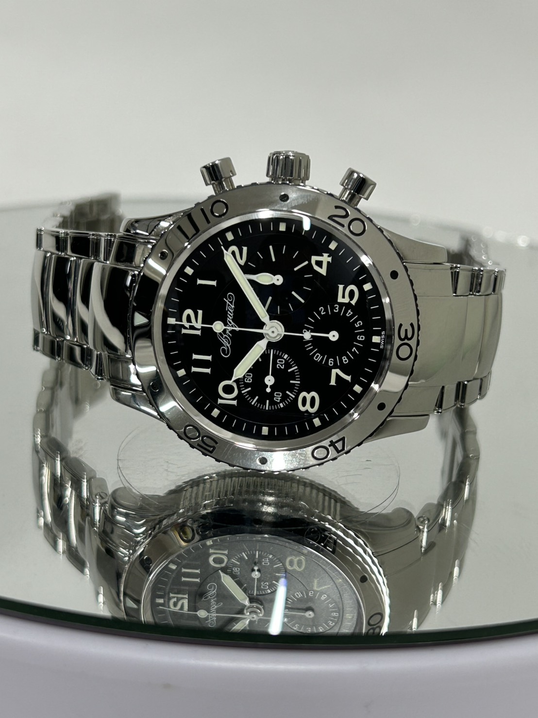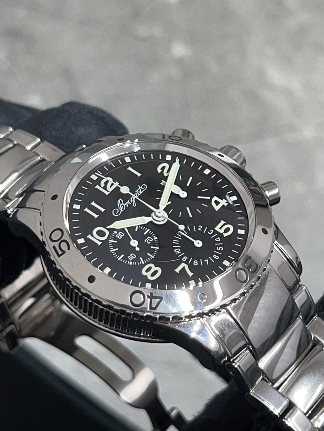 スタイリッシュな黒文字盤にポリッシュ仕上げのベゼルやブレス、ブレゲ独自のコインエッジ、100m防水に機能面でもフライバックを搭載するなど機能性も高く使い勝手のいいモデルとなっております。
