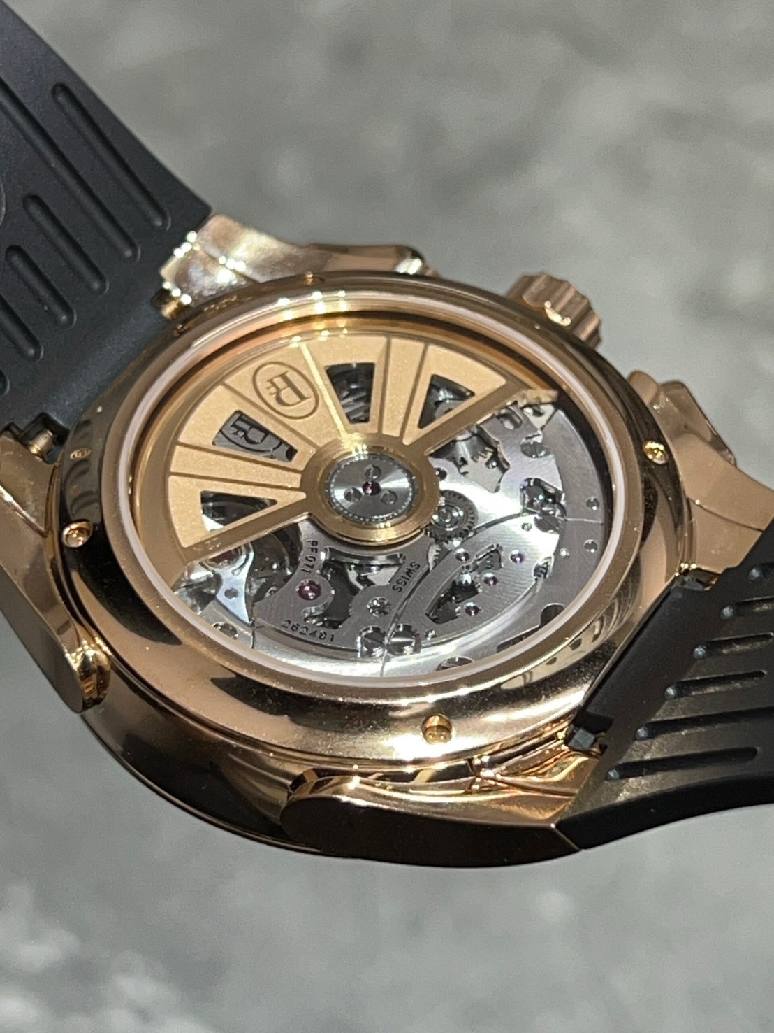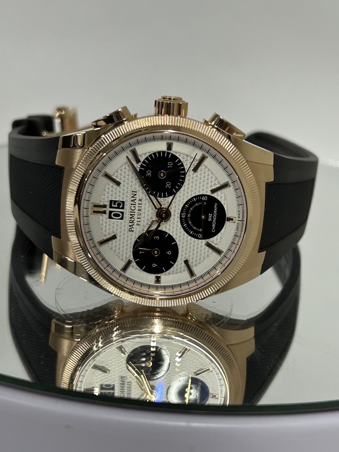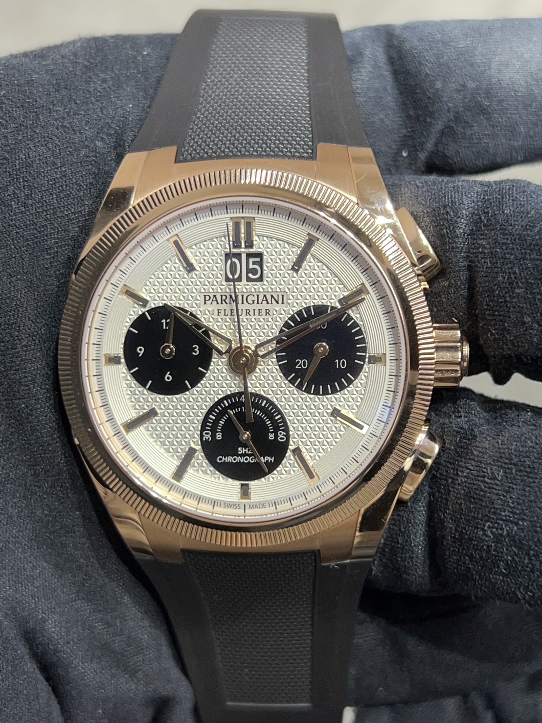1996年に天才時計修復師ミシェル・パルミジャーニが創業したスイスの最高級時計ブランドであるパルミジャーニフルリエ、今回は2020年に登場したラグジュアリースポーツウォッチであるトンダGT、シルバー文字盤にブラックのサブダイヤル、クル・トリアンギュレールギョーシェが施された非常に華やかなローズゴールドモデルが入荷致しました。