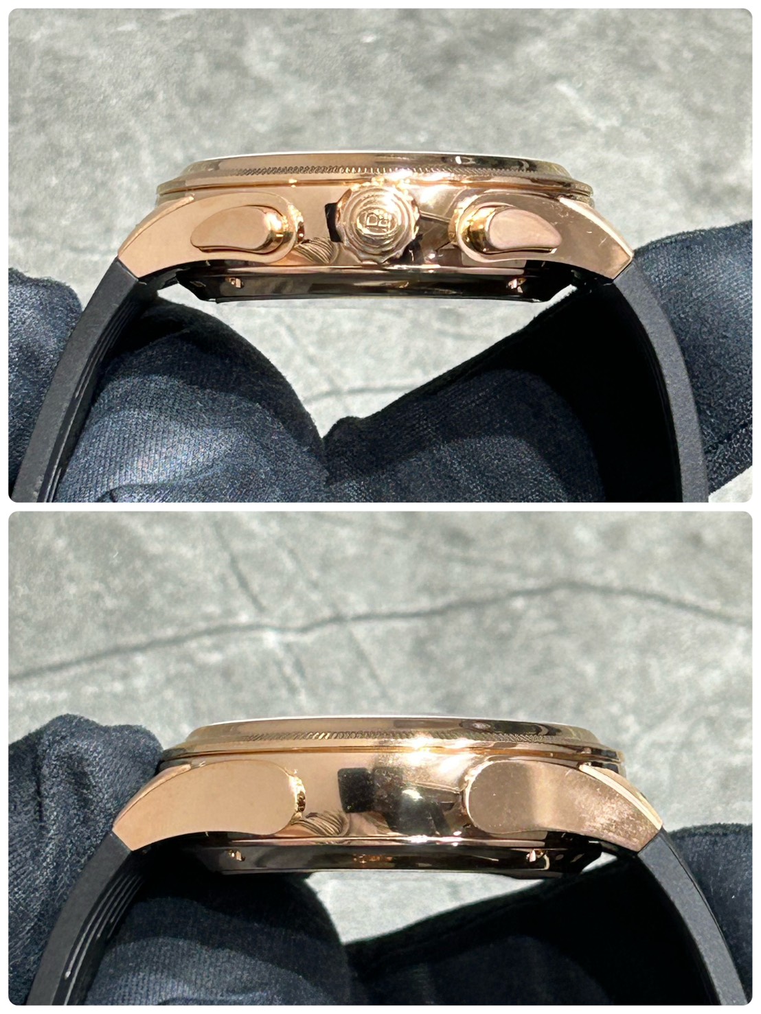 インデックスを囲む縁がローズゴールドとなりキラリと美しい輝きを放ち美しいベゼルはローレット加工となっており細かく線を刻み光の移動を存分に堪能できます。