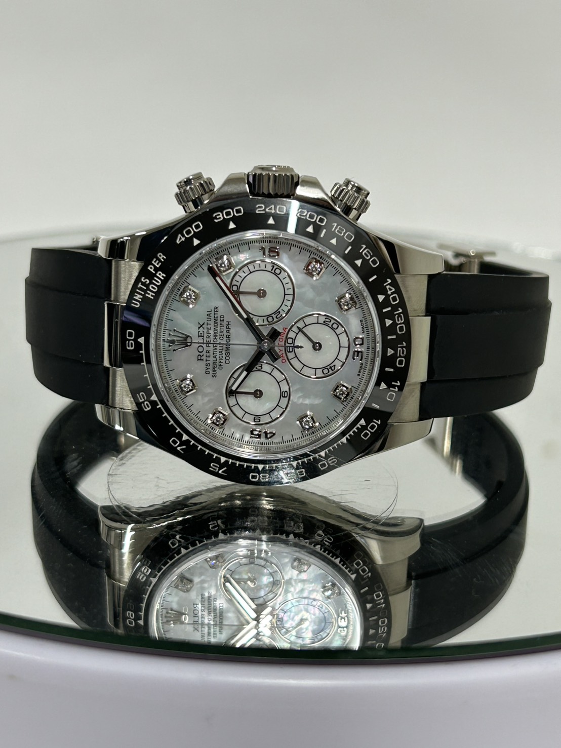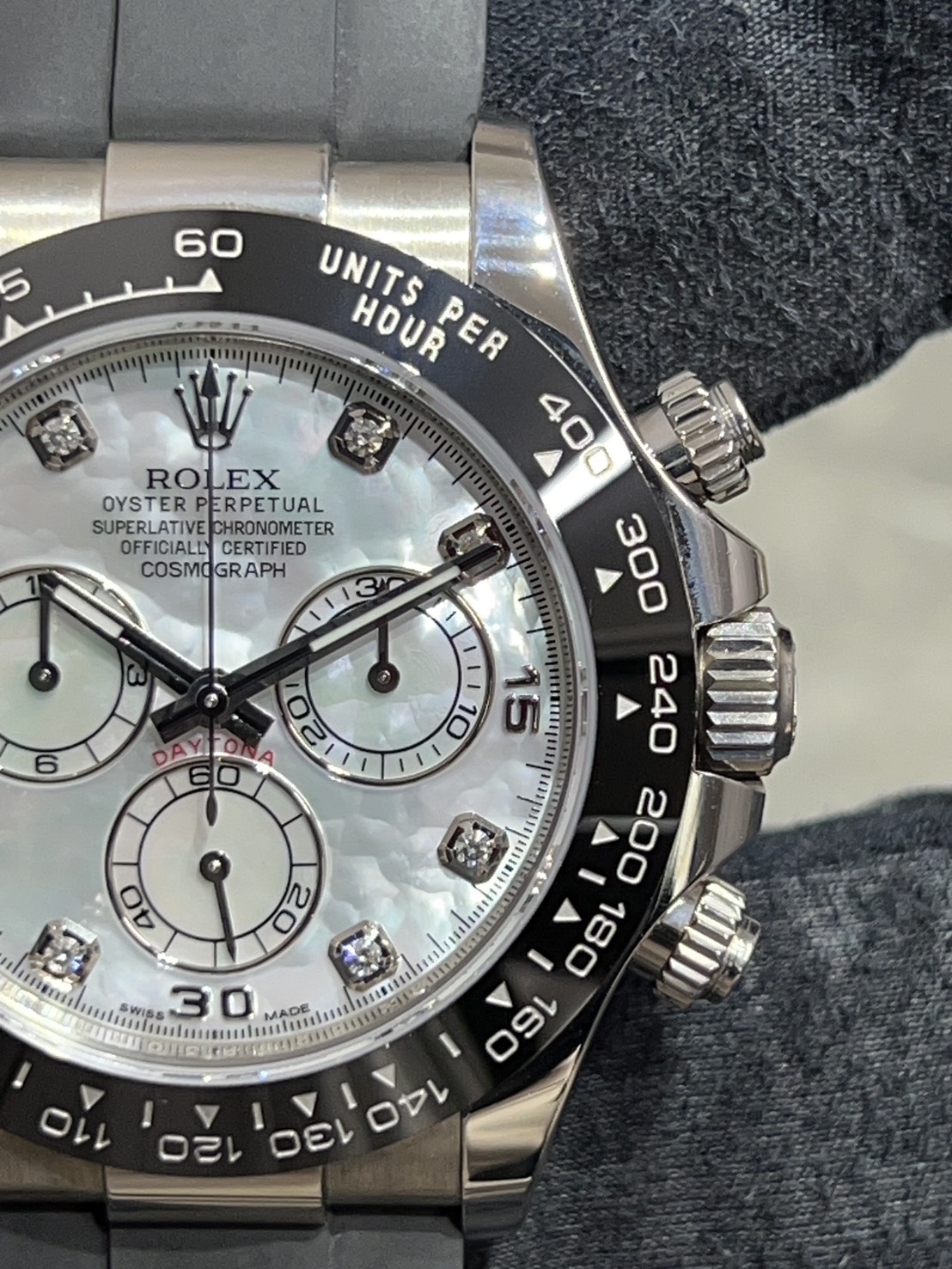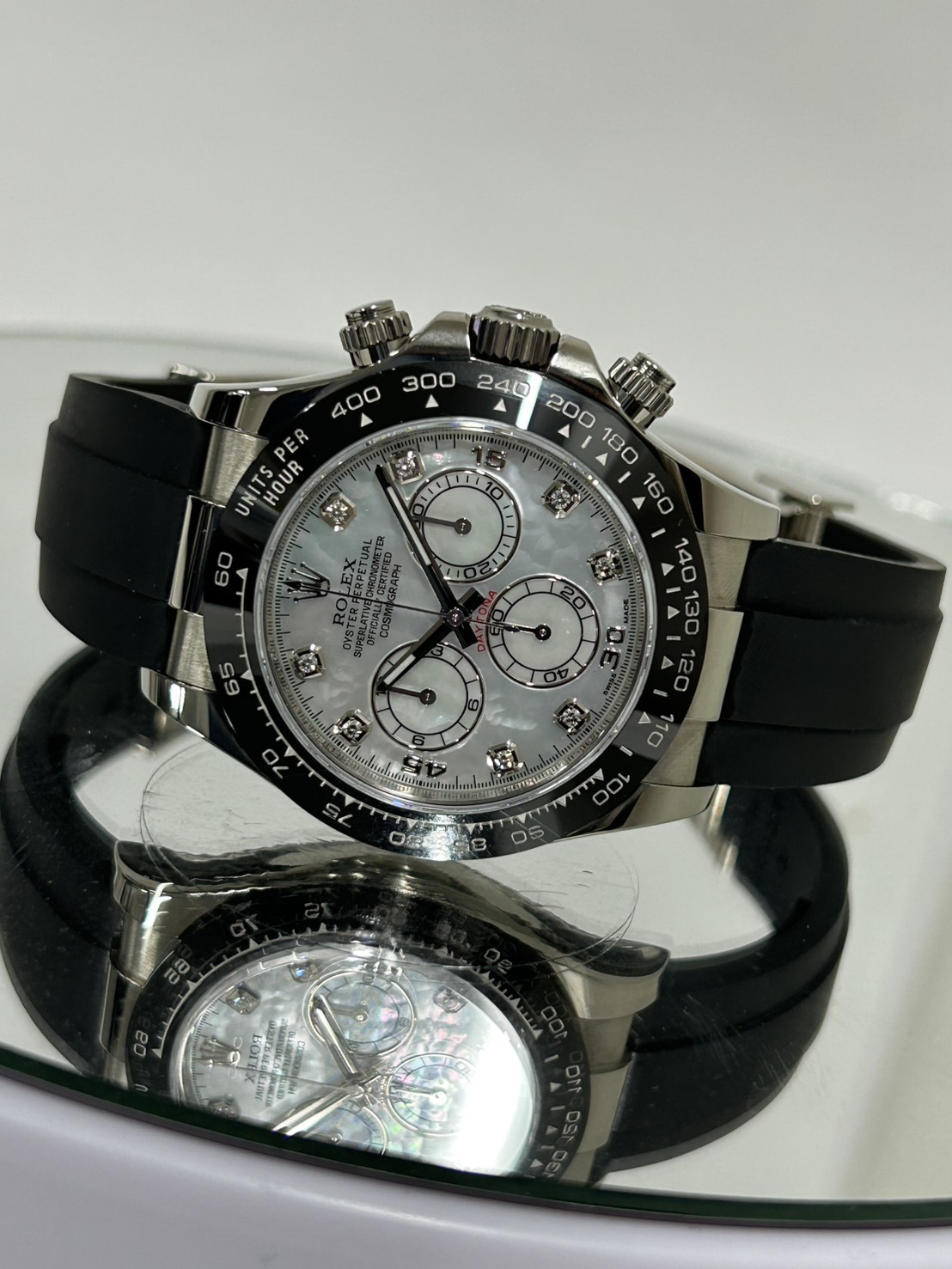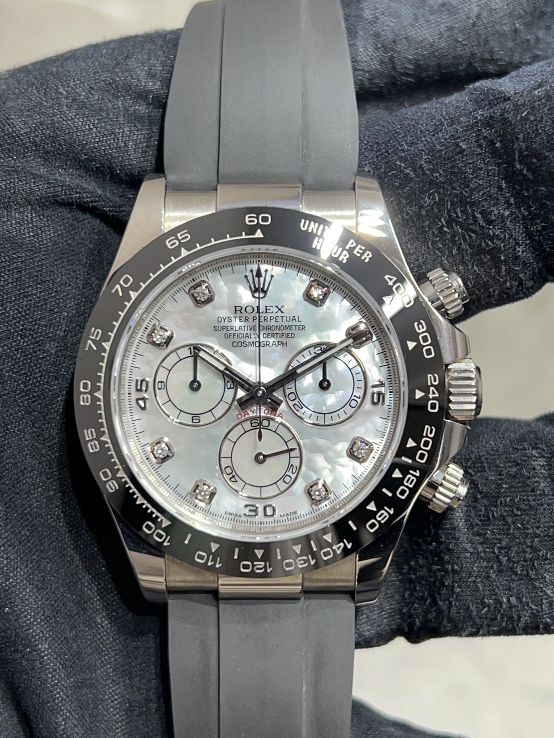 こちらのモデルは8Pダイヤインデックスや時分針の縁もホワイトゴールドとなり光沢のあるセラミックベゼルのメーターも同系色となっております。
