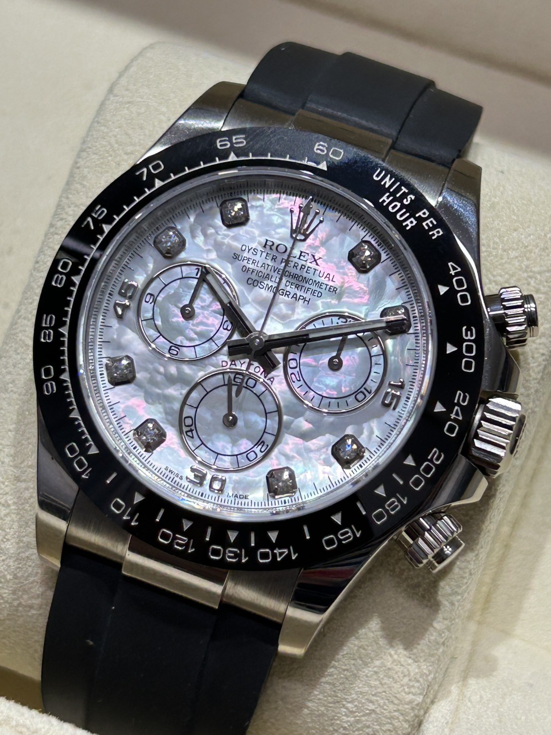 自然物故に二つとない文字盤の模様のホワイトシェル、こちらの固体は弊社が見てきた中で照りが強く角度によって綺麗なプリズム色となっております(5枚目の写真参照)