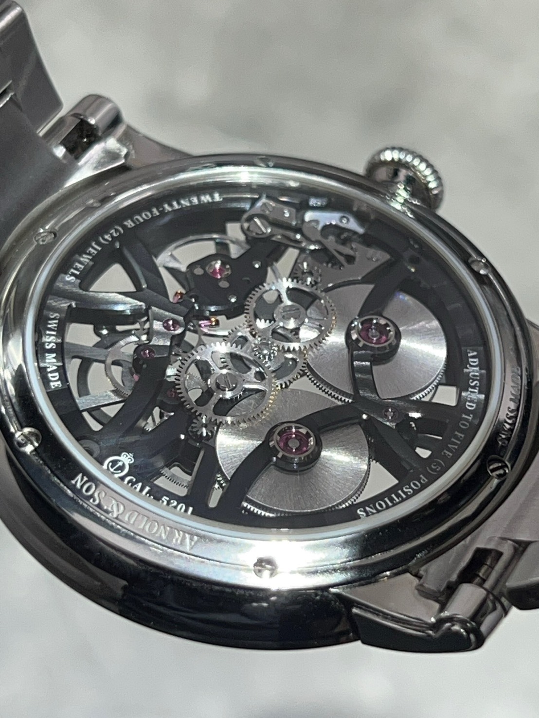 表裏から存分に堪能できるキャリバーA&S5201は7本のブリッジが放射状に広がっており、ツインバレル、テンプ、スモールセコンドなど接続される様を楽しむ事ができます。