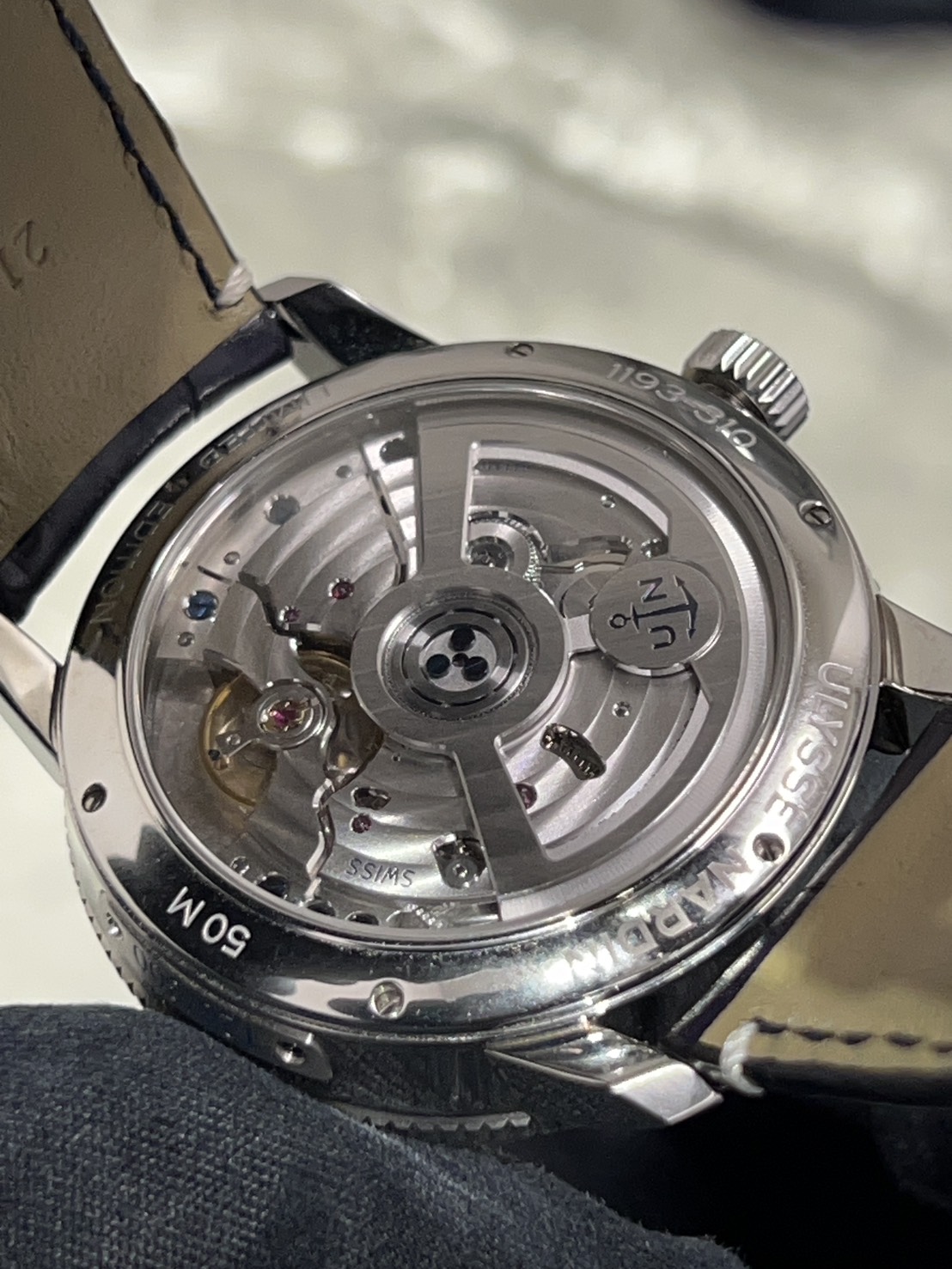 搭載されるCal.UN-119はシリシウムに合成ダイヤモンドを組み合わせる特許技術により耐摩耗性と耐衝撃性が向上した精度の高いものとなっております。