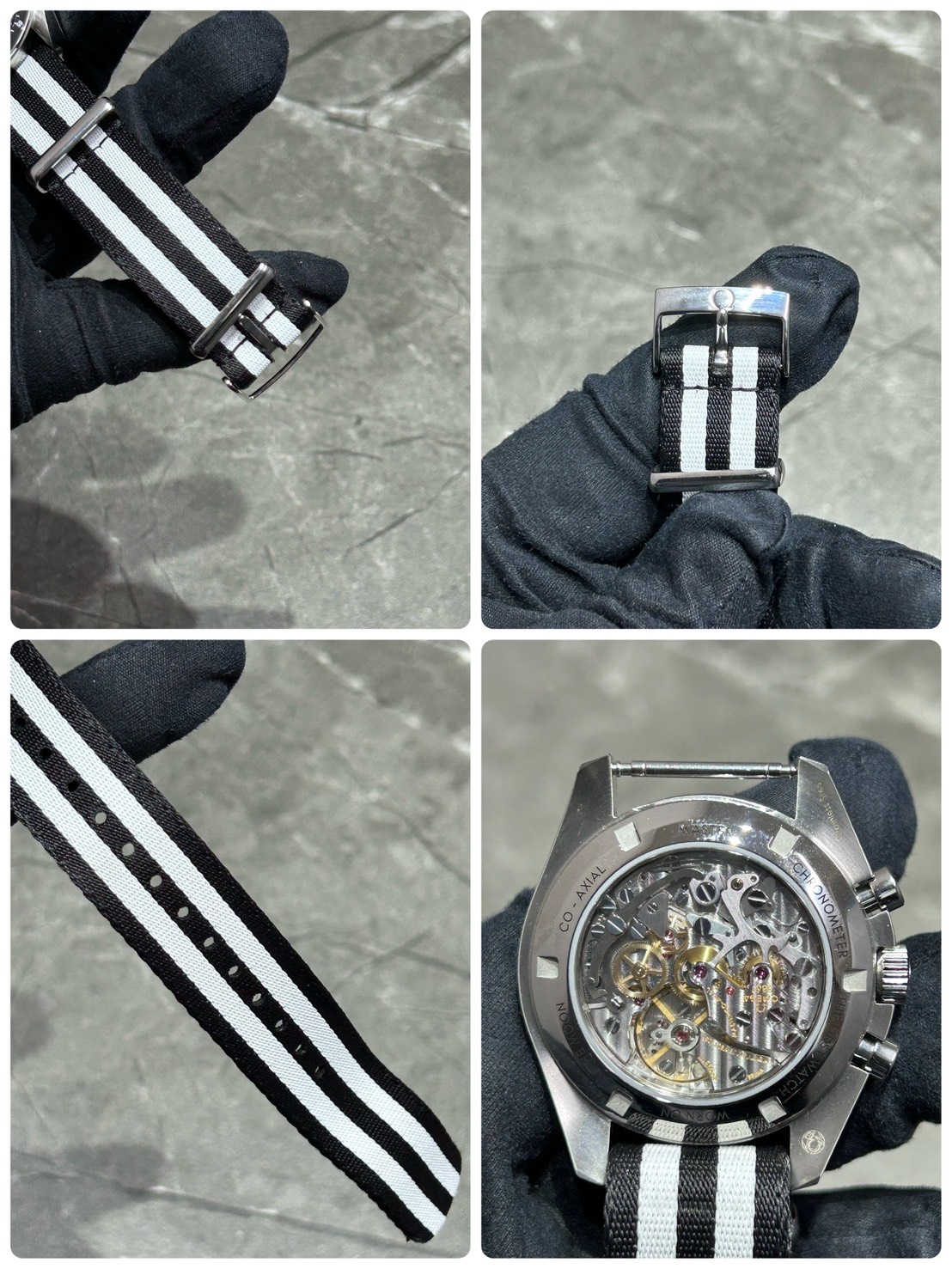 1、本体 2、ステンレスブレス26コマ(フルコマ 未使用) 3、NATOベルト(使用感小) 4、国内保証書 5、クロノメーター証明書 6、内外箱