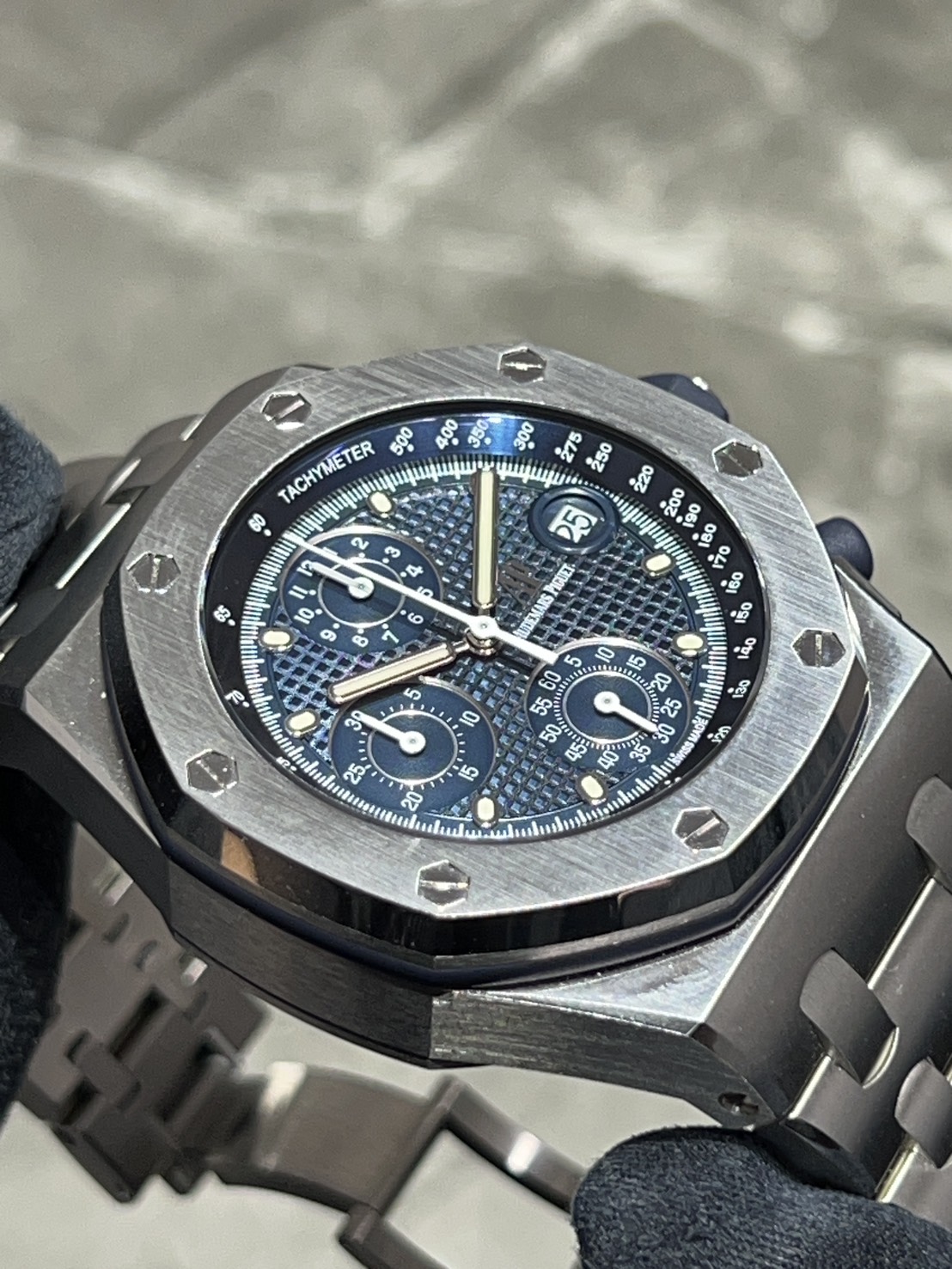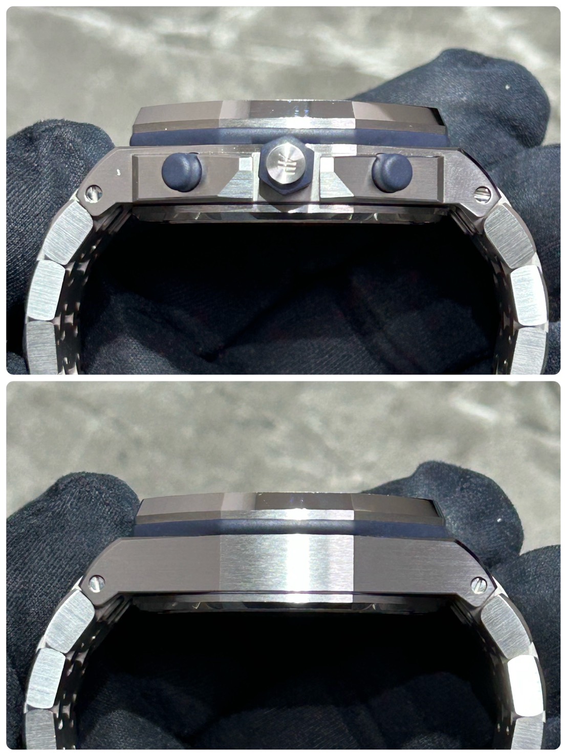 八角形ベゼルと露出したビス、力強いケースライン、そして深みのあるナイトブルー、クラウド50カラーのプチタペストリーダイヤルとスポーティでありながら洗練された雰囲気となっております。