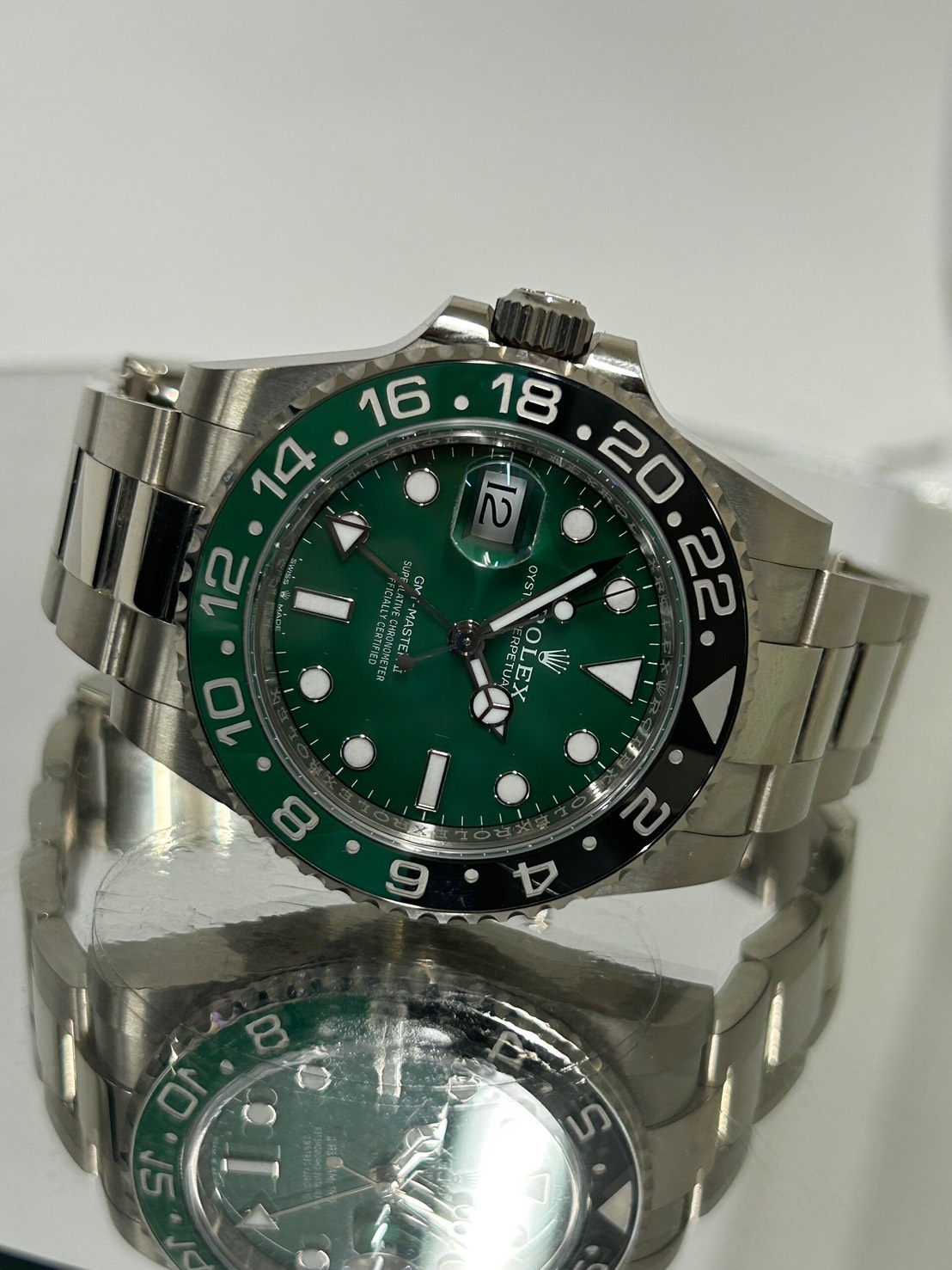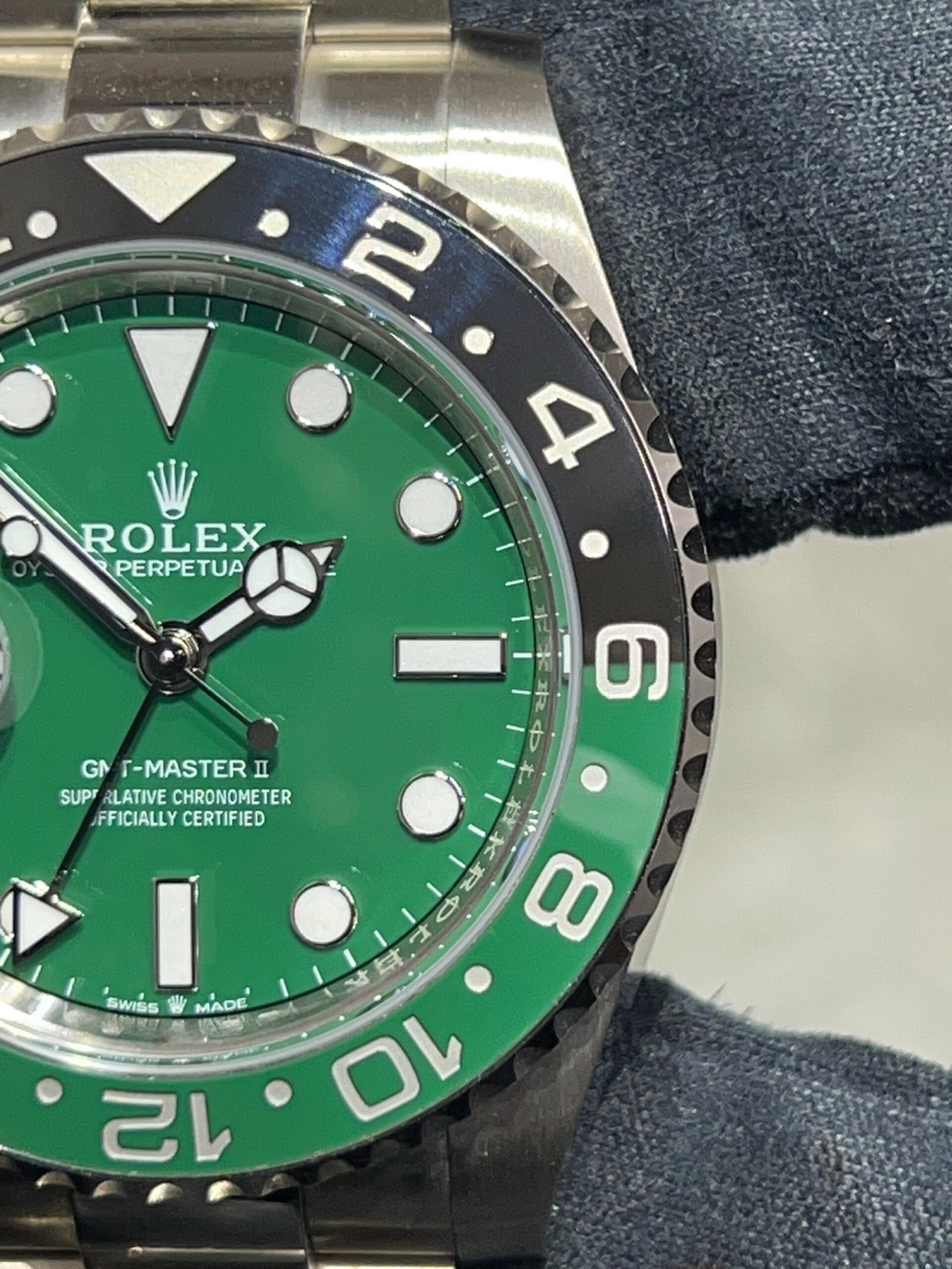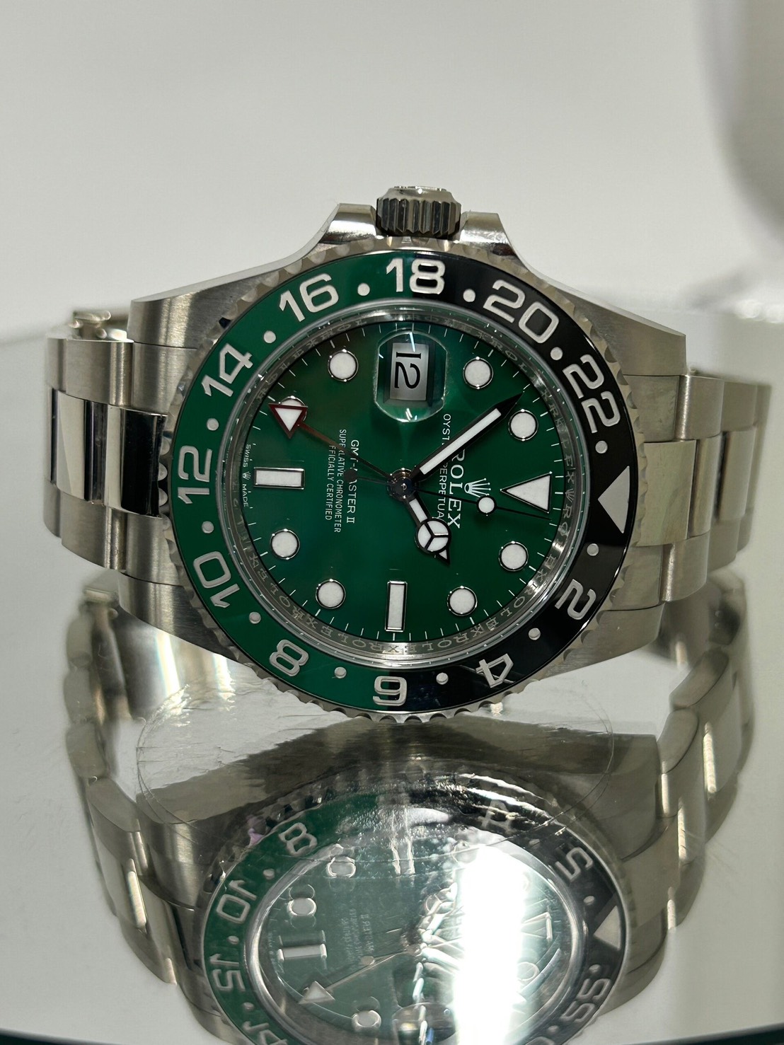グリーンとブラックの光沢あるツートンベゼルにグリーンセラミックの文字盤、そしてスポーティな三連ブレスで大変スタイリッシュなモデルになり、ホワイトゴールド素材の為非常に重厚感のある付け心地になります。