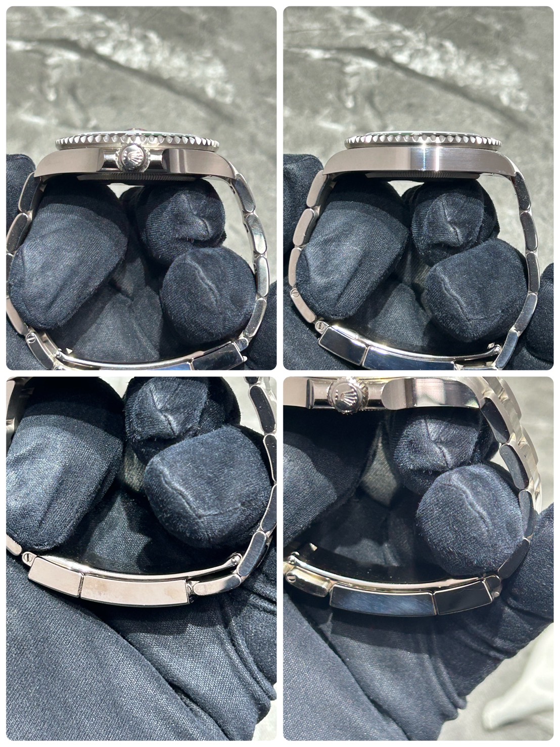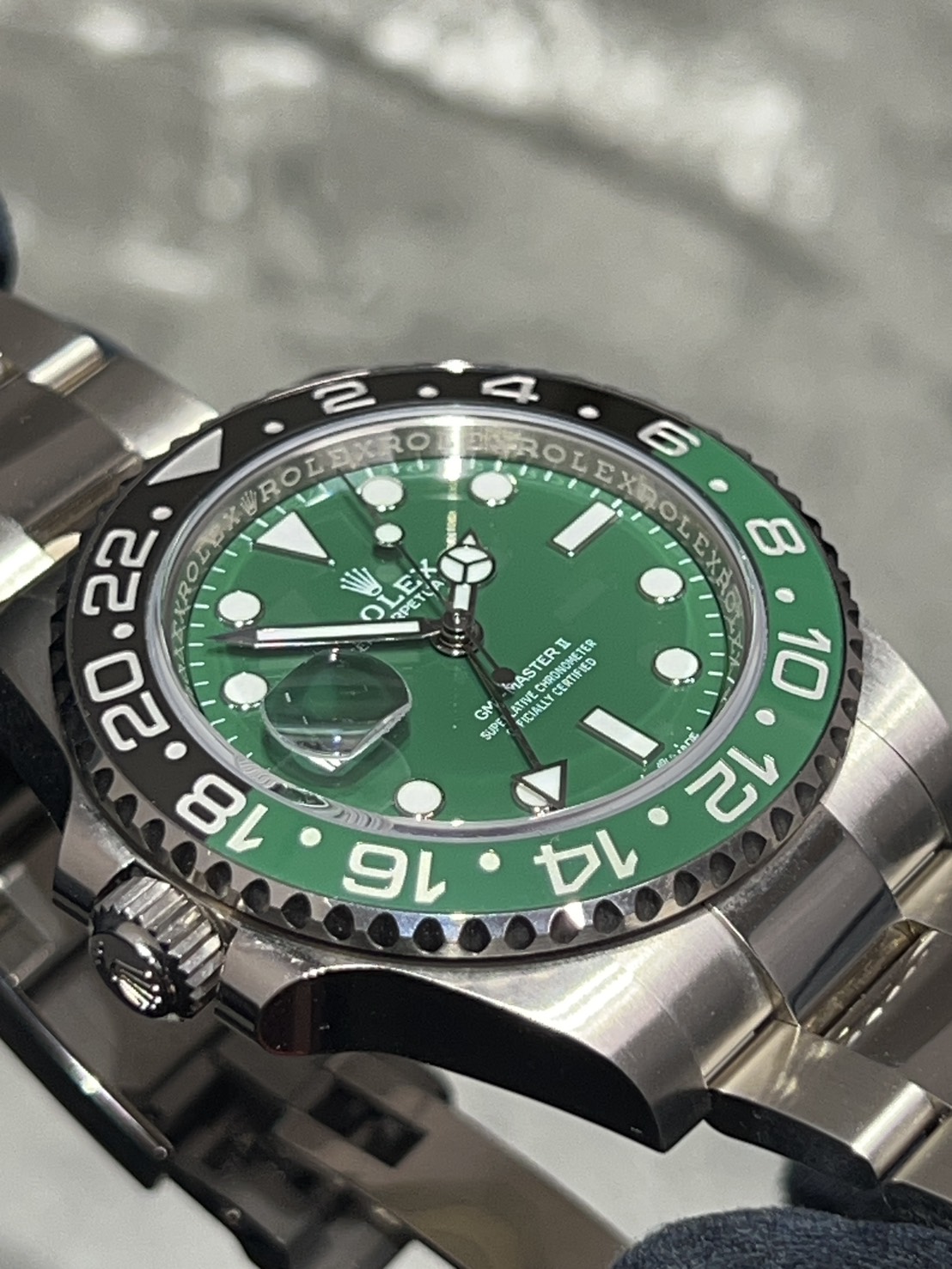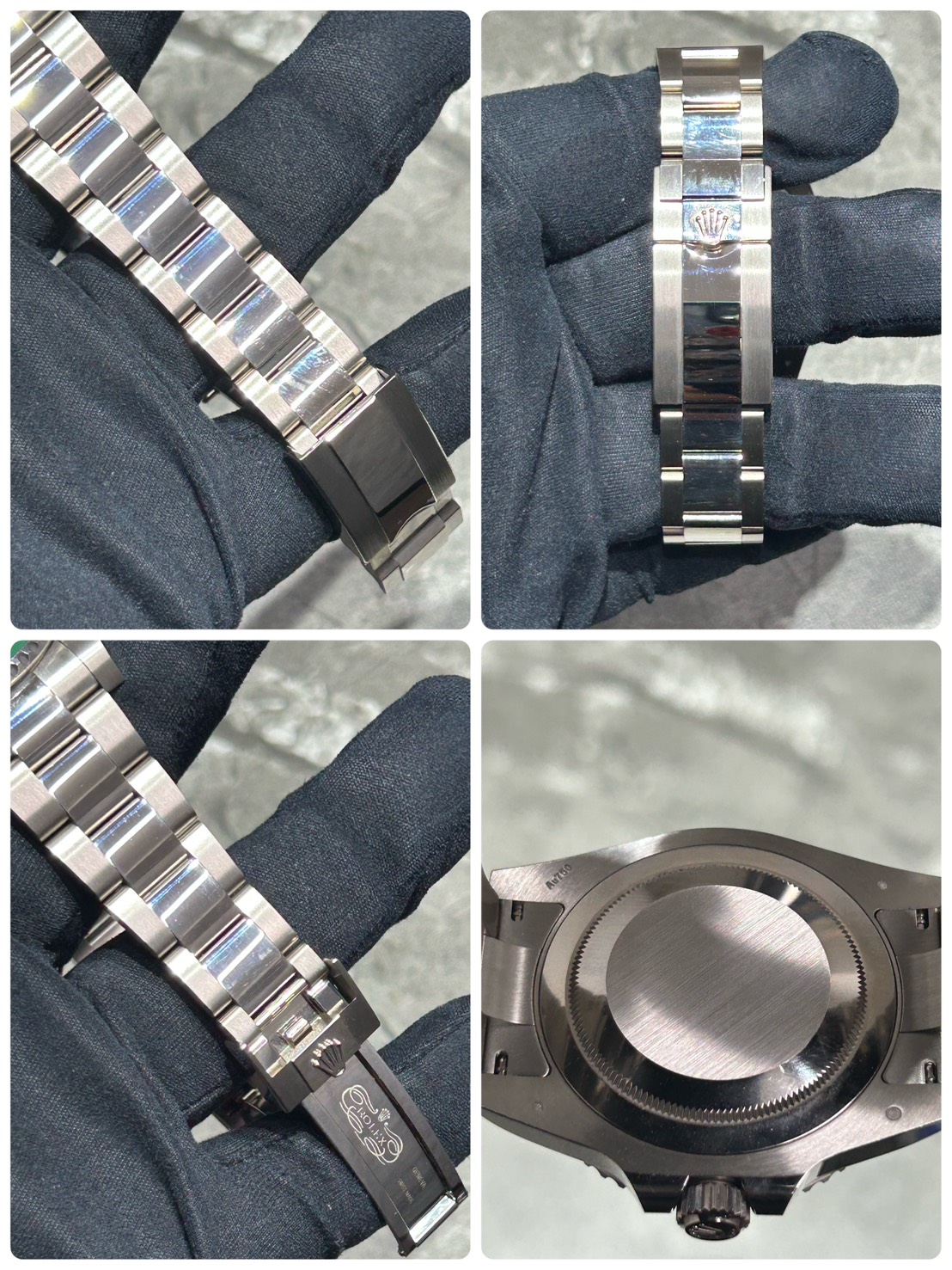 グリーンとブラックの光沢あるツートンベゼルにグリーンセラミックの文字盤、そしてスポーティな三連ブレスで大変スタイリッシュなモデルになり、ホワイトゴールド素材の為非常に重厚感のある付け心地になります。