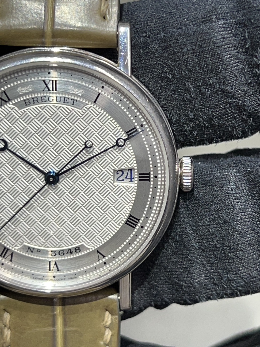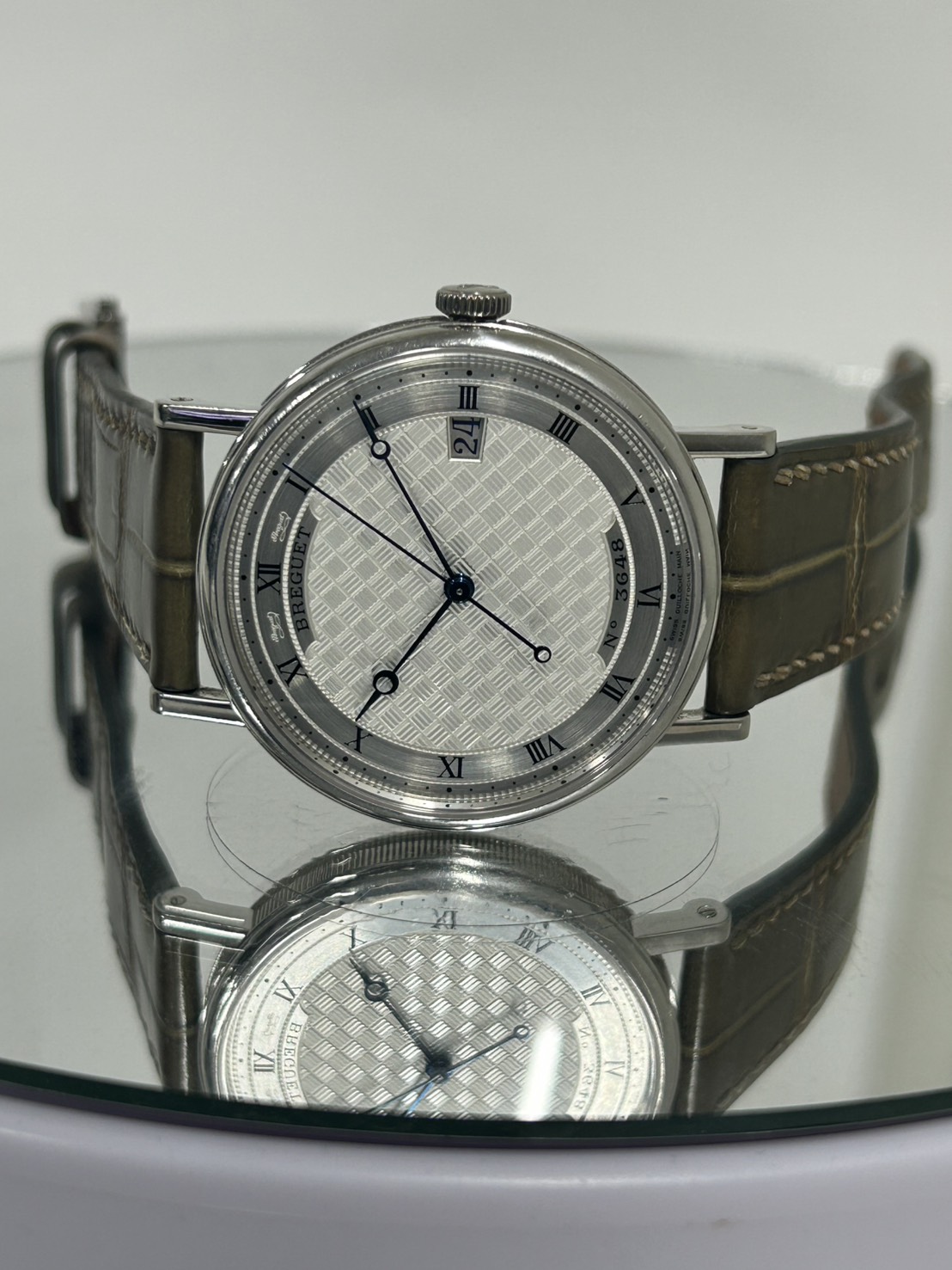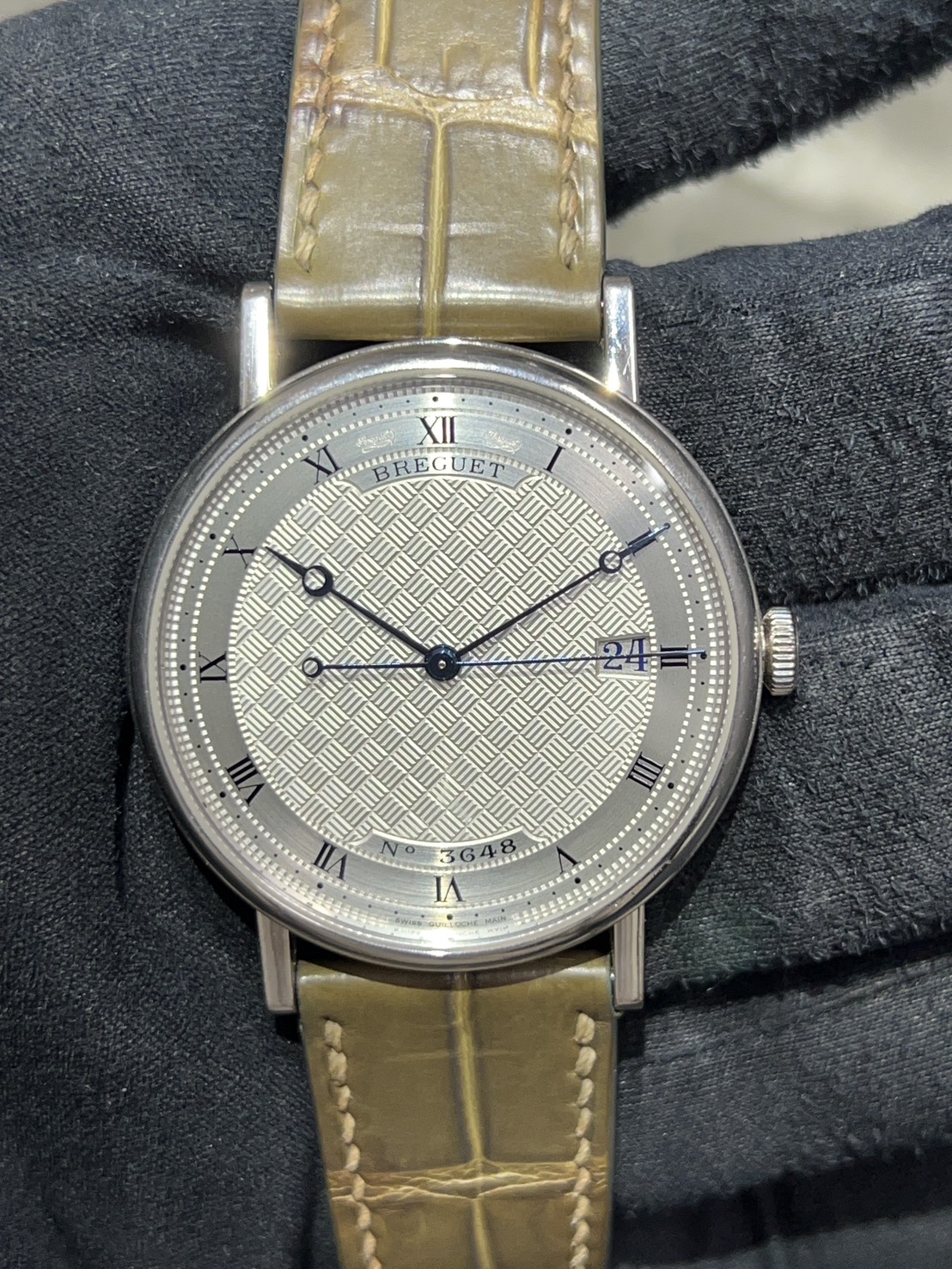 ブレゲ針、ケースサイドのコインエッジなどブレゲらしさをふんだんに取り入れ、ホワイトゴールドケースで高級感のあるモデルとなっております。