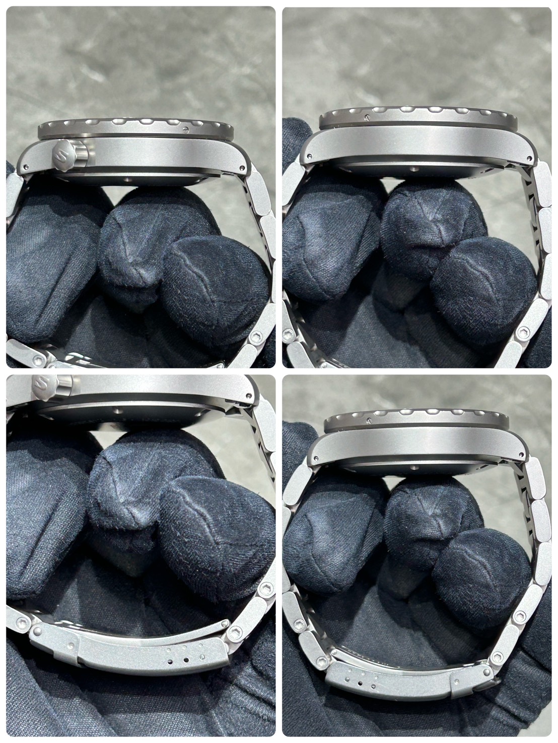 最大の特徴でケース素材はドイツ潜水艦鋼となっており、実際に潜水艦の外殻に使用される素材と同系統の特殊鋼で、一般的なステンレスよりも海水への耐食性が高く、無骨で重厚な質感となっております。
