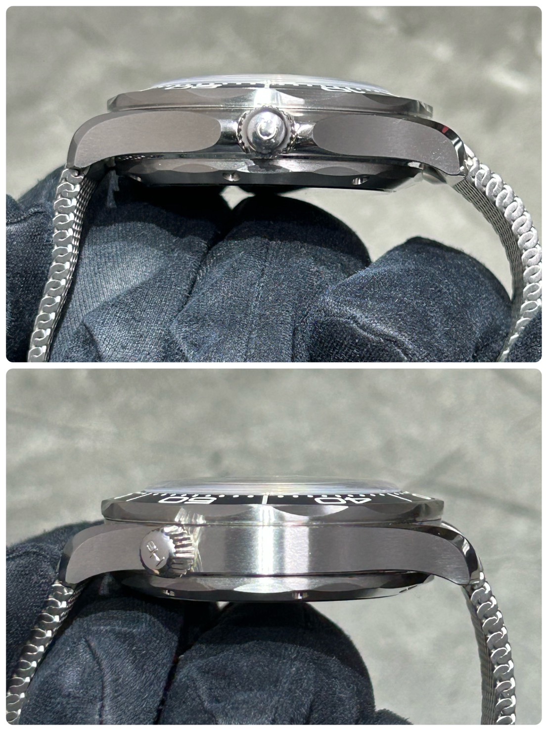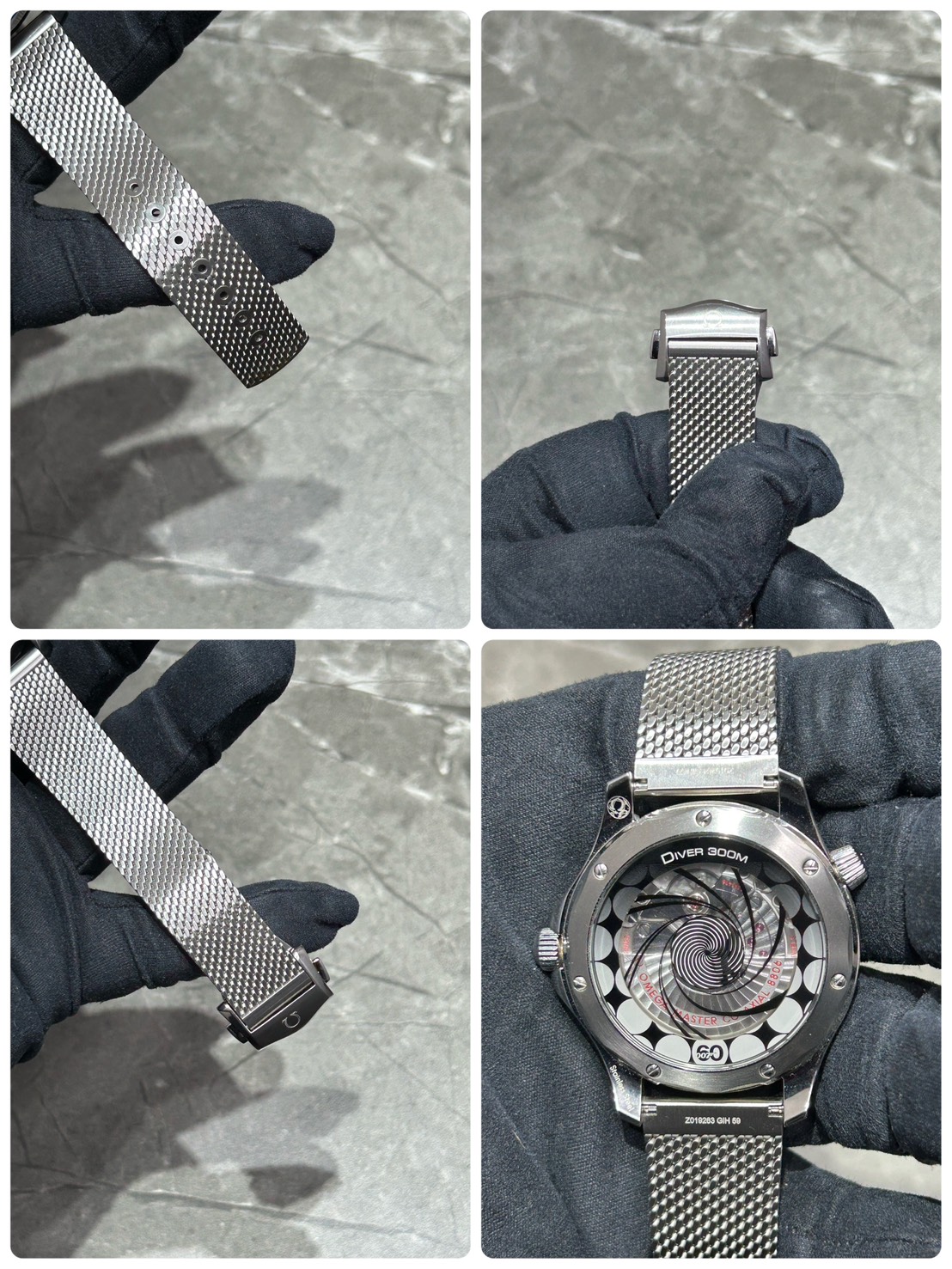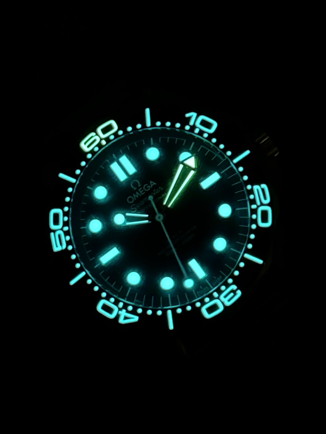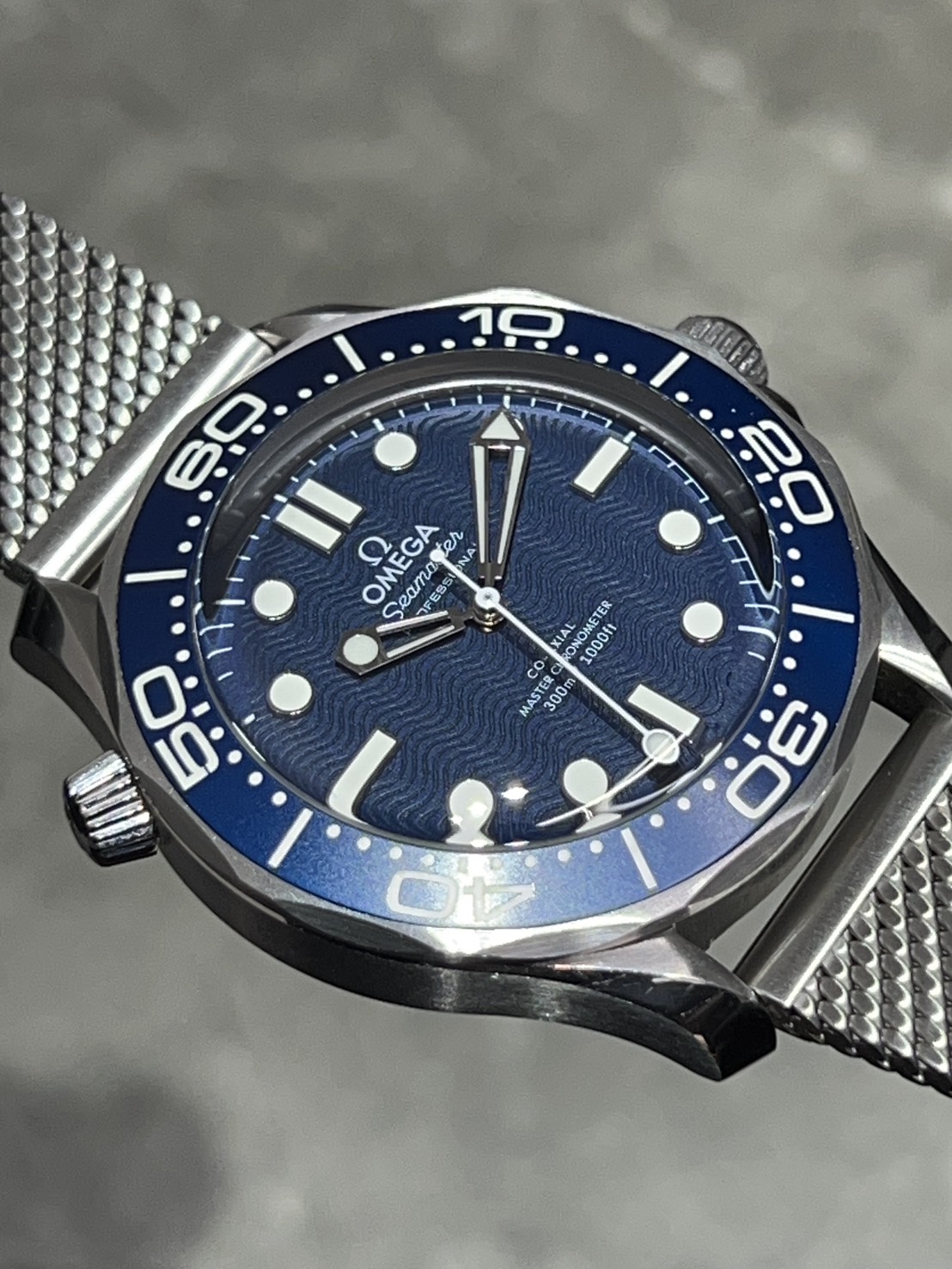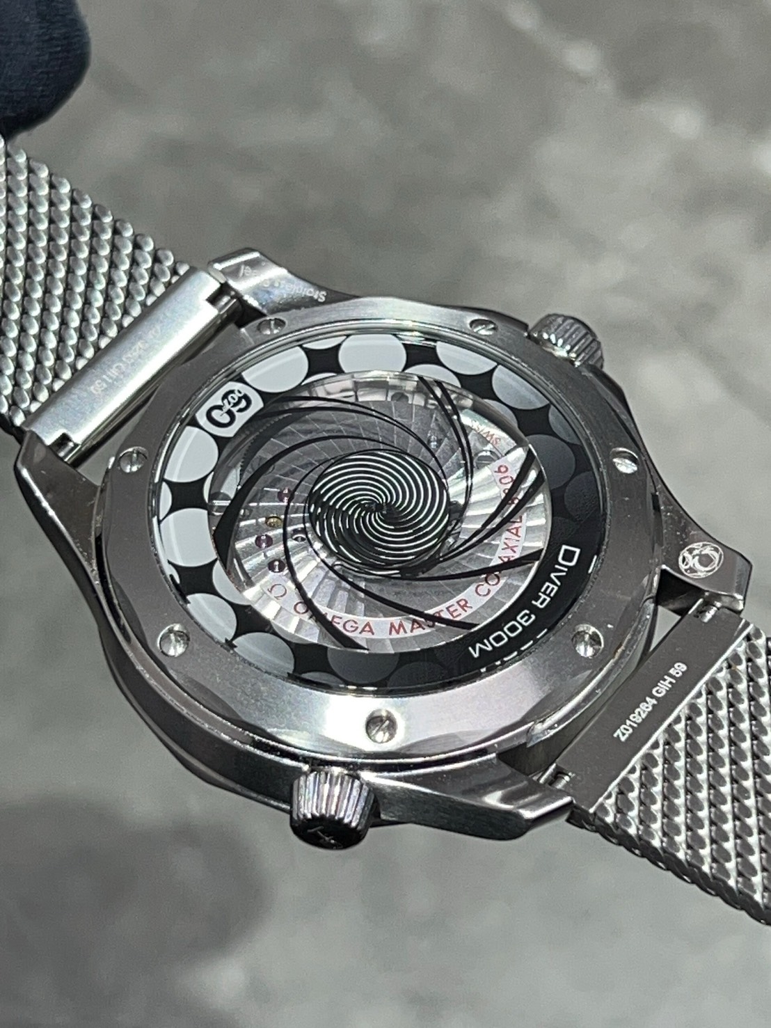 ジェームズ・ボンドが身に着けた「シーマスター ダイバー300M」のインスピレーションモデルとなっておりベゼルの12時部分には逆三角形ではなく60の数字が添えられ、文字盤は映画のタイトルにもあたる「ゴールデンアイ」ブルーとなっております。