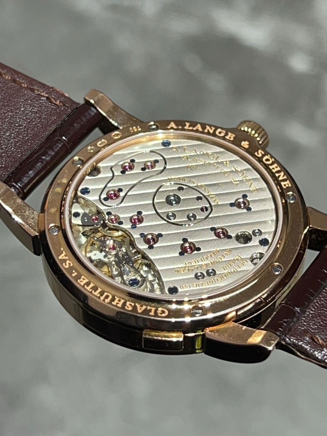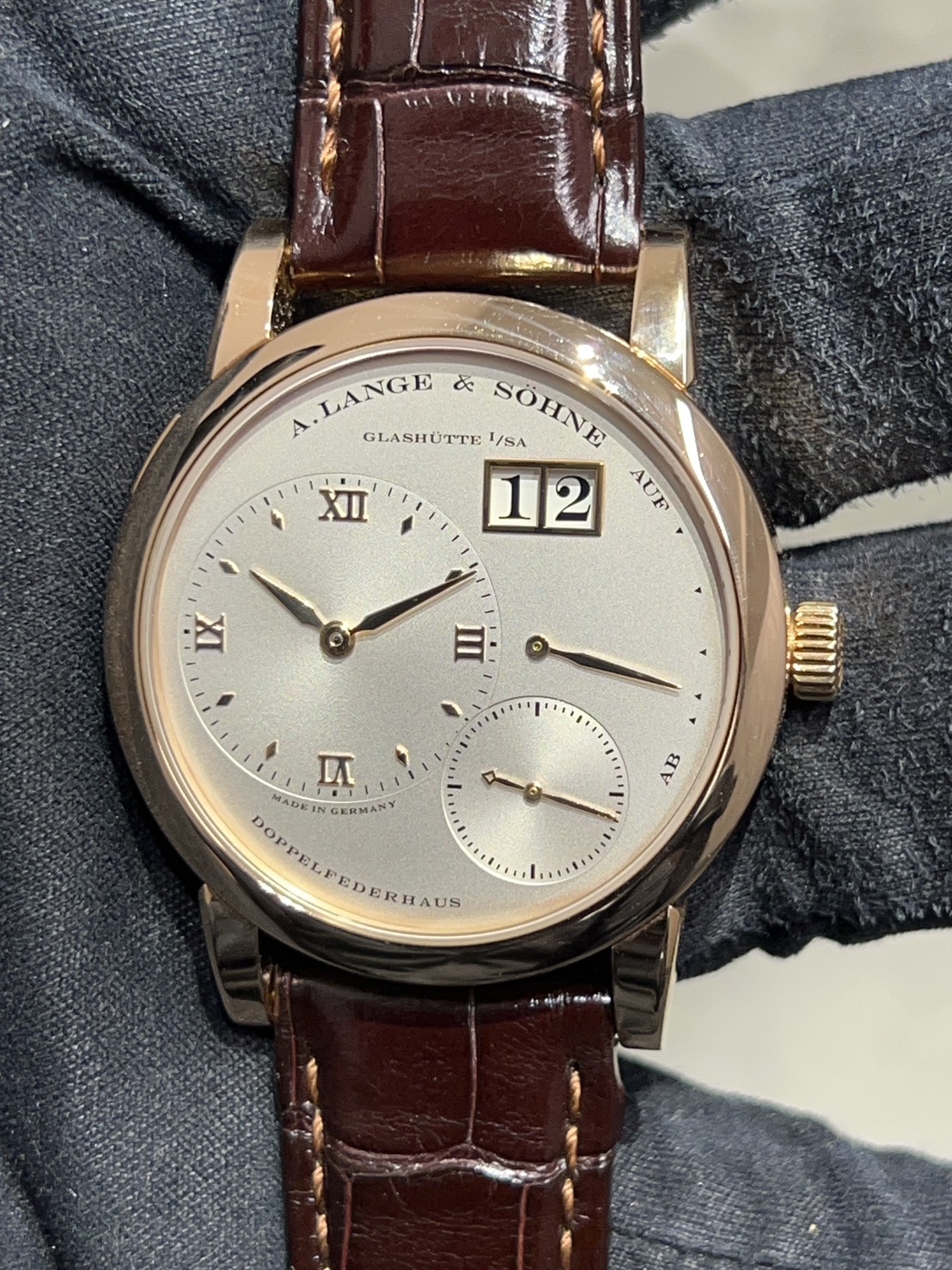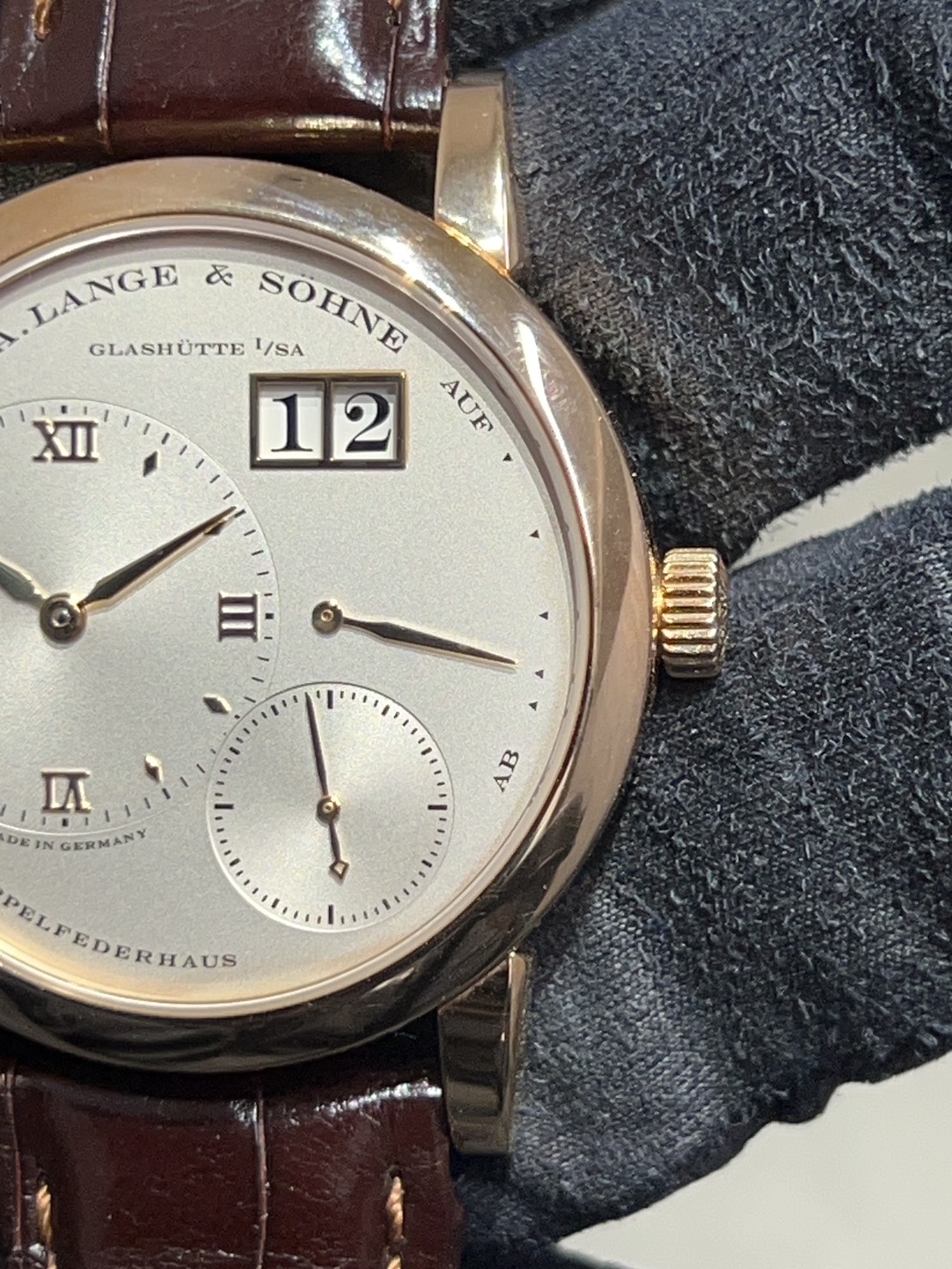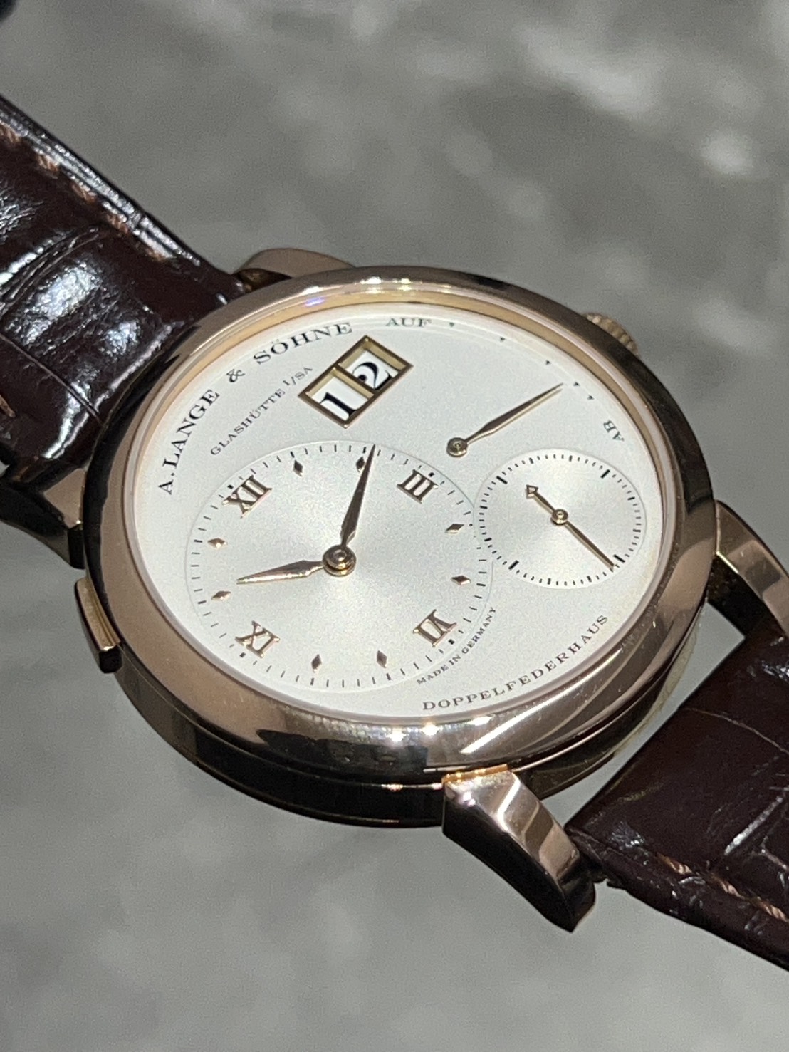 ピンクゴールドのケースに優しいシルバー文字盤の組み合わせ、各表示機能をオフセンターに配置して二等辺三角形を形成しており独特な佇まいが非常に高級感があるピンクゴールドのランゲ1が入荷致しました。