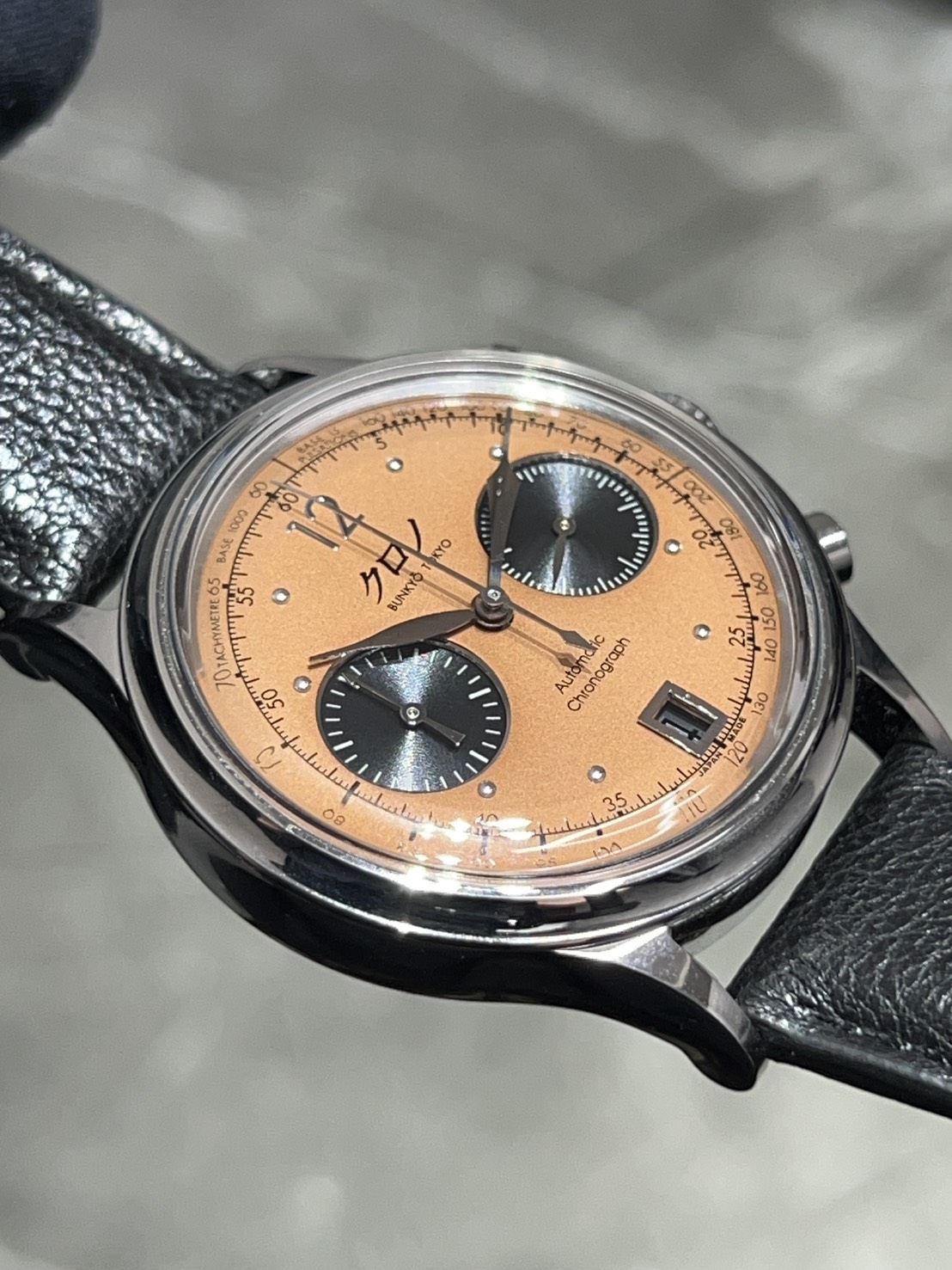 38㎜の馴染みやすいケースに文字盤は濃いサーモンダイヤルにブラックカウンター、ドーム型のガラス風防と落ち着きのあるデザインでジャケットなどの相性も抜群となっております。