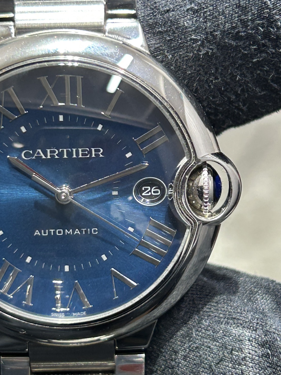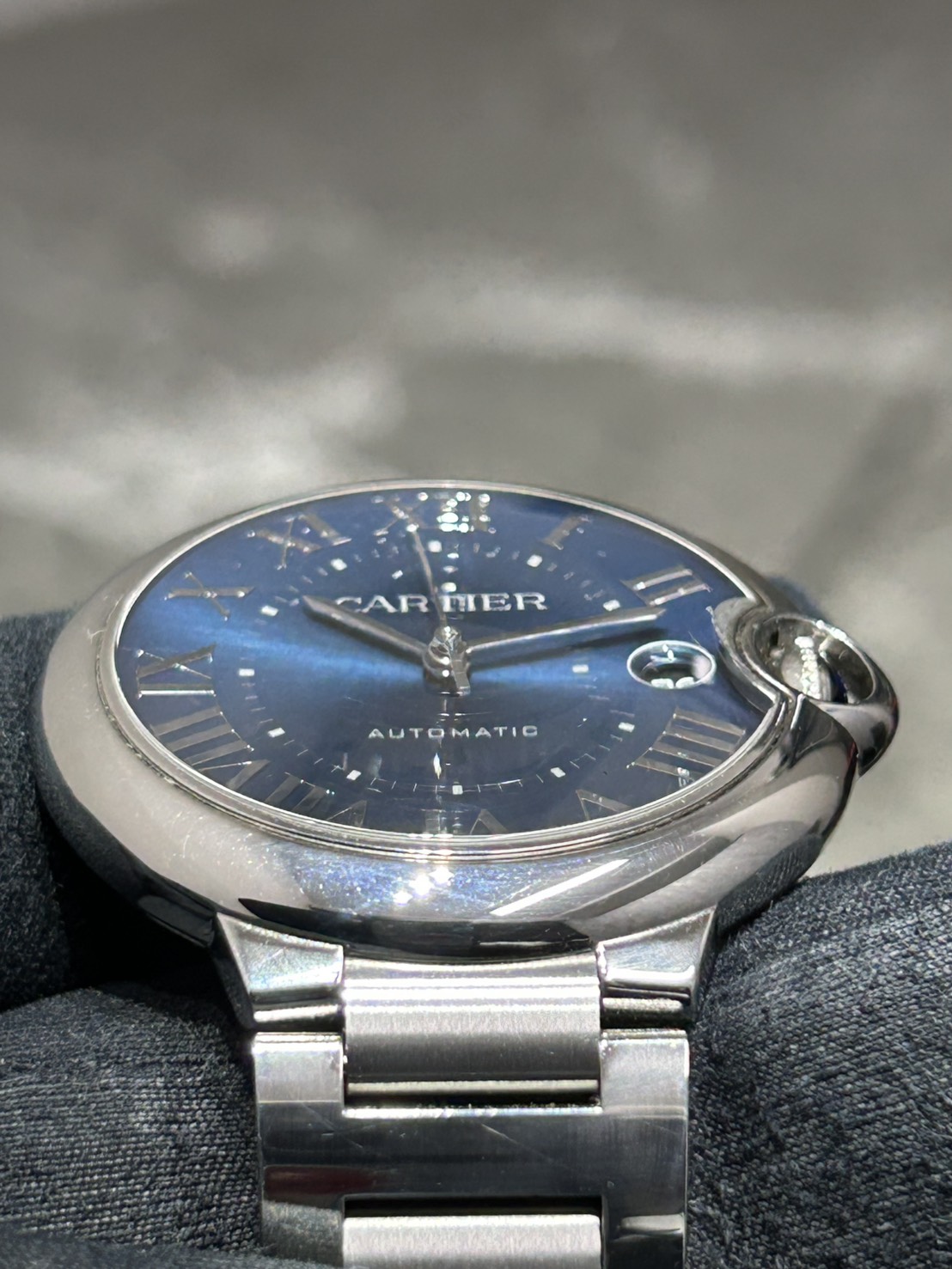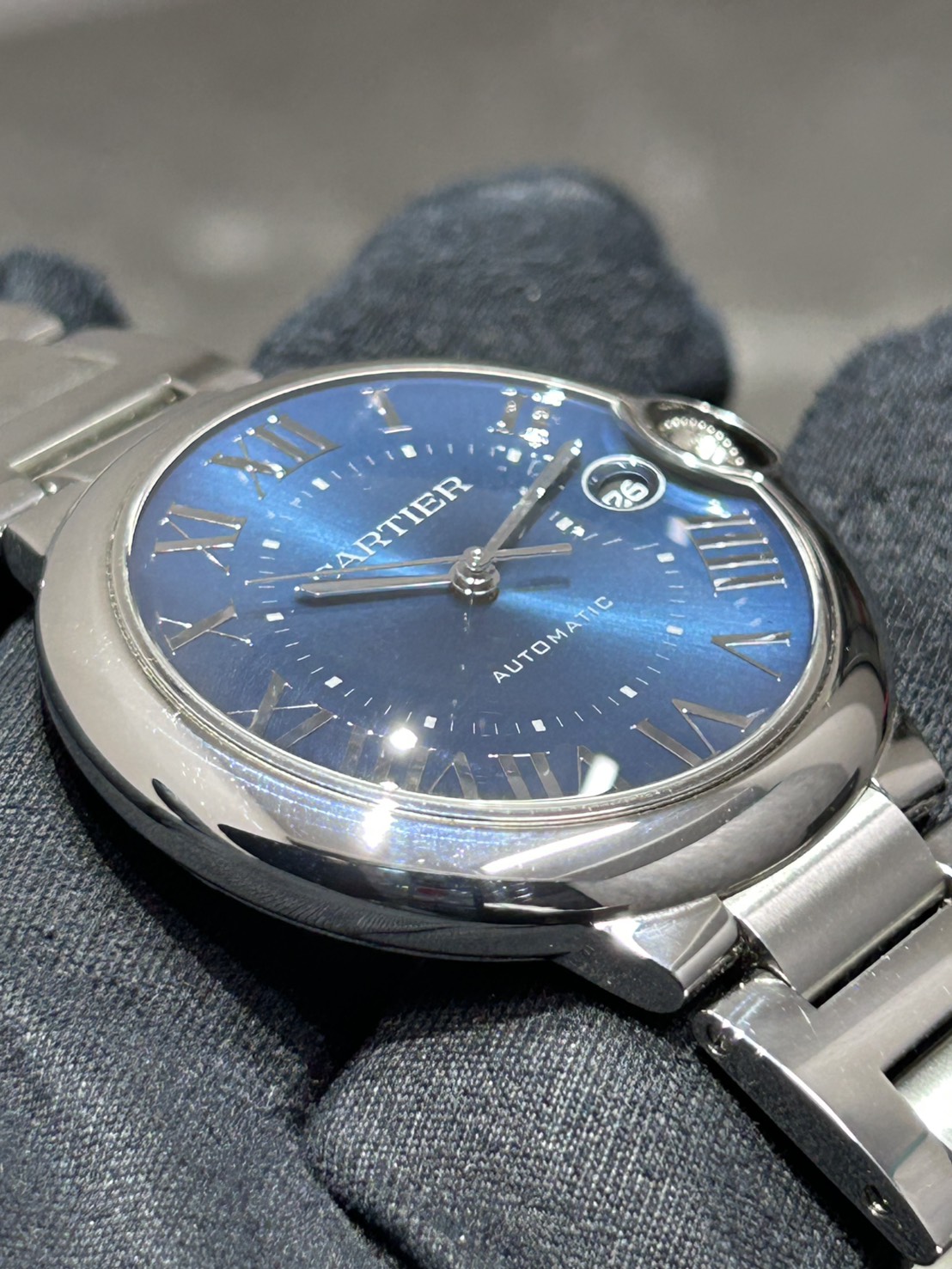 ケースはステンレス製40㎜となりダイヤルは美しいブルーサンレイにカルティエらしいローマインデックスで高貴な印象でございます。