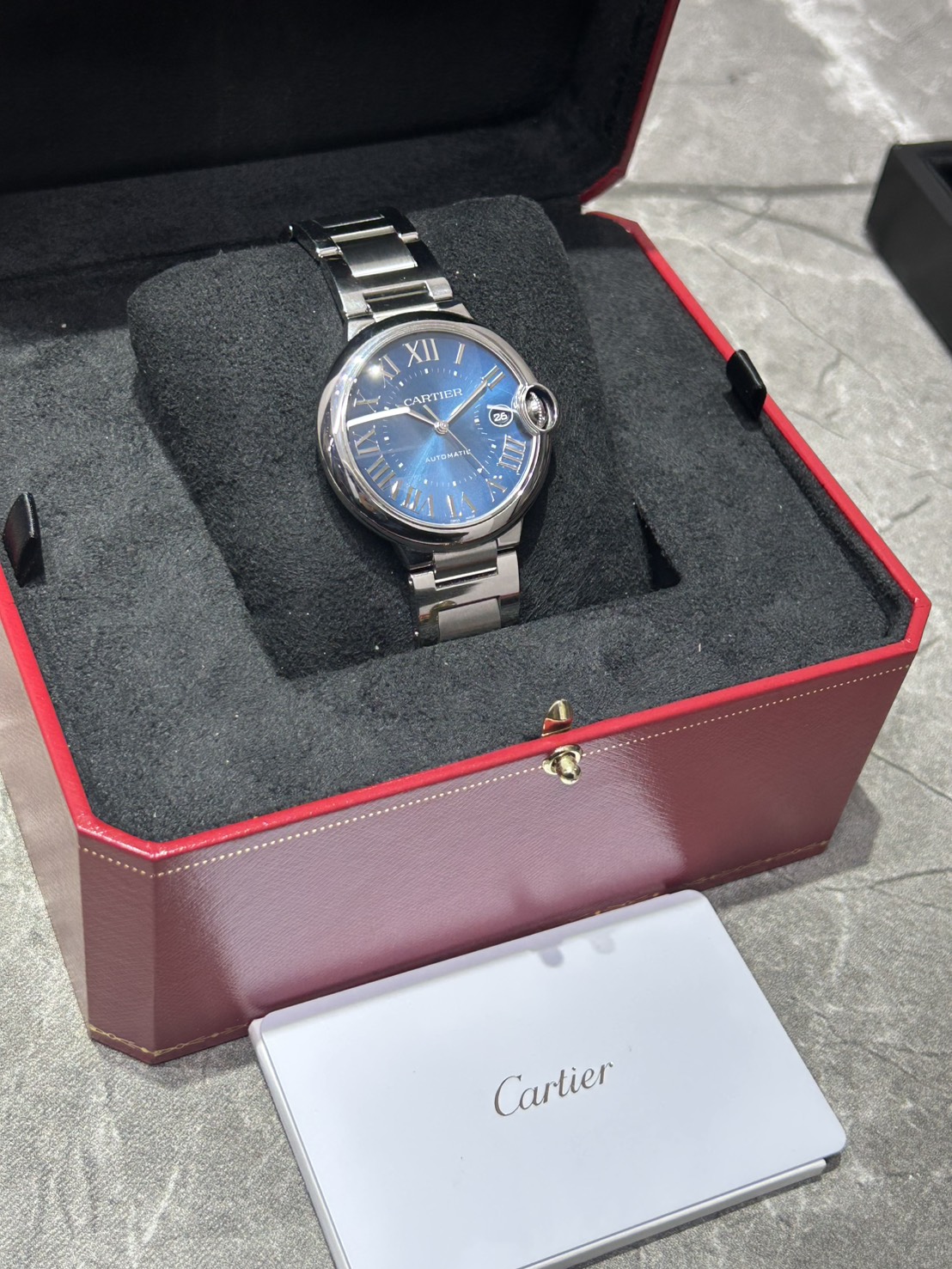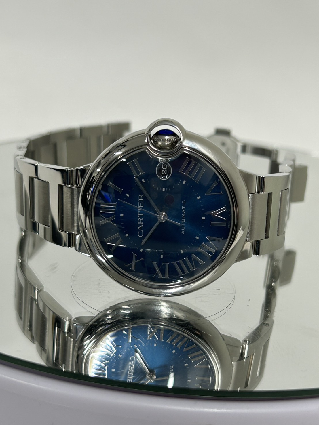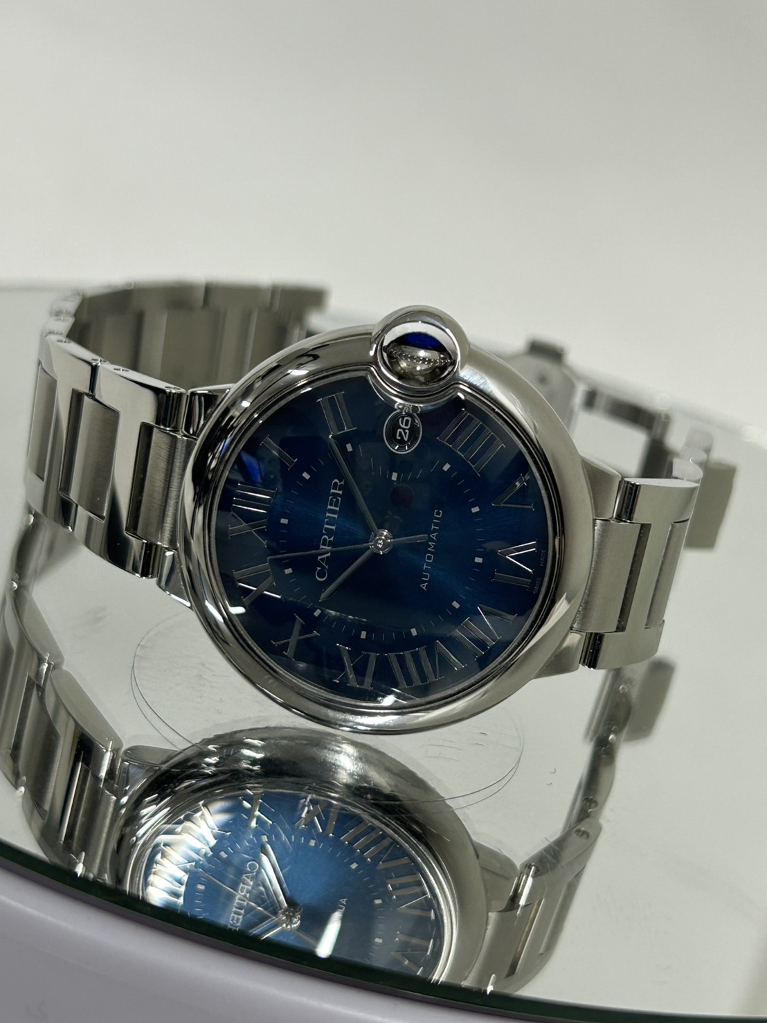 ケースはステンレス製40㎜となりダイヤルは美しいブルーサンレイにカルティエらしいローマインデックスで高貴な印象でございます。