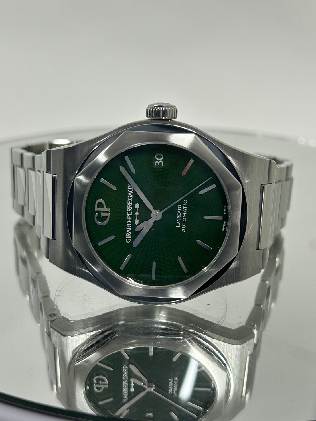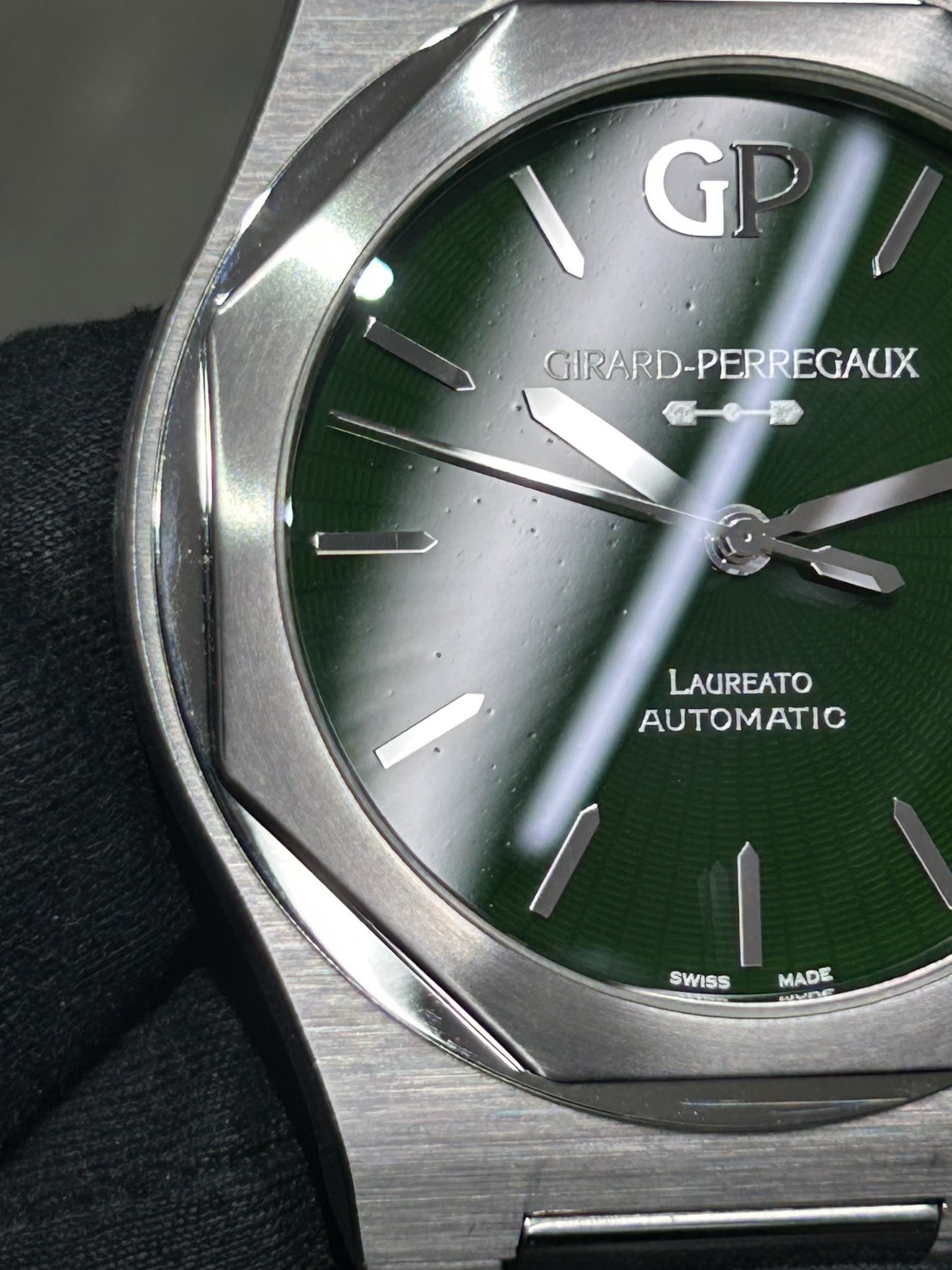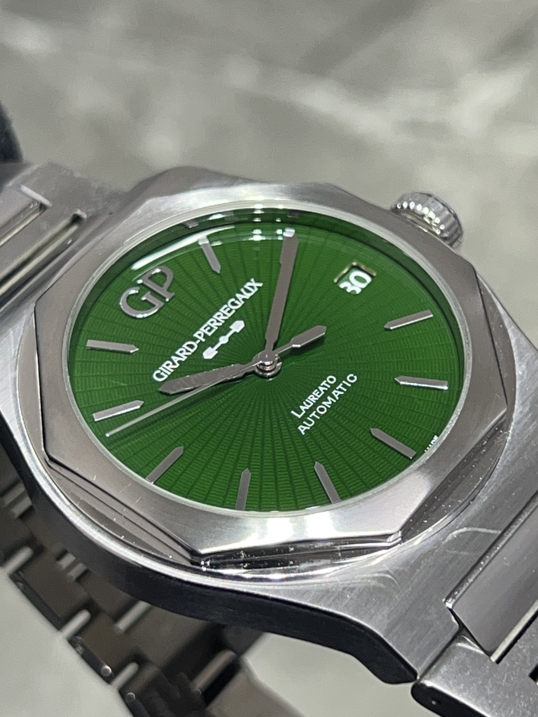 深みのあるグリーン文字盤は自社製のグラン・フー エナメルとなっており、よく見るとサンバースト風のギョーシェ模様も入っており非常に美しいグリーンとなります。