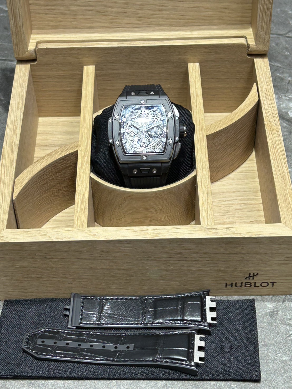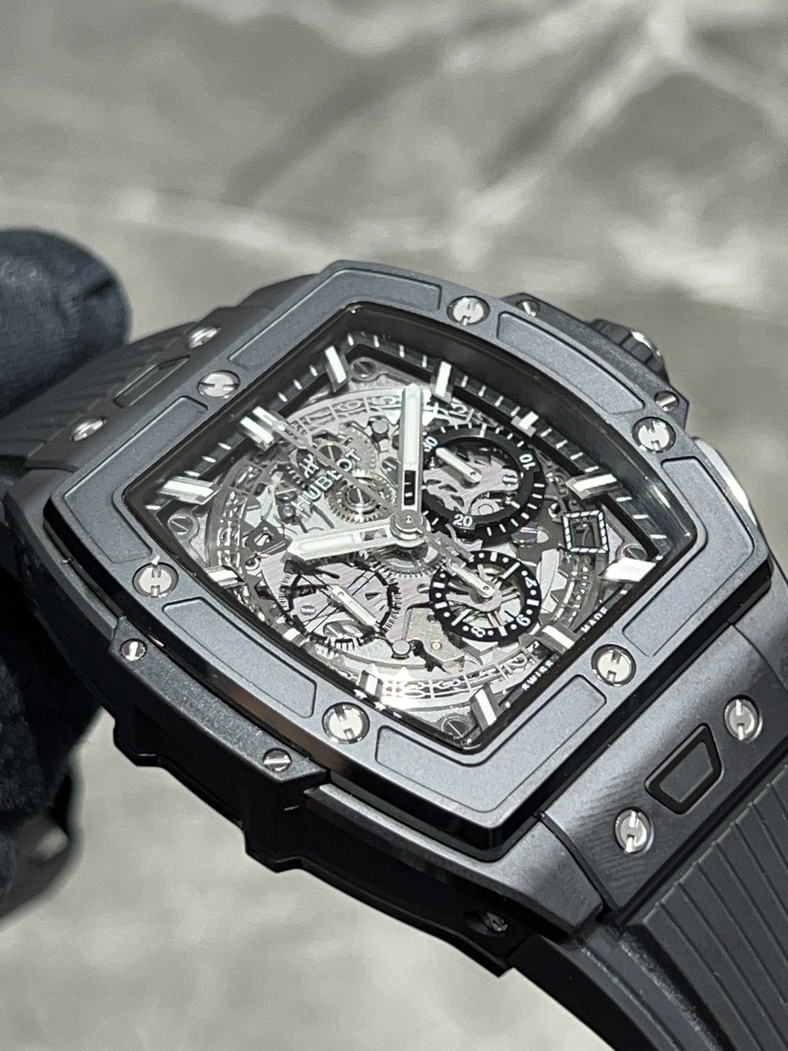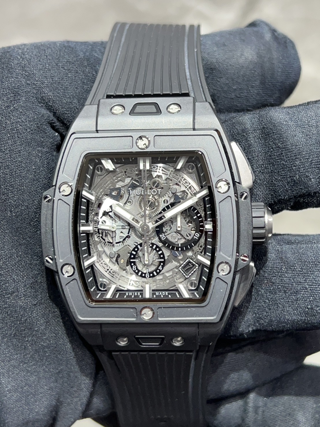ウブロを象徴するビッグ・バンの精神を、優雅なトノーケースに落とし込んだコレクション「スピリット・オブ・ビッグ・バン」今回はブラックとスケルトンの組み合わせがカッコいいブラックマジックが入荷いたしました。
