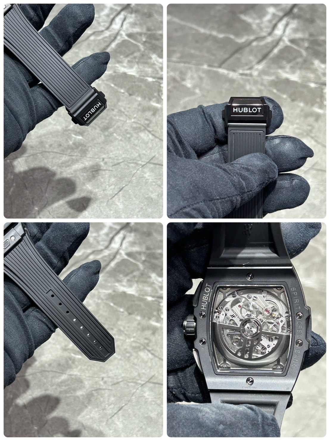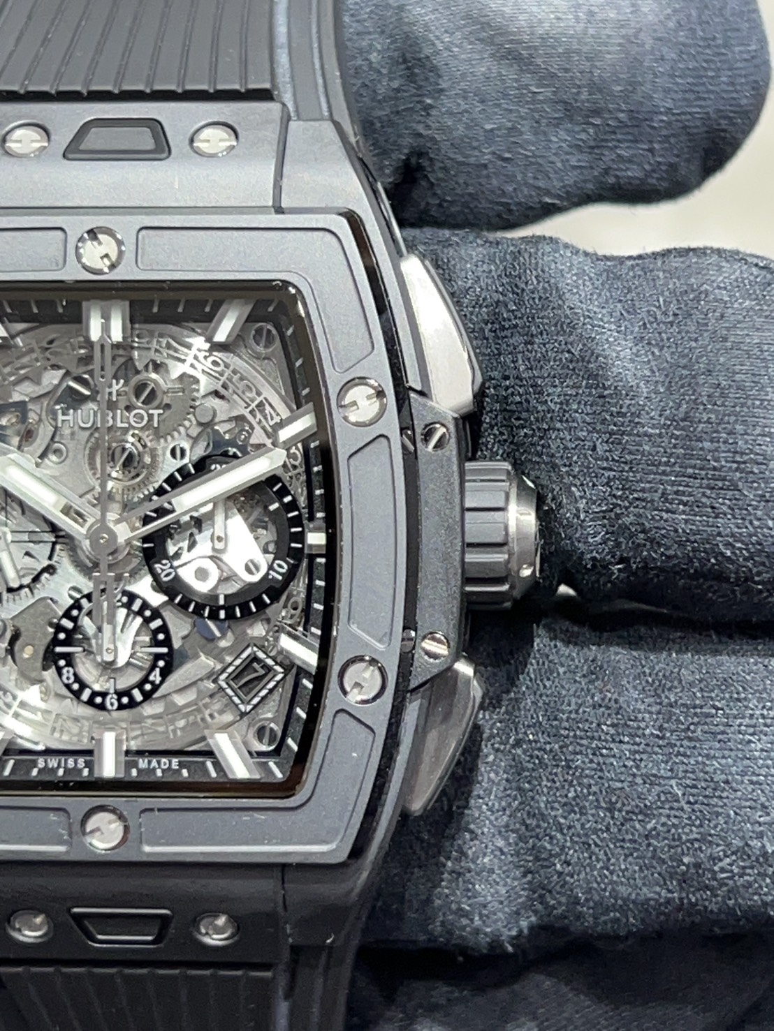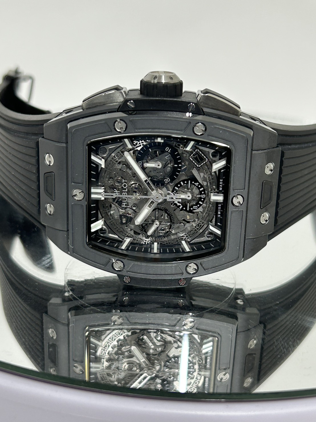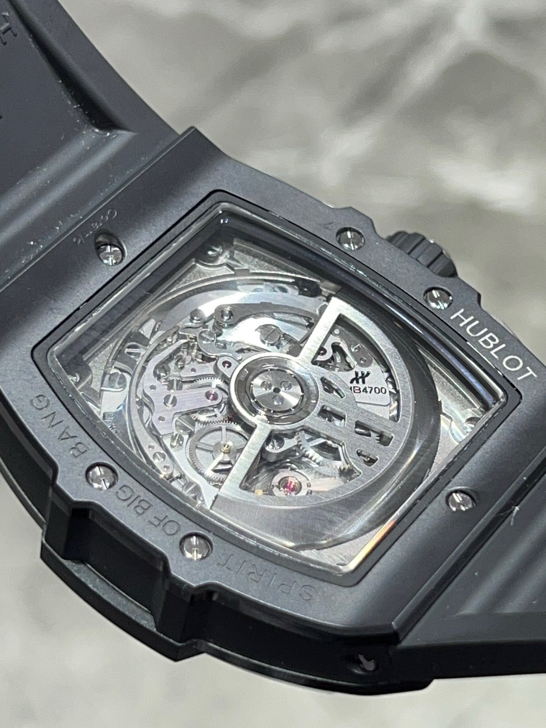 文字盤はスケルトンになりブラックセラミックケースとの相性は抜群で、ムーブメントはゼニスとコラボして製作されたエル・プリメロをベースとした「HUB4700」を搭載しており、表面からも楽しむ事ができます。